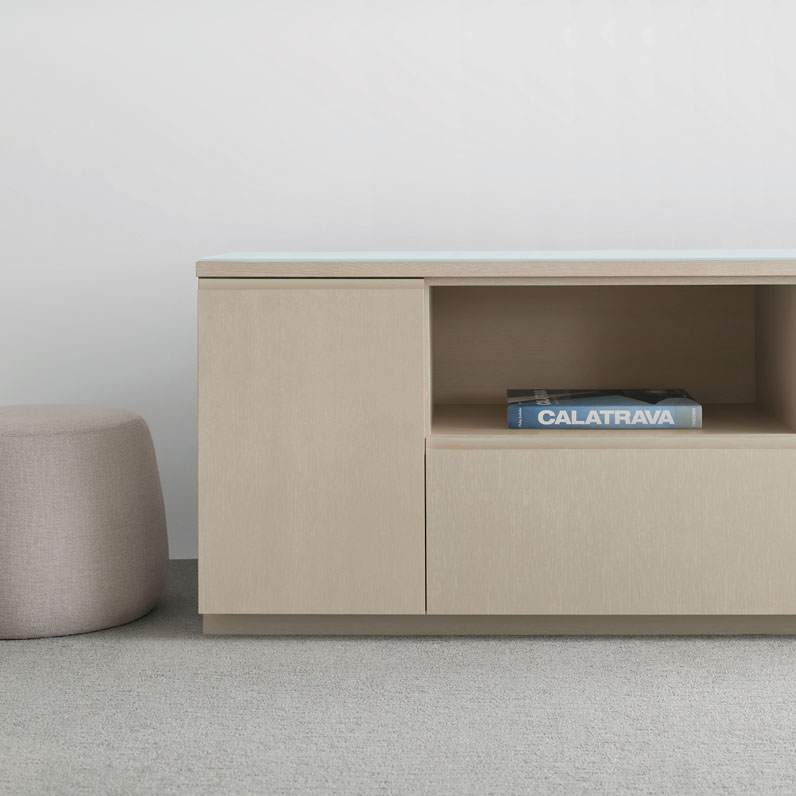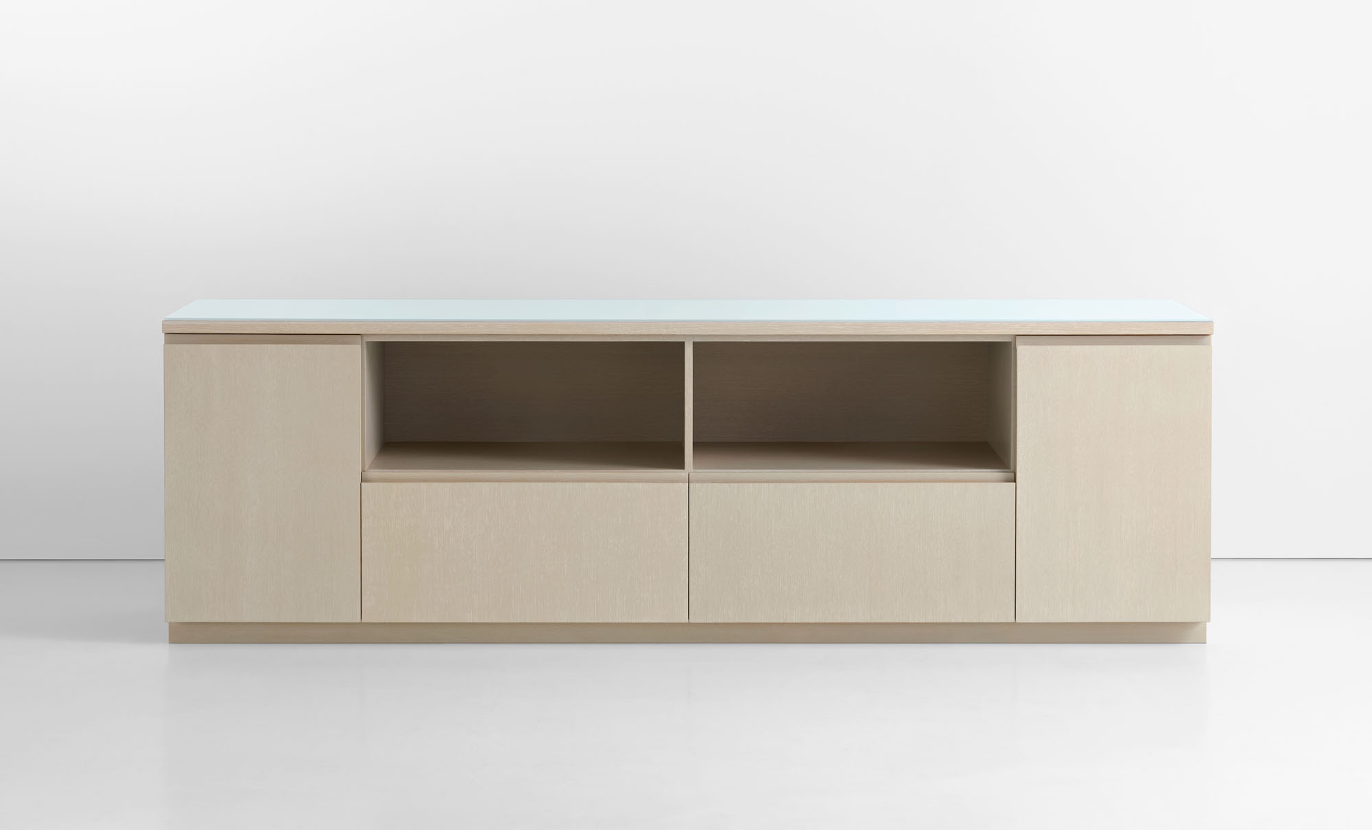 A.K.A. credenzas range from 48″ to 108″ in length and are offered in standard or serving height. Tops are featured in veneer, back-painted glass, and solid surface.
