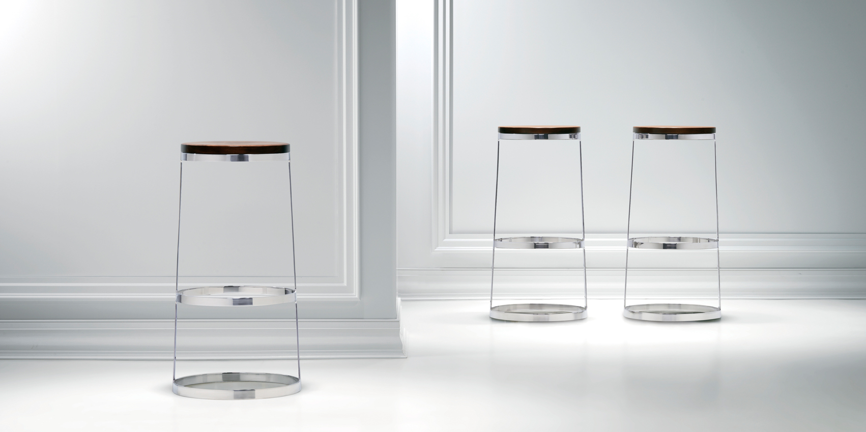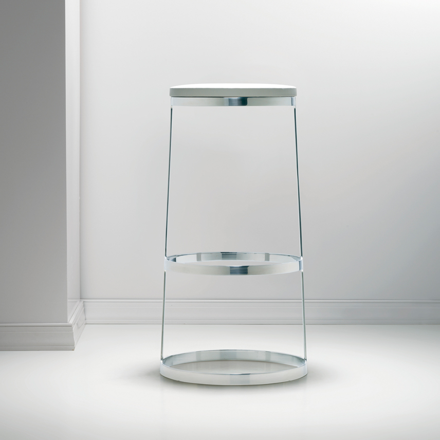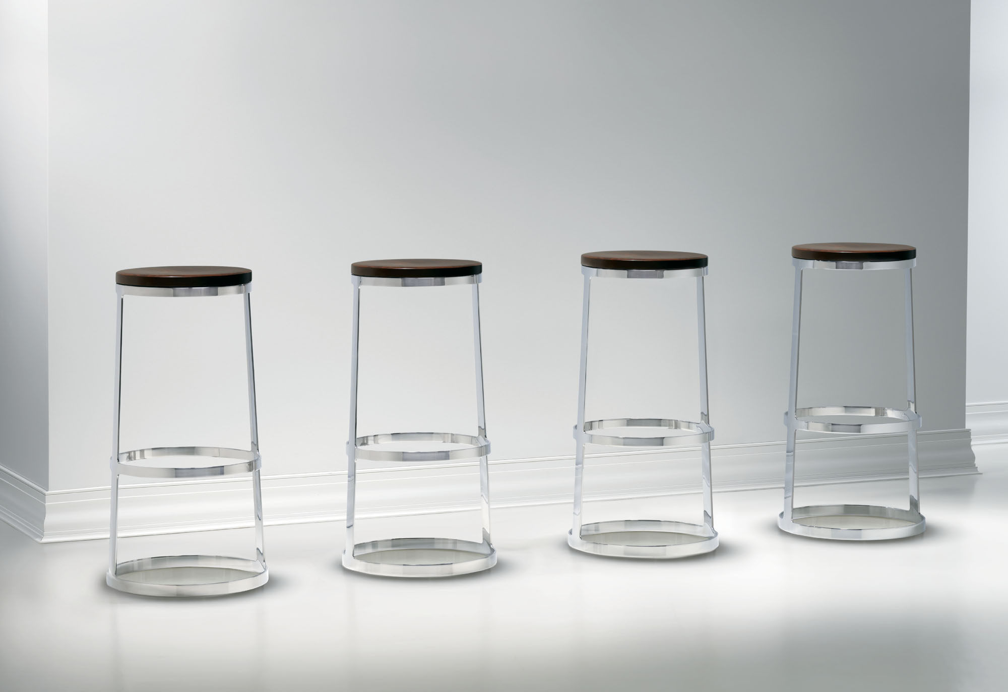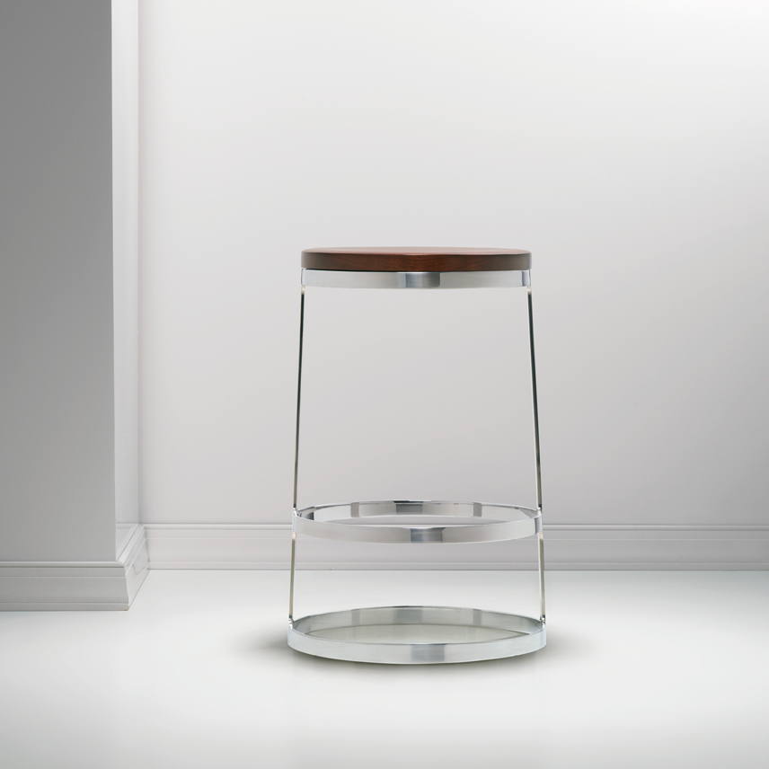 A minimalist icon and engineering marvel, the Aro stool is sophisticatedly simple in form and materials. The solid wood seat with hidden swivel is perched atop an almost impossibly slender base sculpted from a single piece of polished stainless steel. With a choice of seat and height options, the Aro stool stands out at any bar or table.