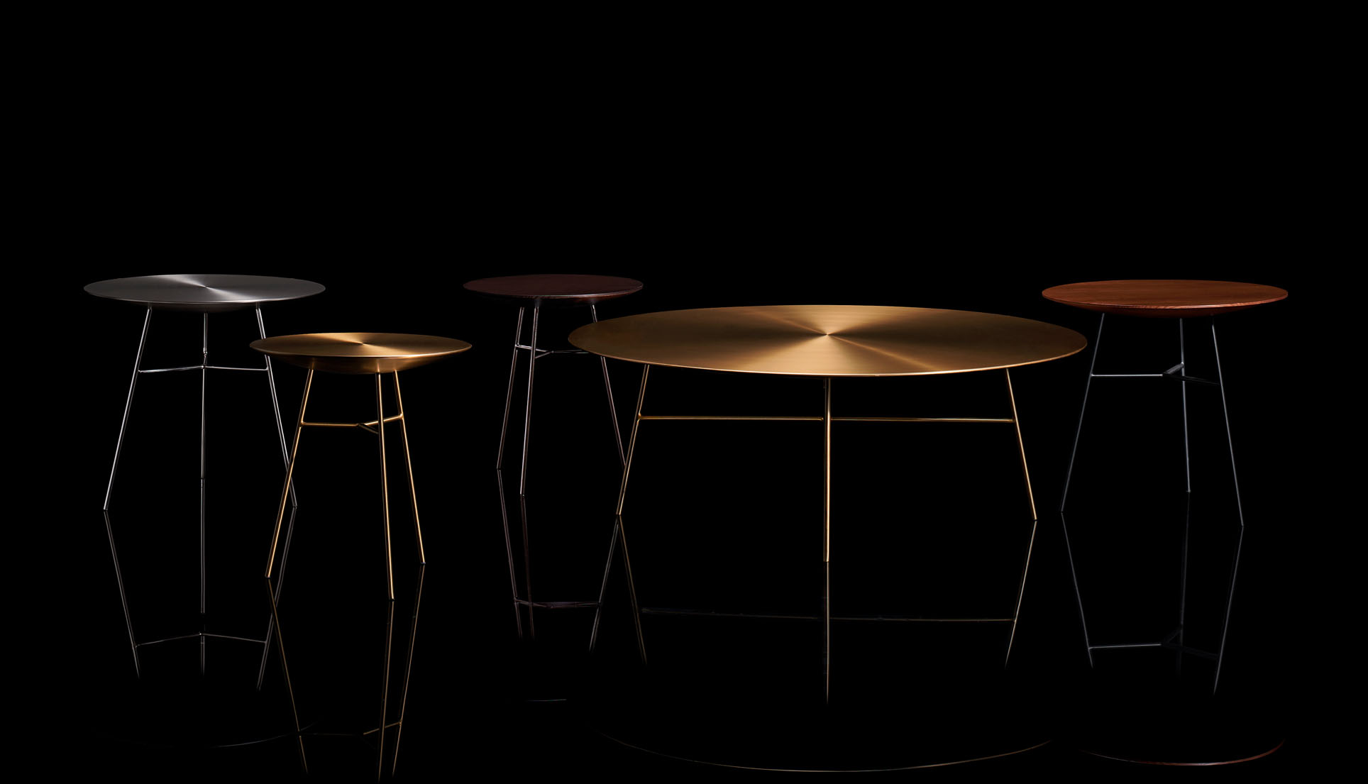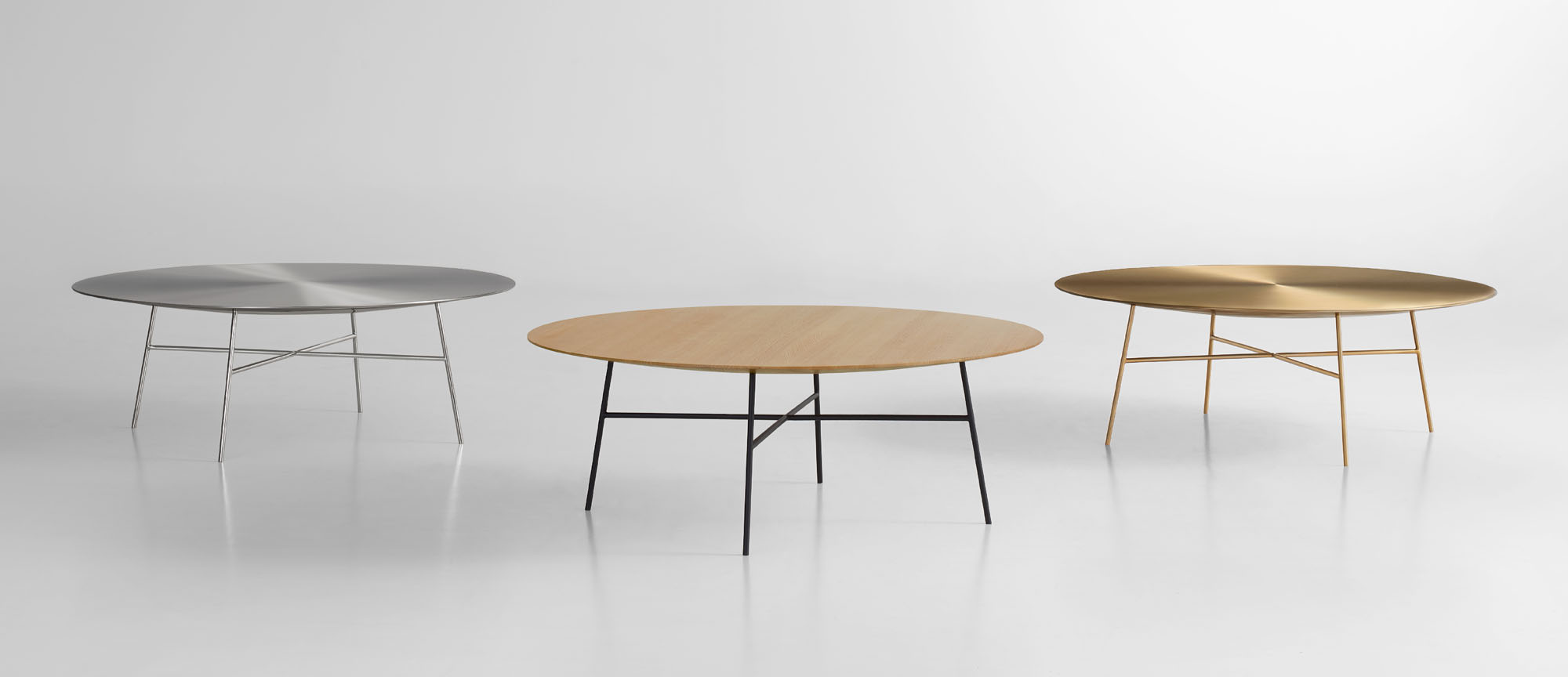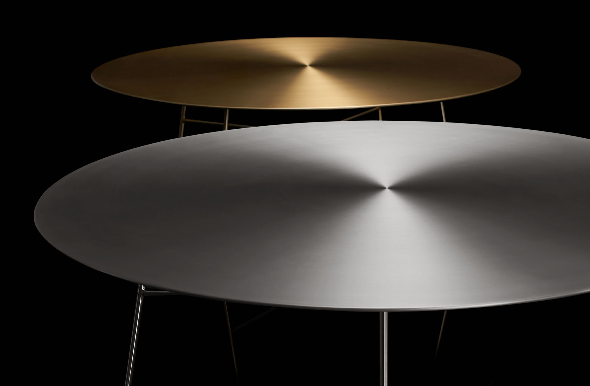 Bassa table tops feature solid ash, spun stainless steel brushed with a low sheen clear coat, or brushed brass with a PVD finish.