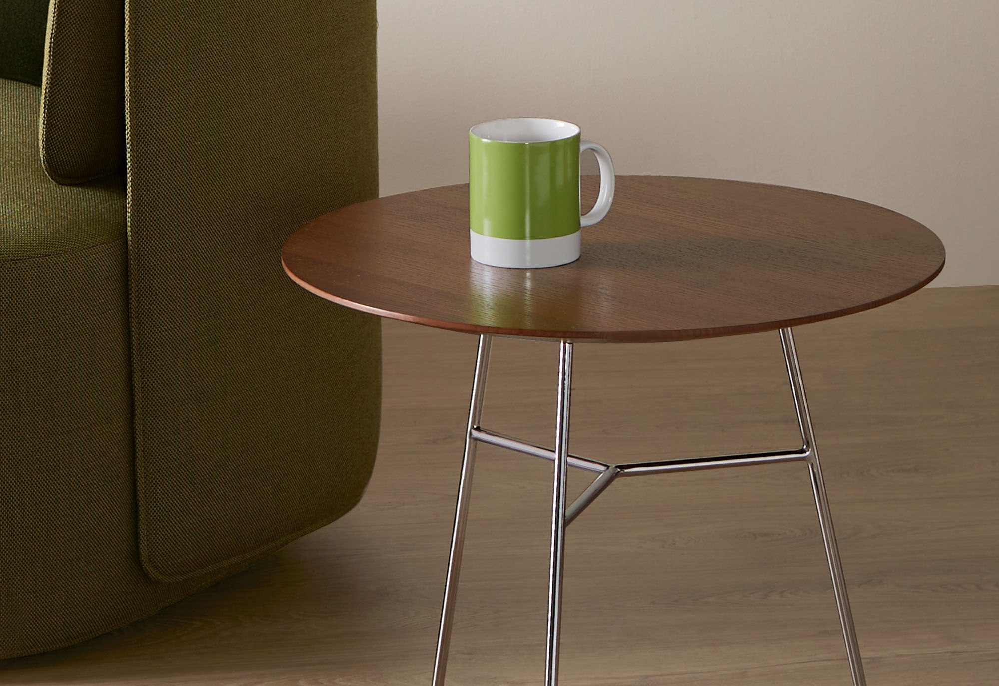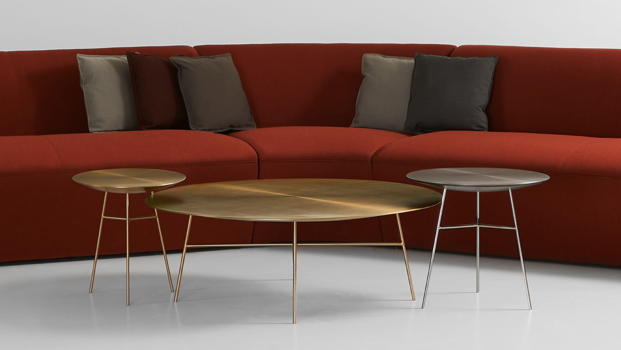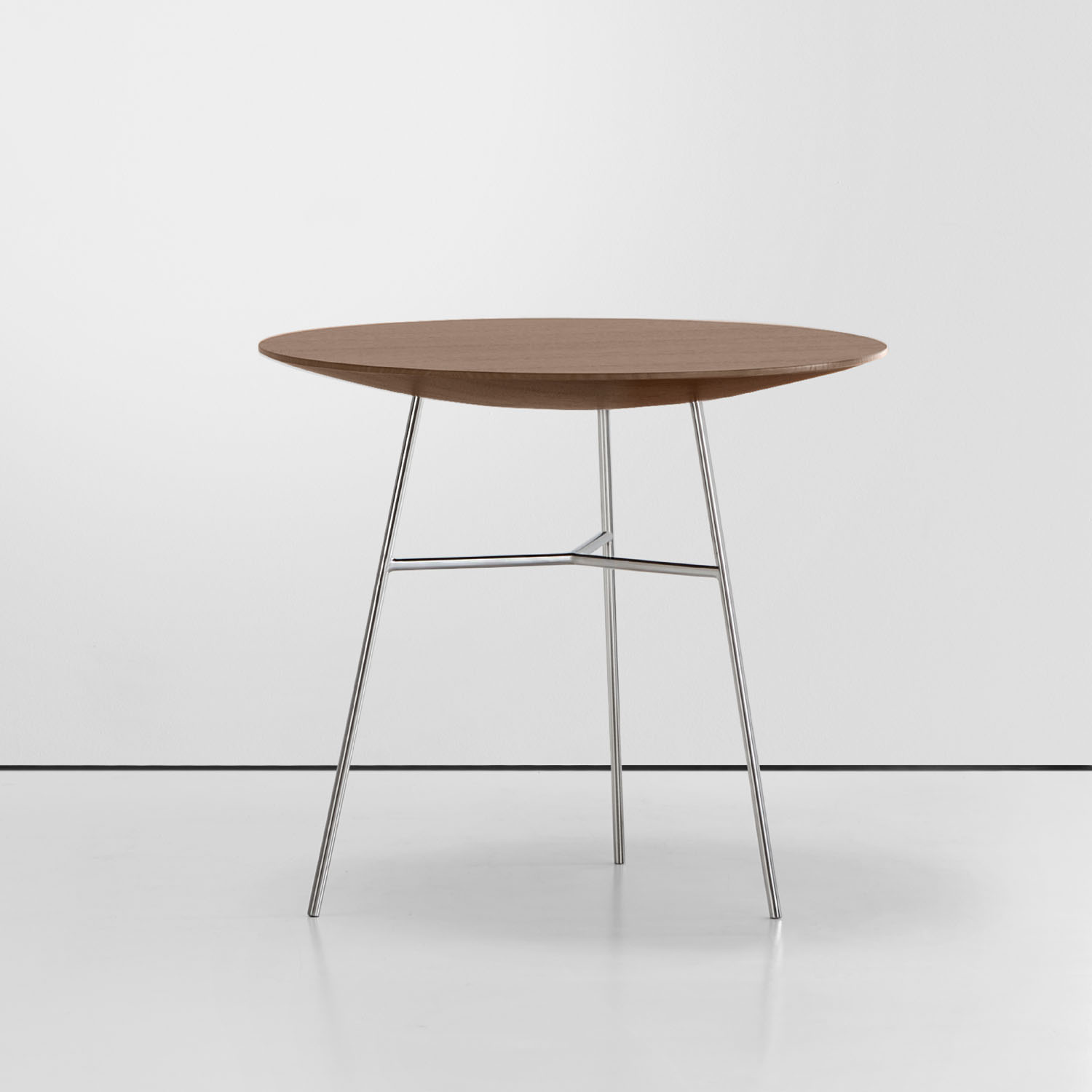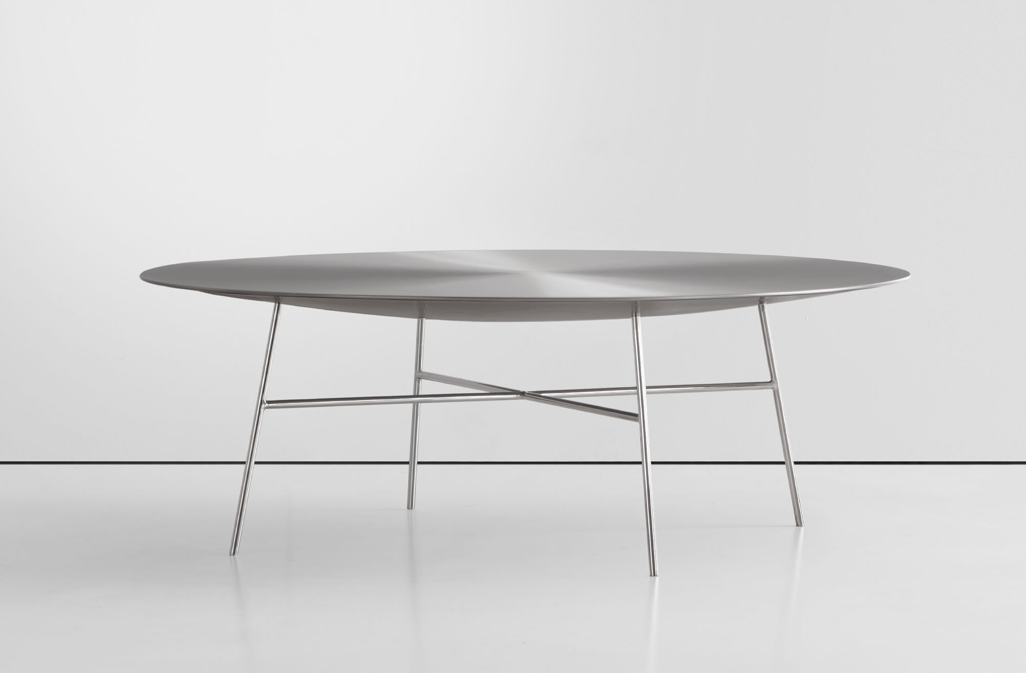 Bassa table tops feature solid ash, spun stainless steel brushed with a low sheen clear coat, or brushed brass with a PVD finish.