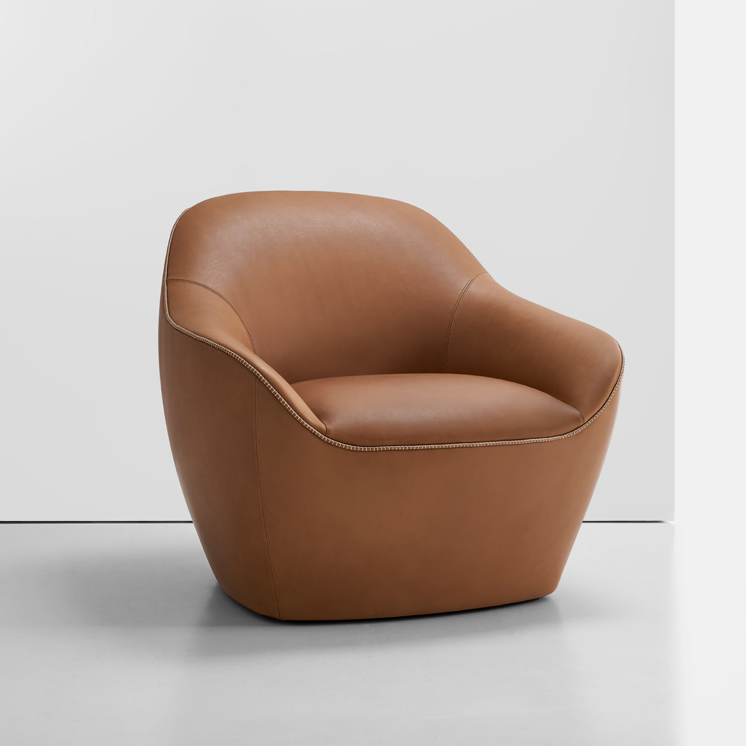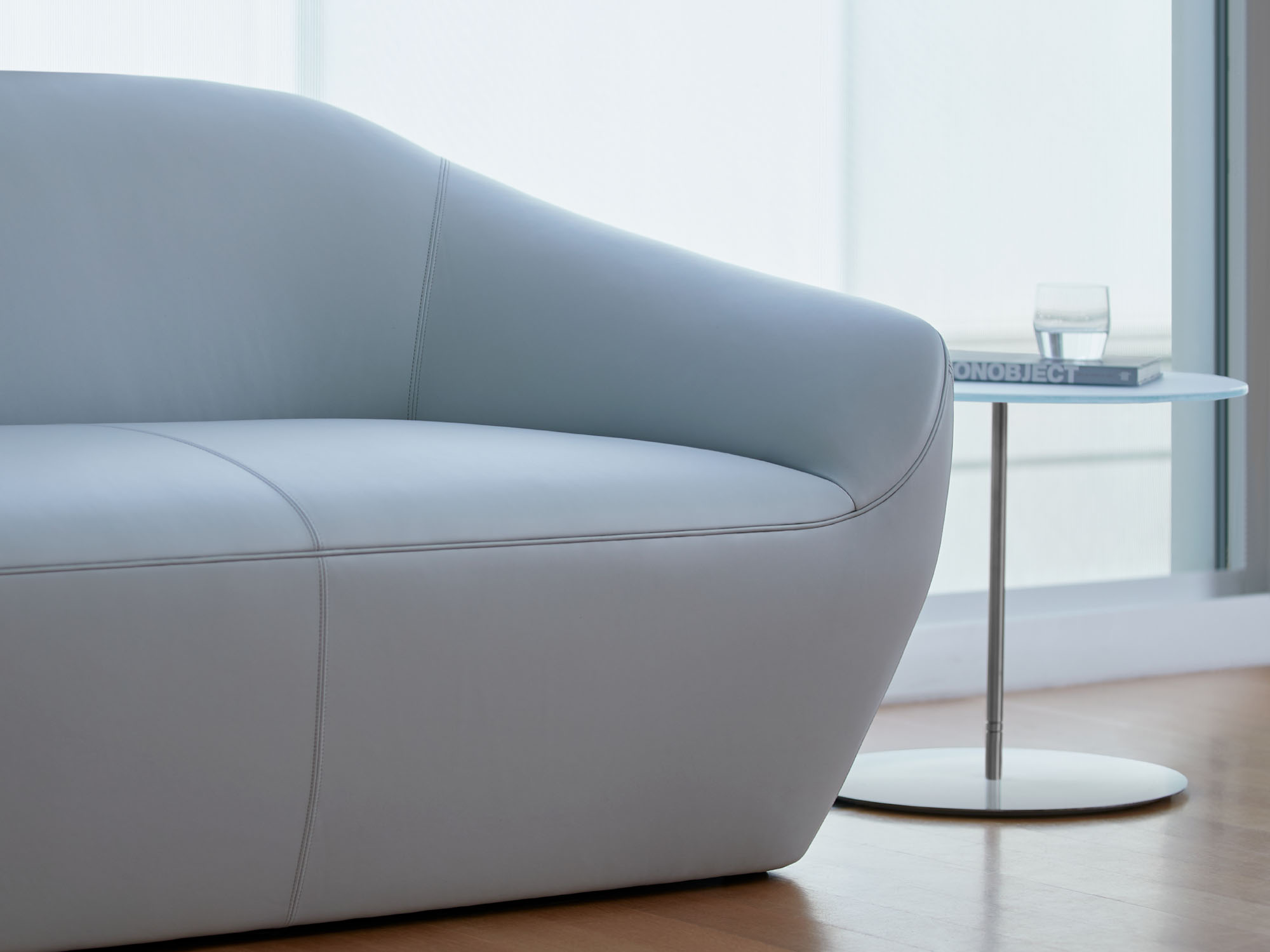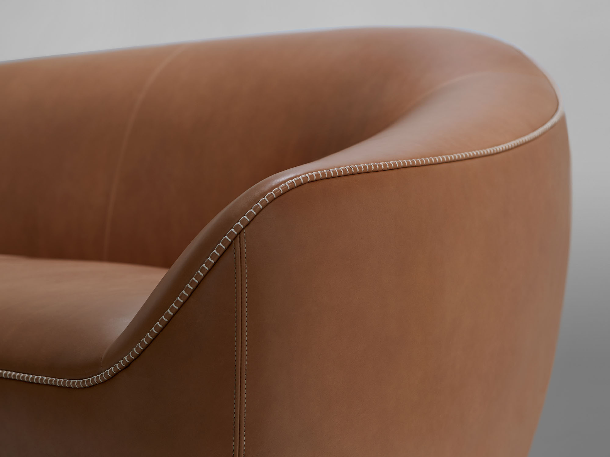 Graceful and elegant lines are accentuated by a continuous welt that traces the perimeter with saddle stitch seams on the interior and exterior.
