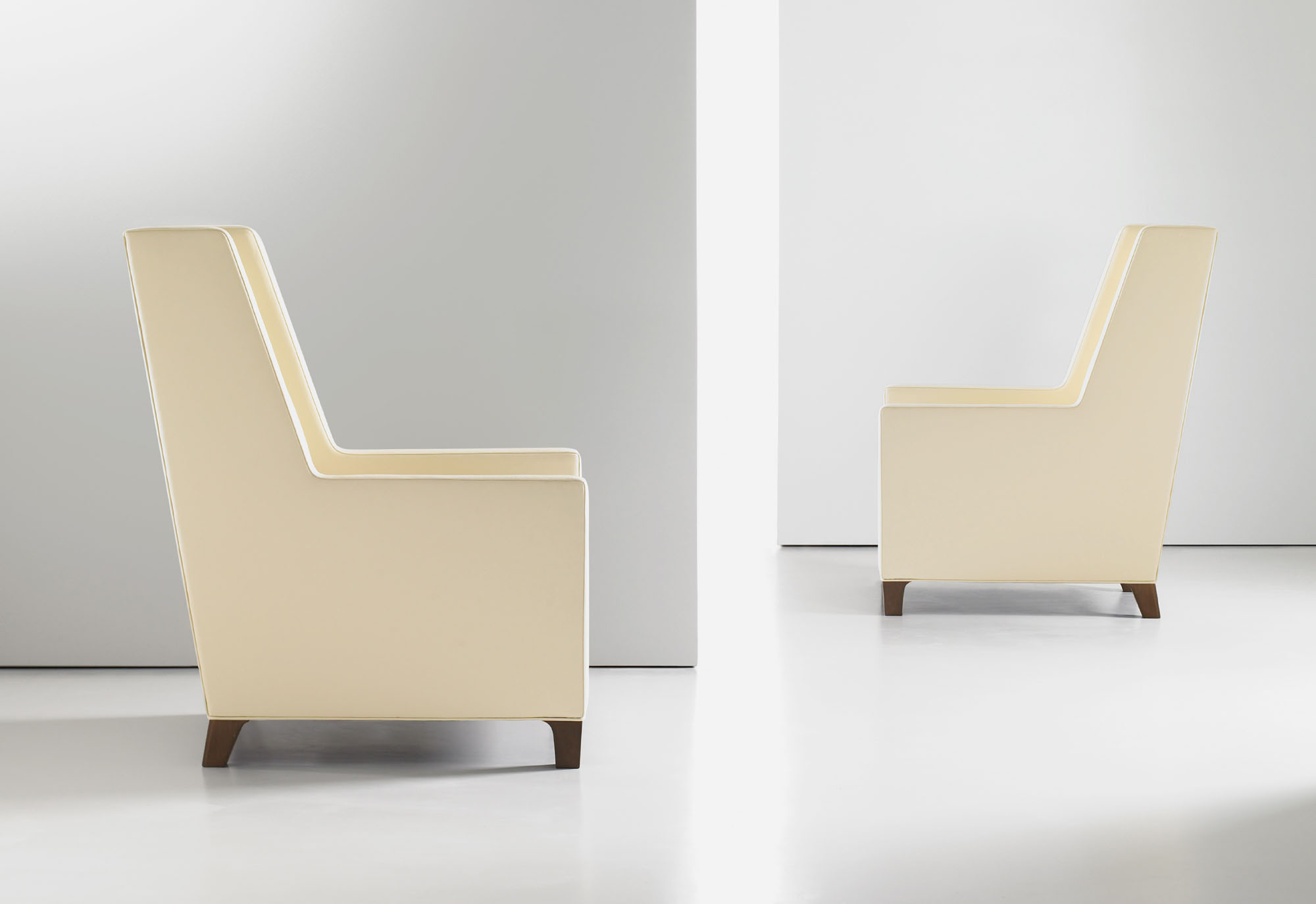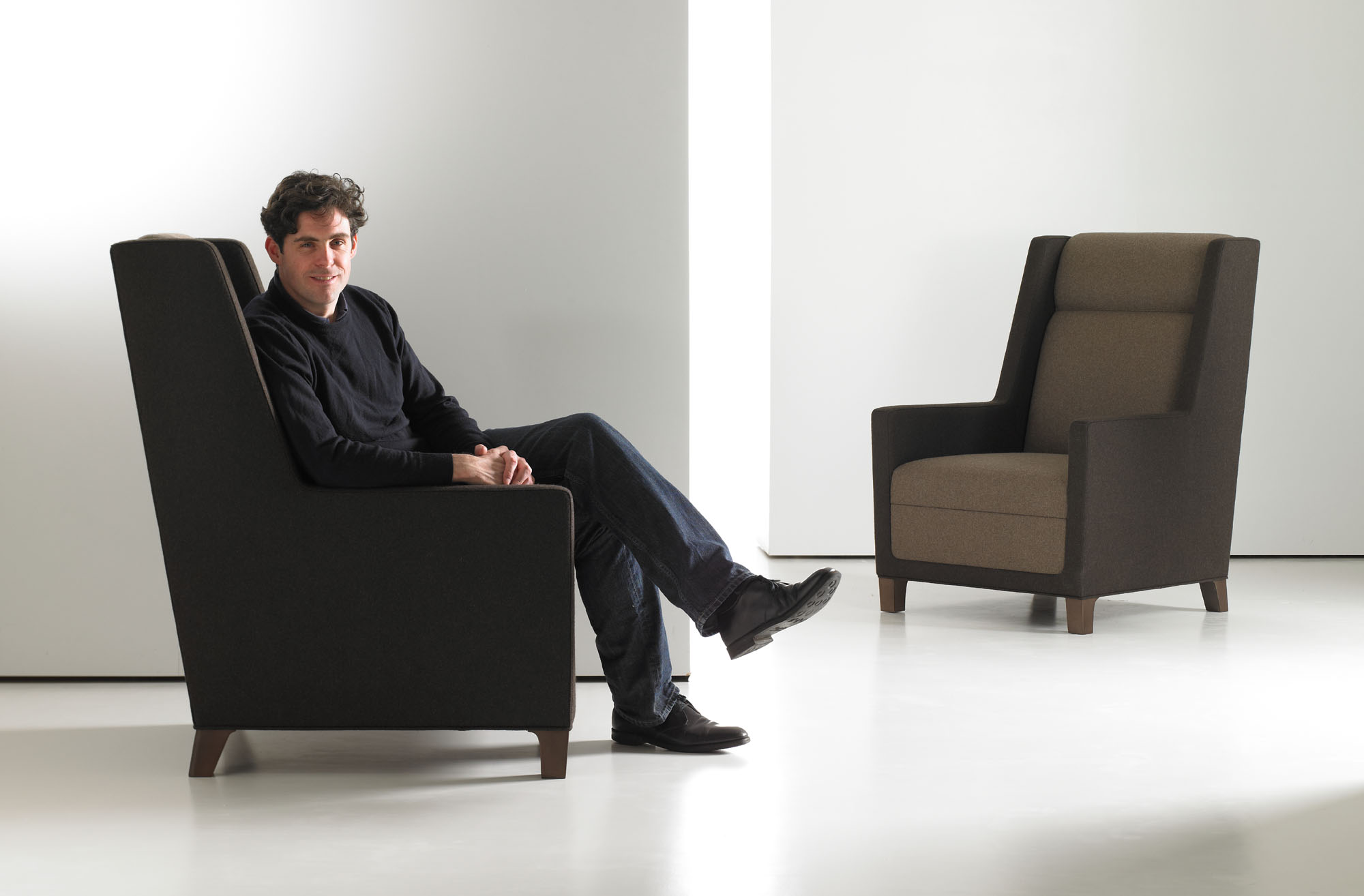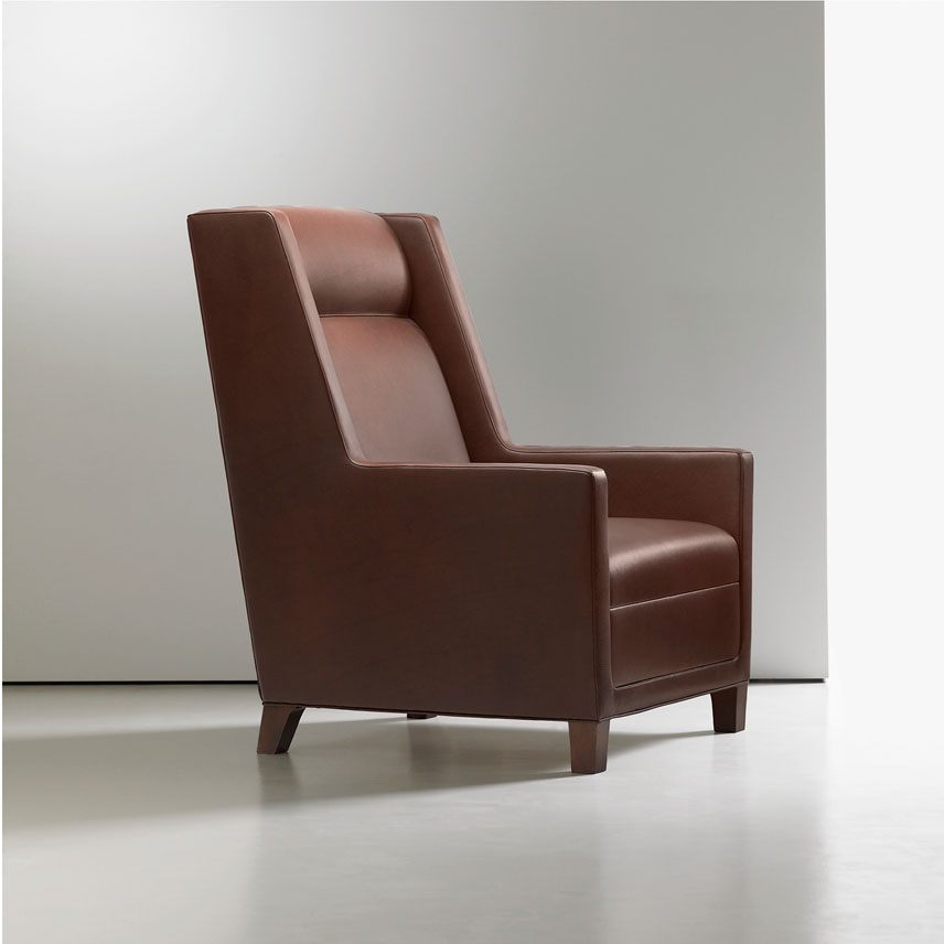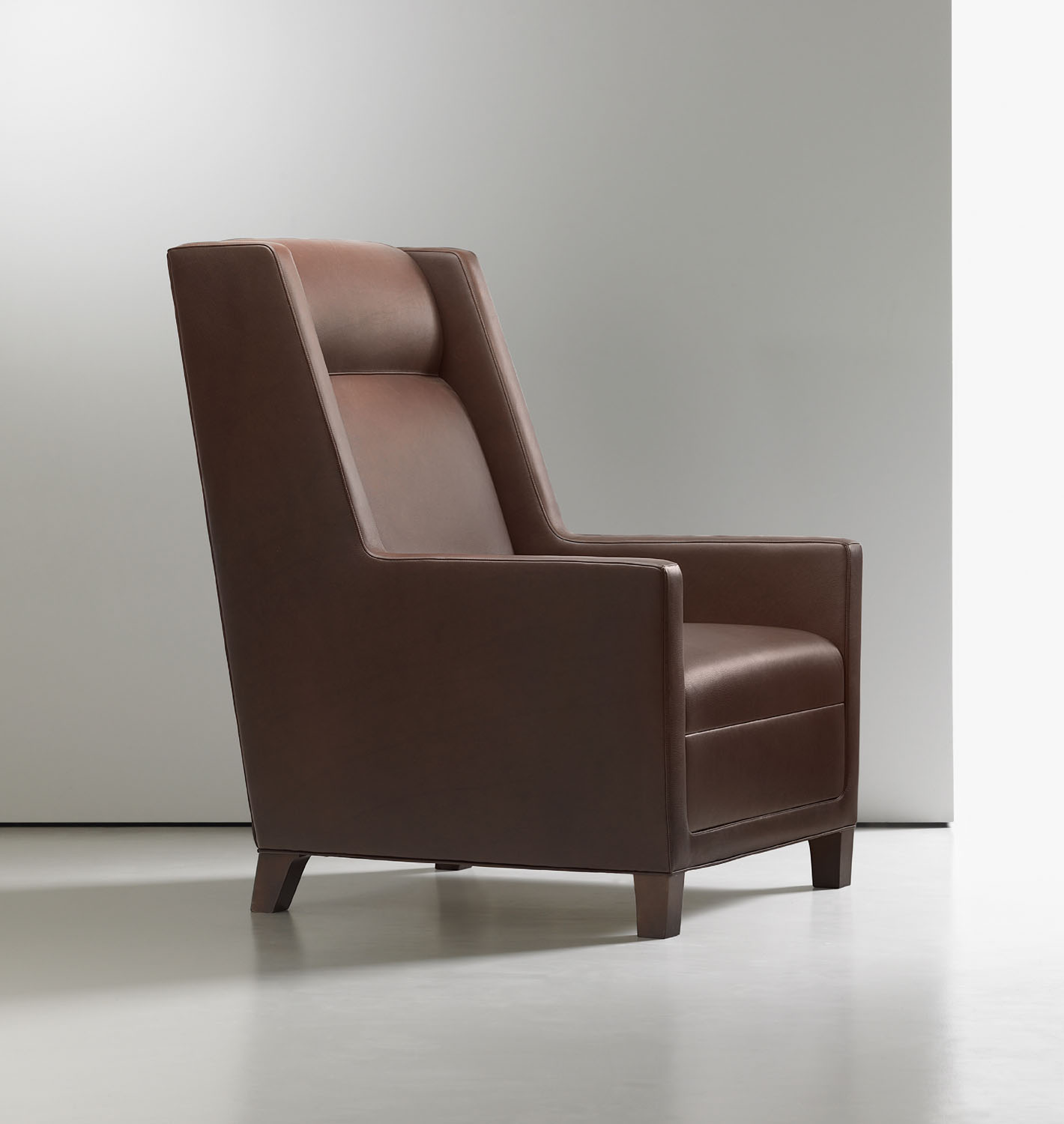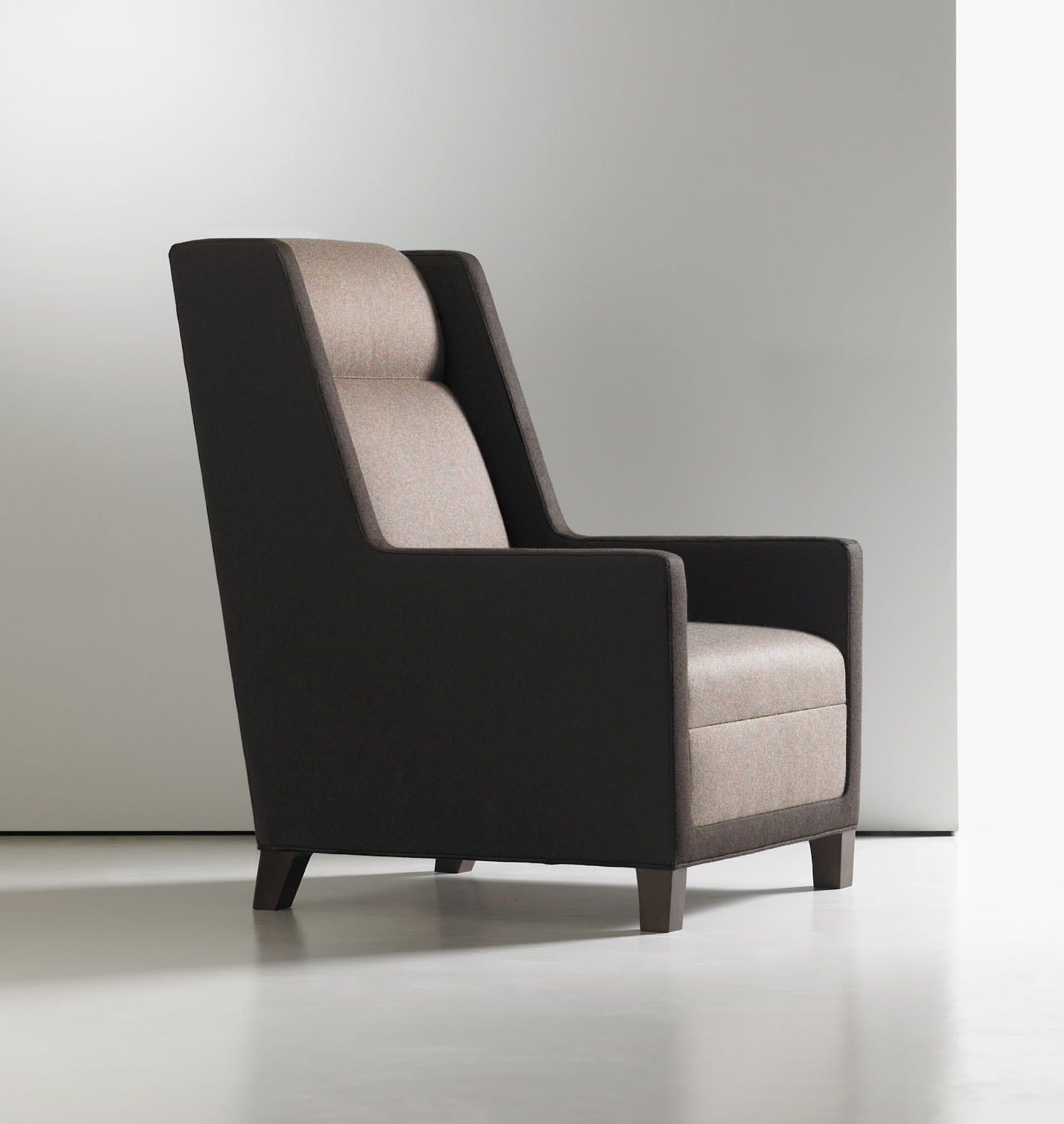 Blaine.02 has a transitional aesthetic that references the modern wingback chair. This timeless but slightly modernized lounge presents a high profile with abbreviated side panels, allowing the user to feel cozy without confinement.