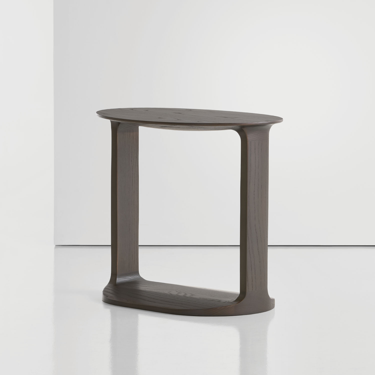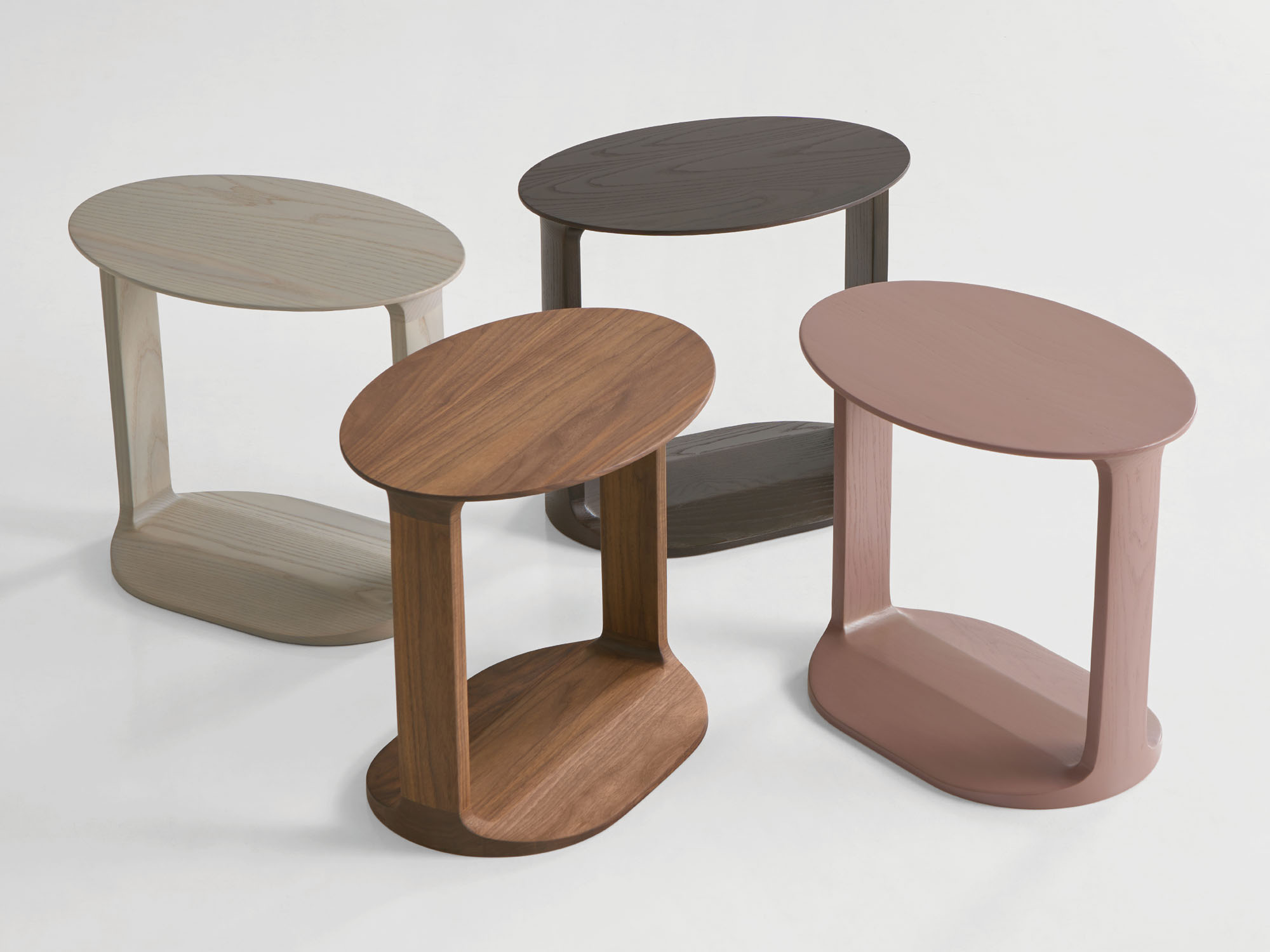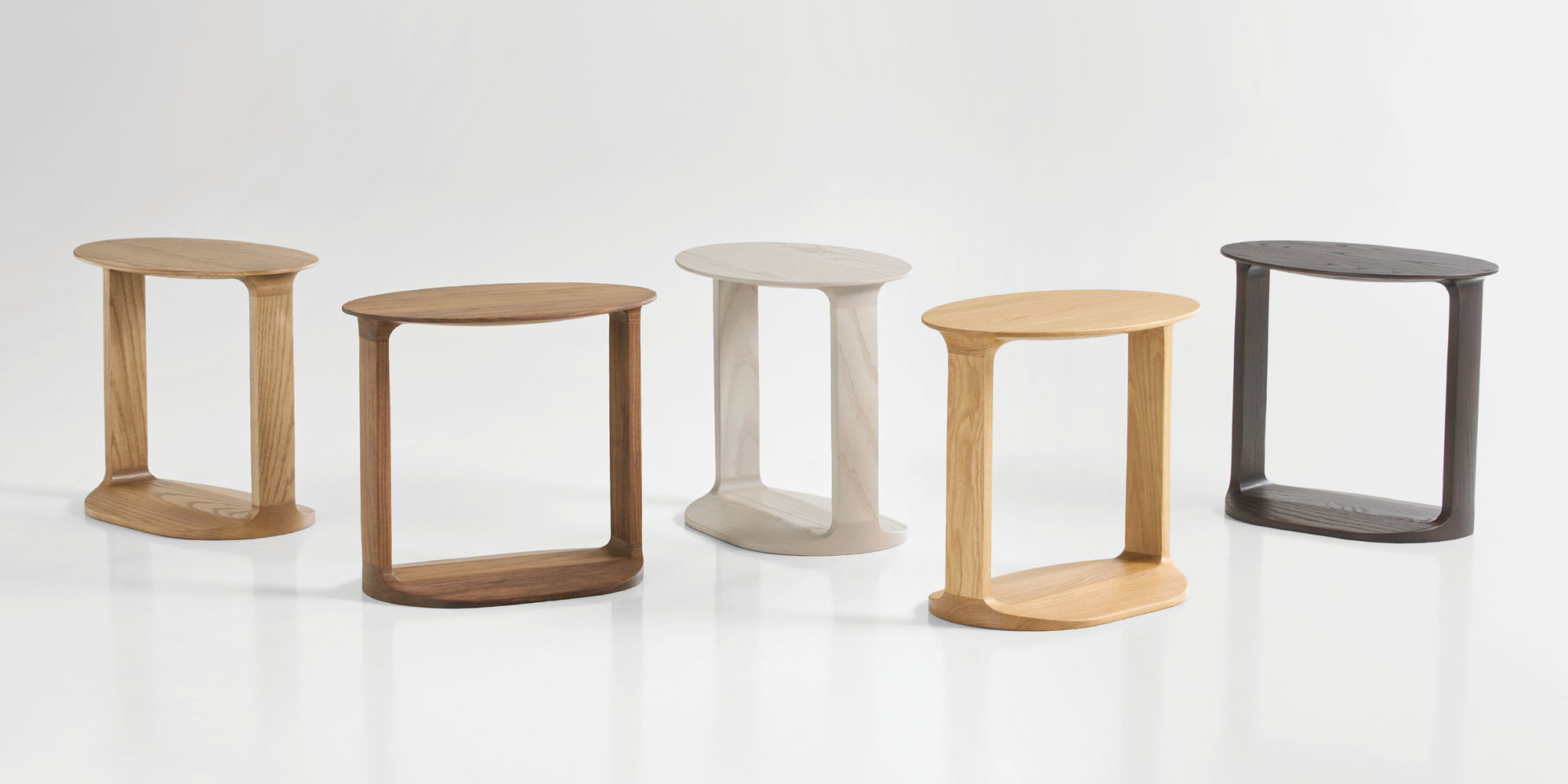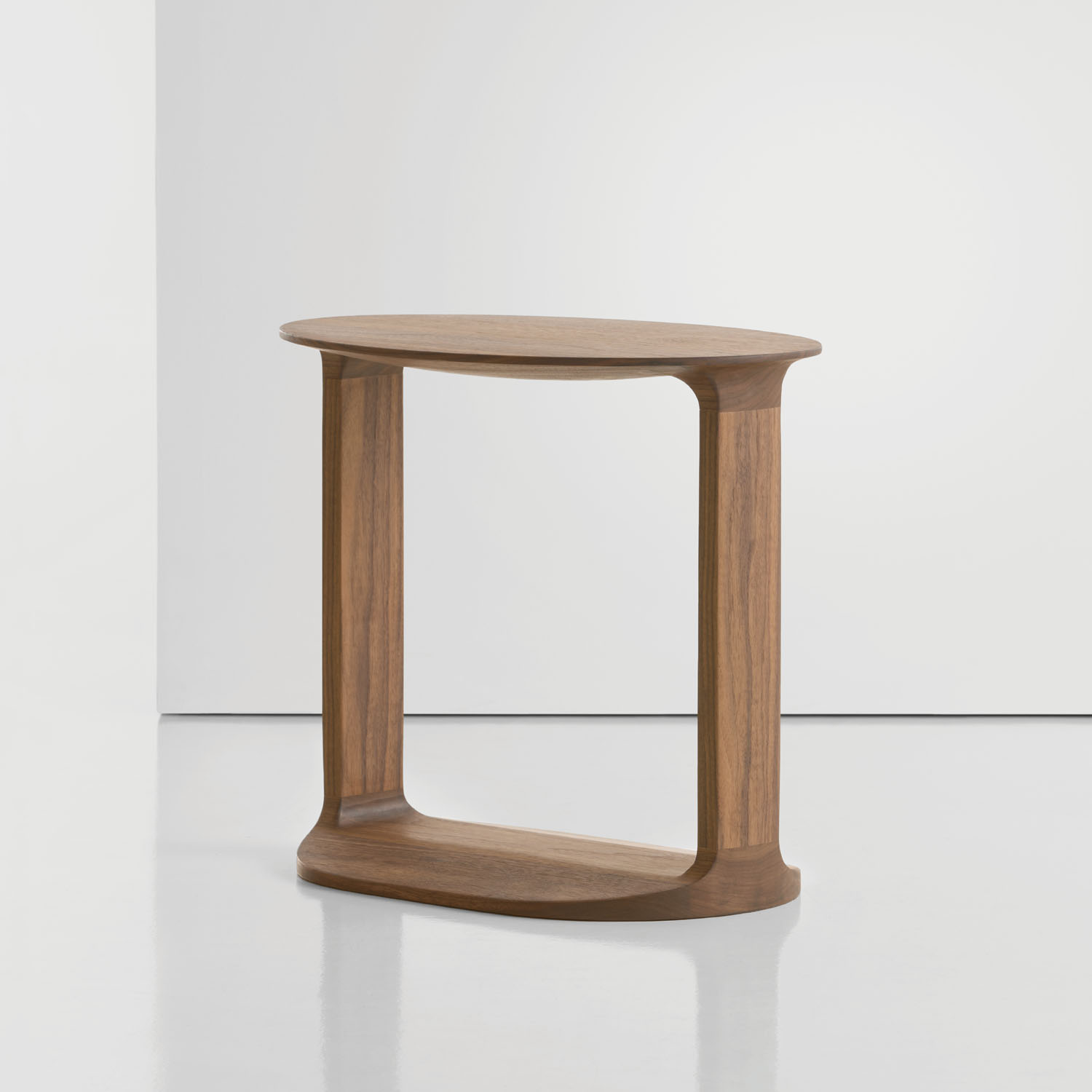 An oval shaped wood table, Border is made of solid American walnut or oak in various natural and select finishes.