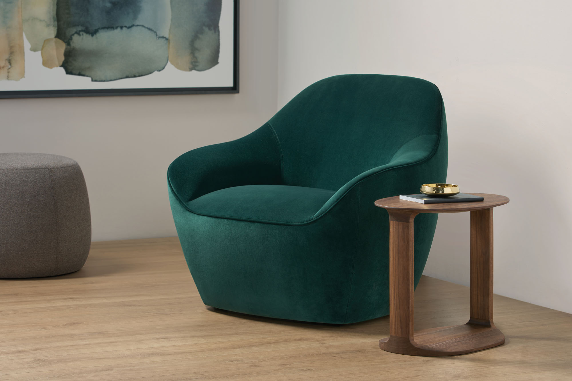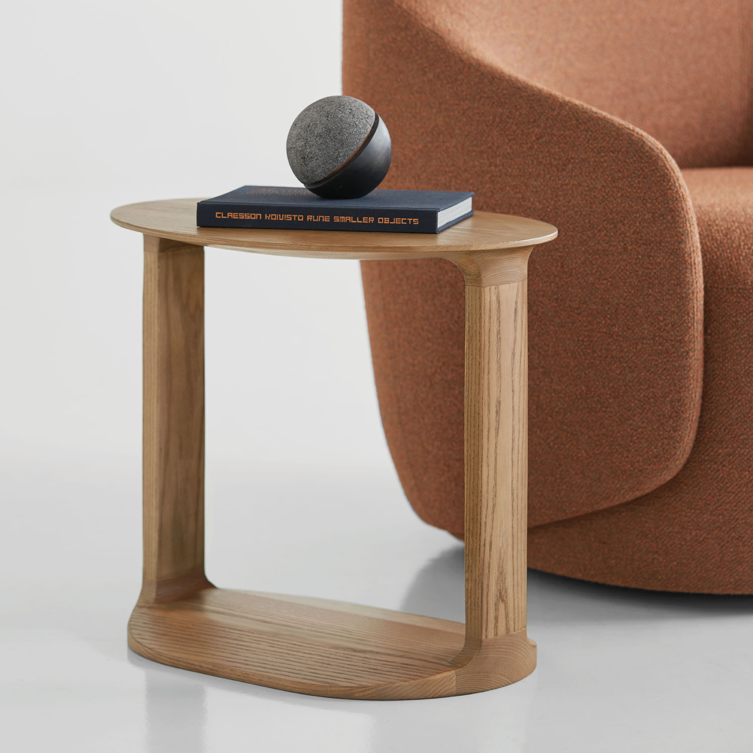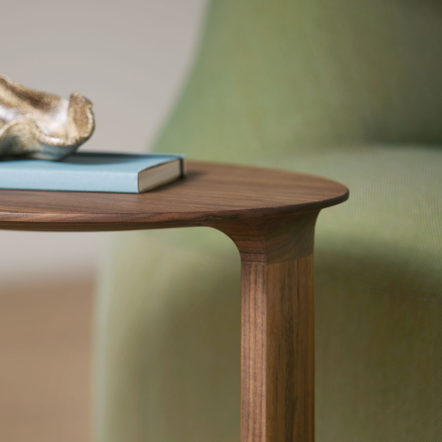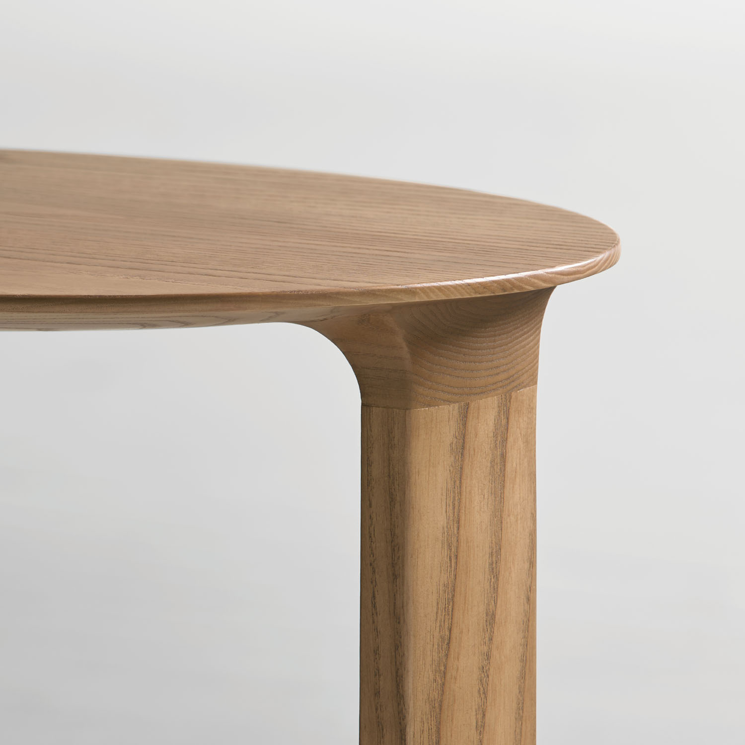 An oval shaped wood table, Border is made of solid American walnut or oak in various natural and select finishes.