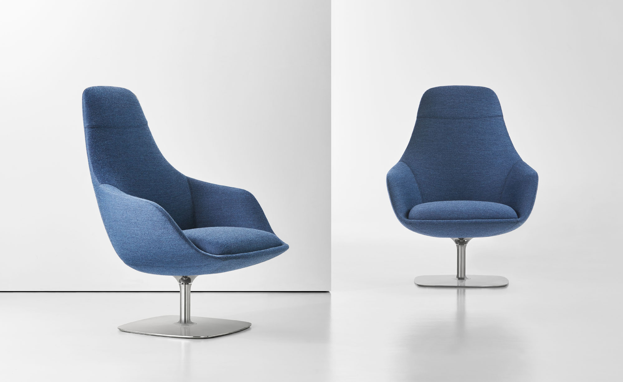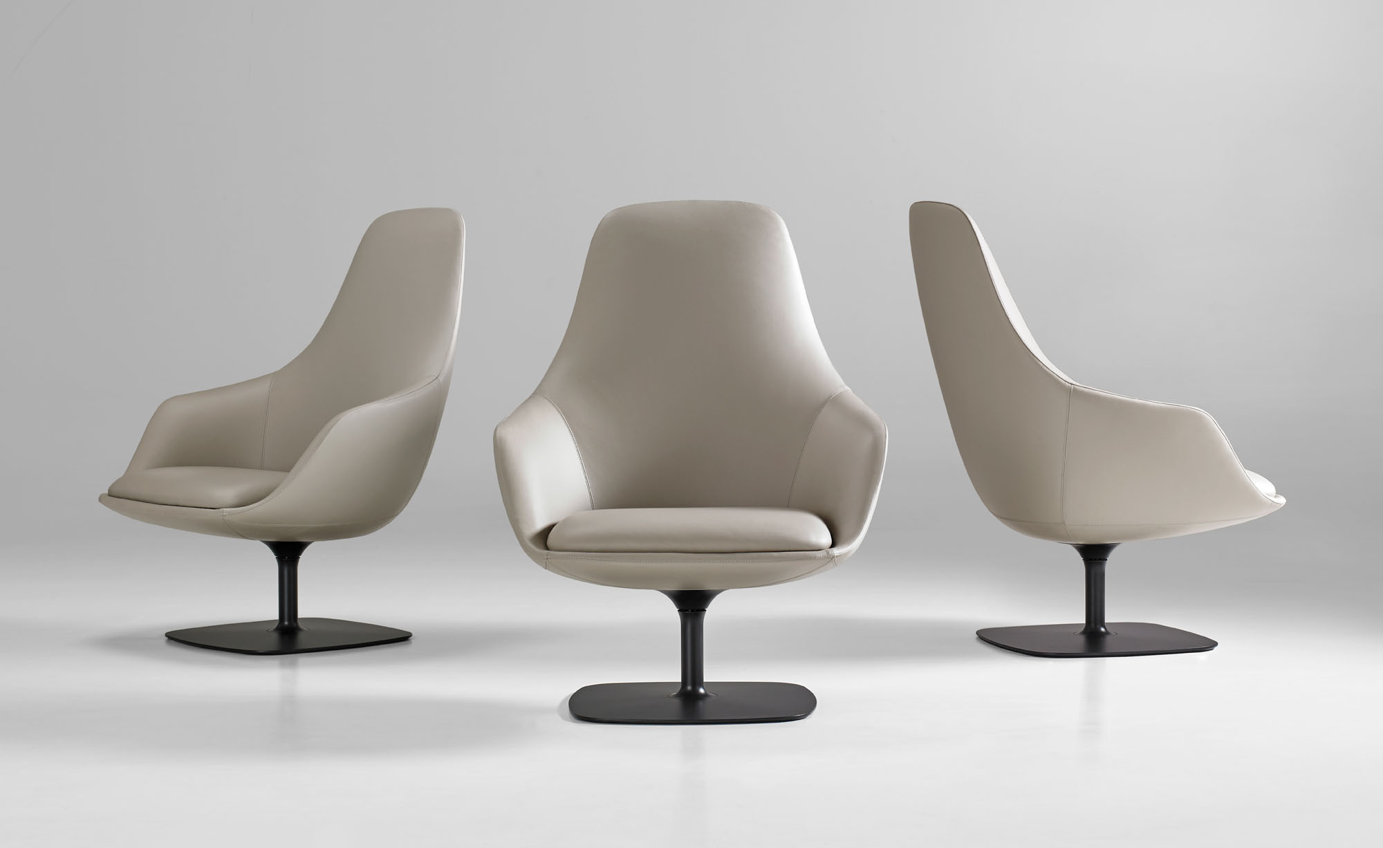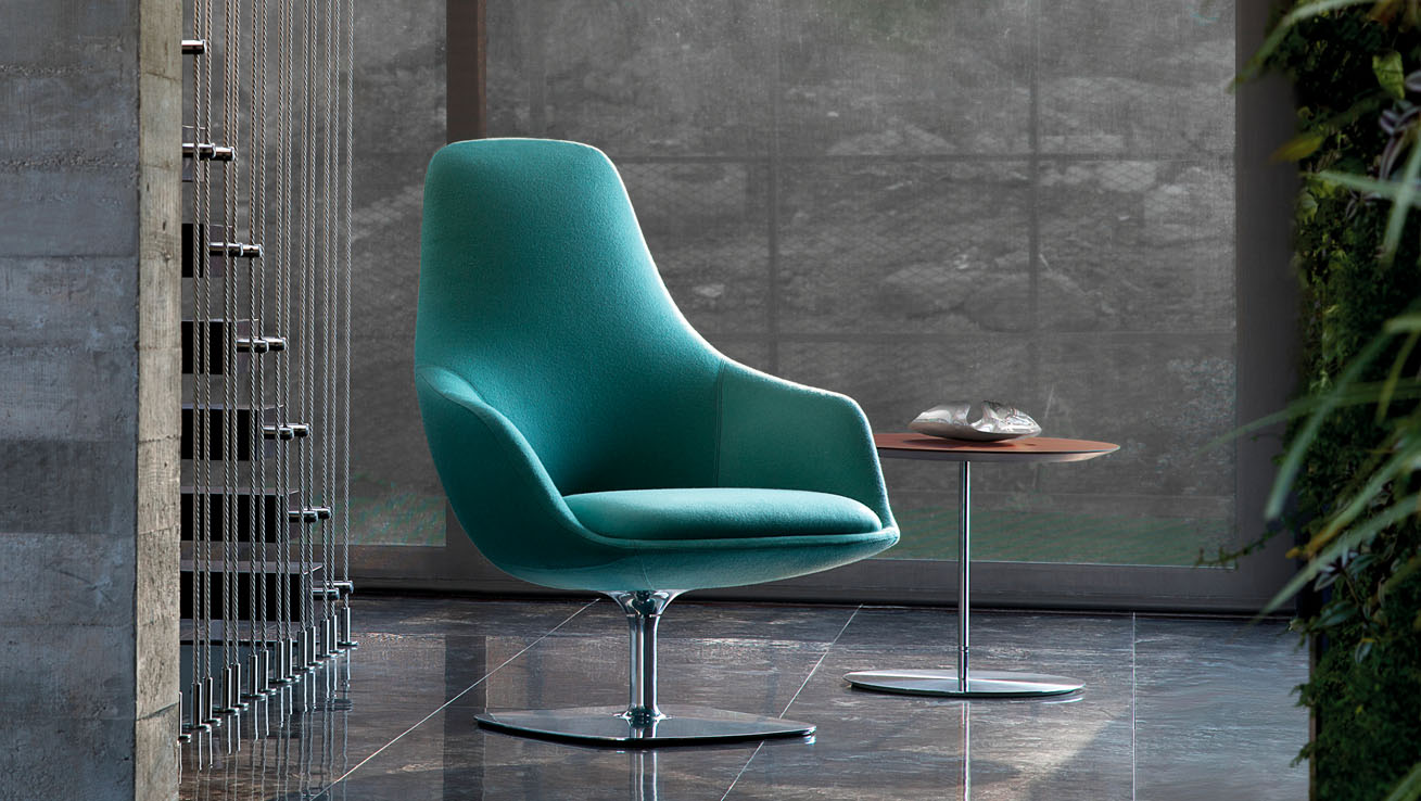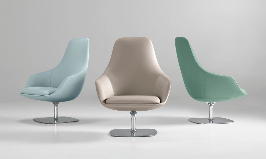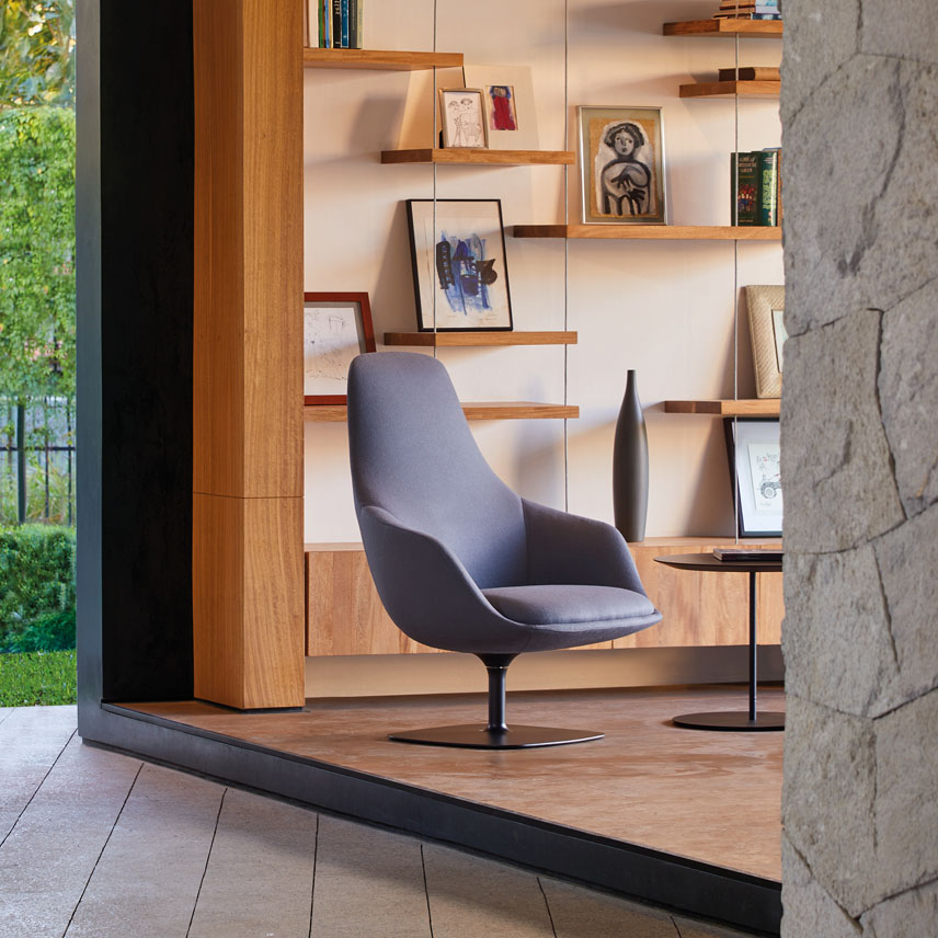 Canelle is offered with two base options: a sculptured cast-aluminum base with a self-returning swivel or a tailored wooden cross stretcher base. The metal base is available in polished aluminum or a powder-coated finish and the wooden base is crafted in solid American maple or walnut.