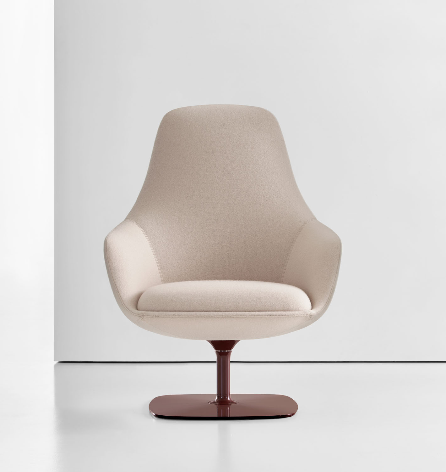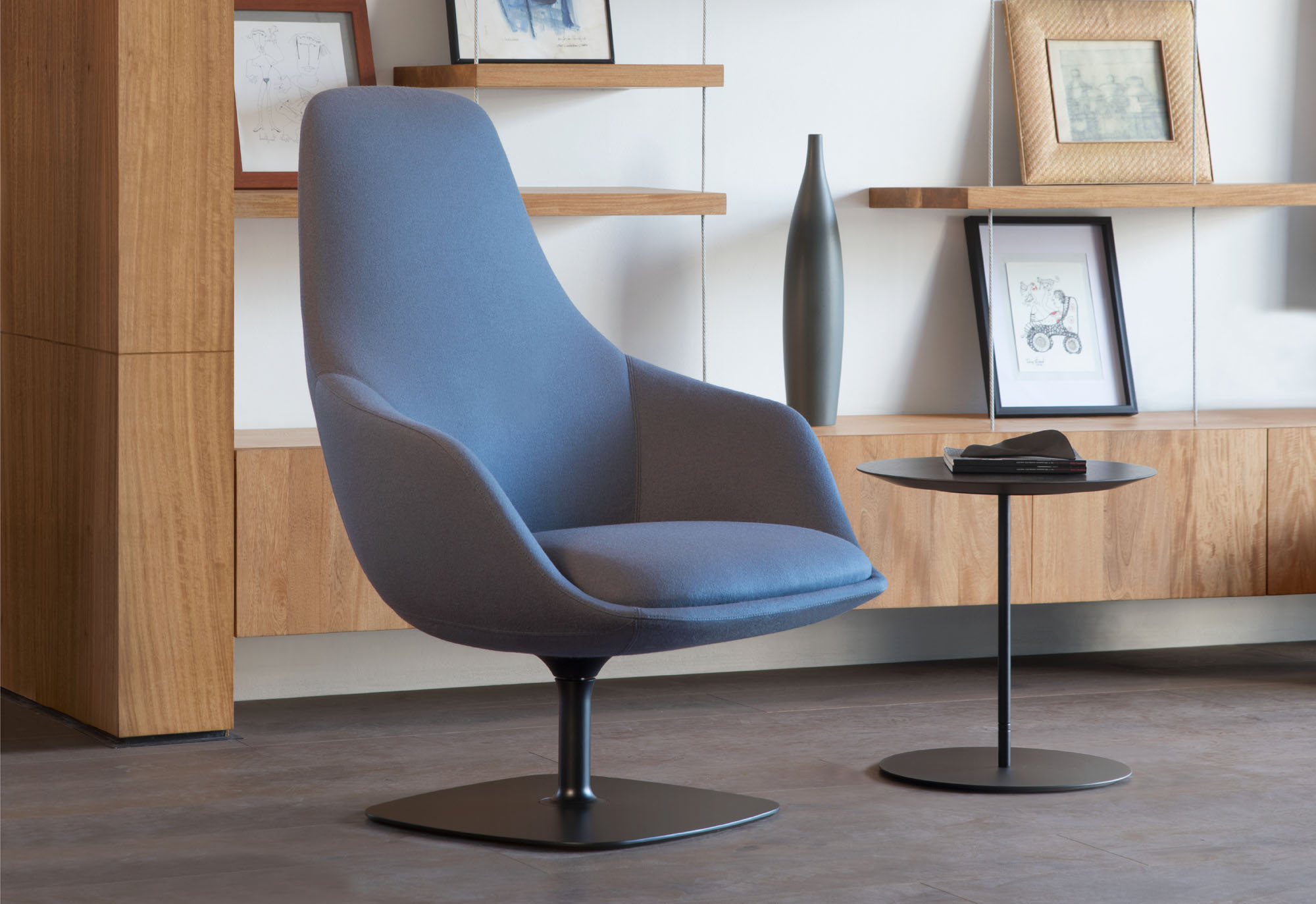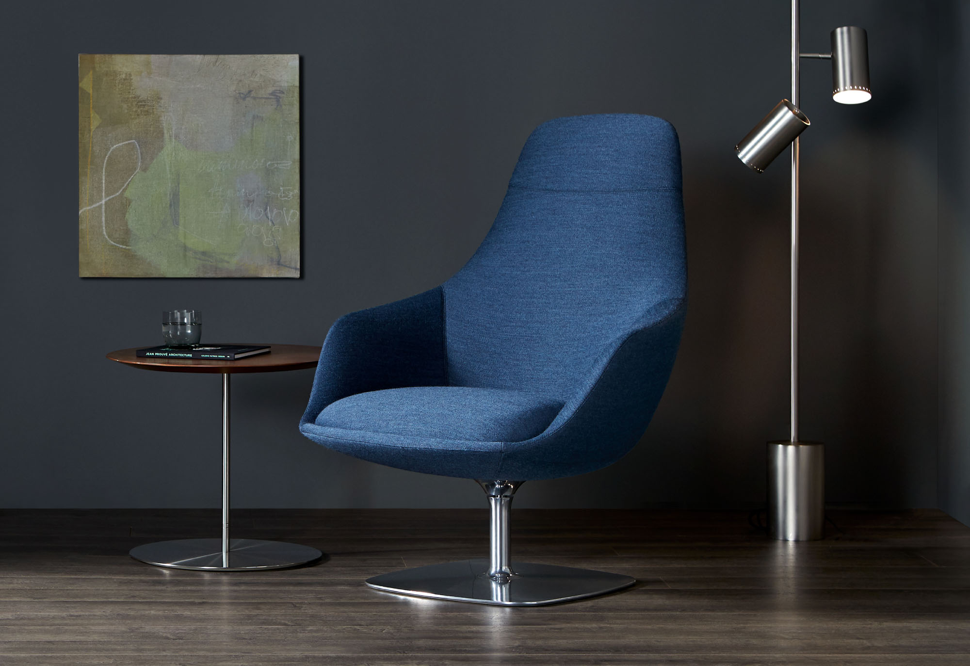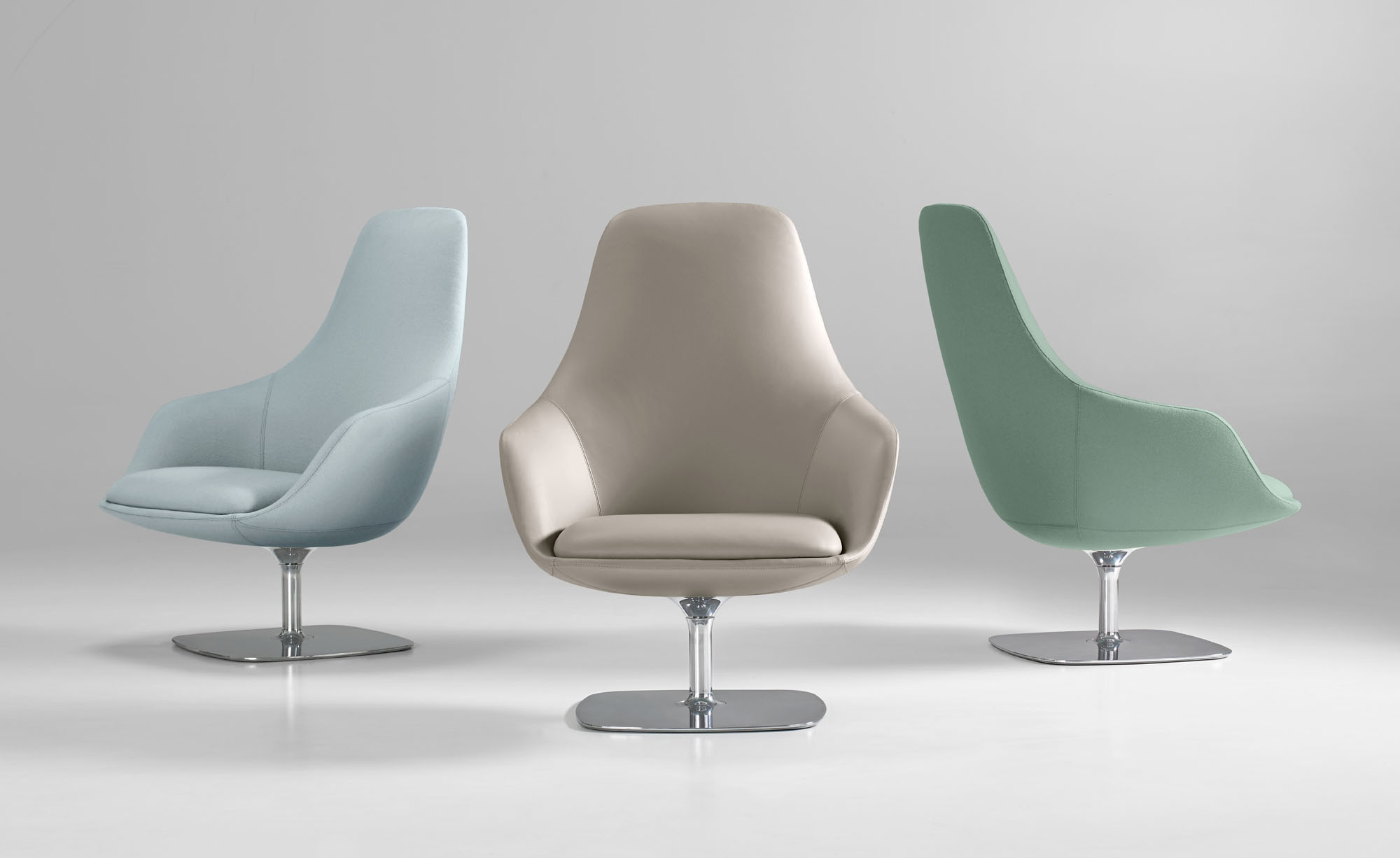 Canelle is offered with two base options: a sculptured cast-aluminum base with a self-returning swivel or a tailored wooden cross stretcher base. The metal base is available in polished aluminum or a powder-coated finish and the wooden base is crafted in solid American maple or walnut.