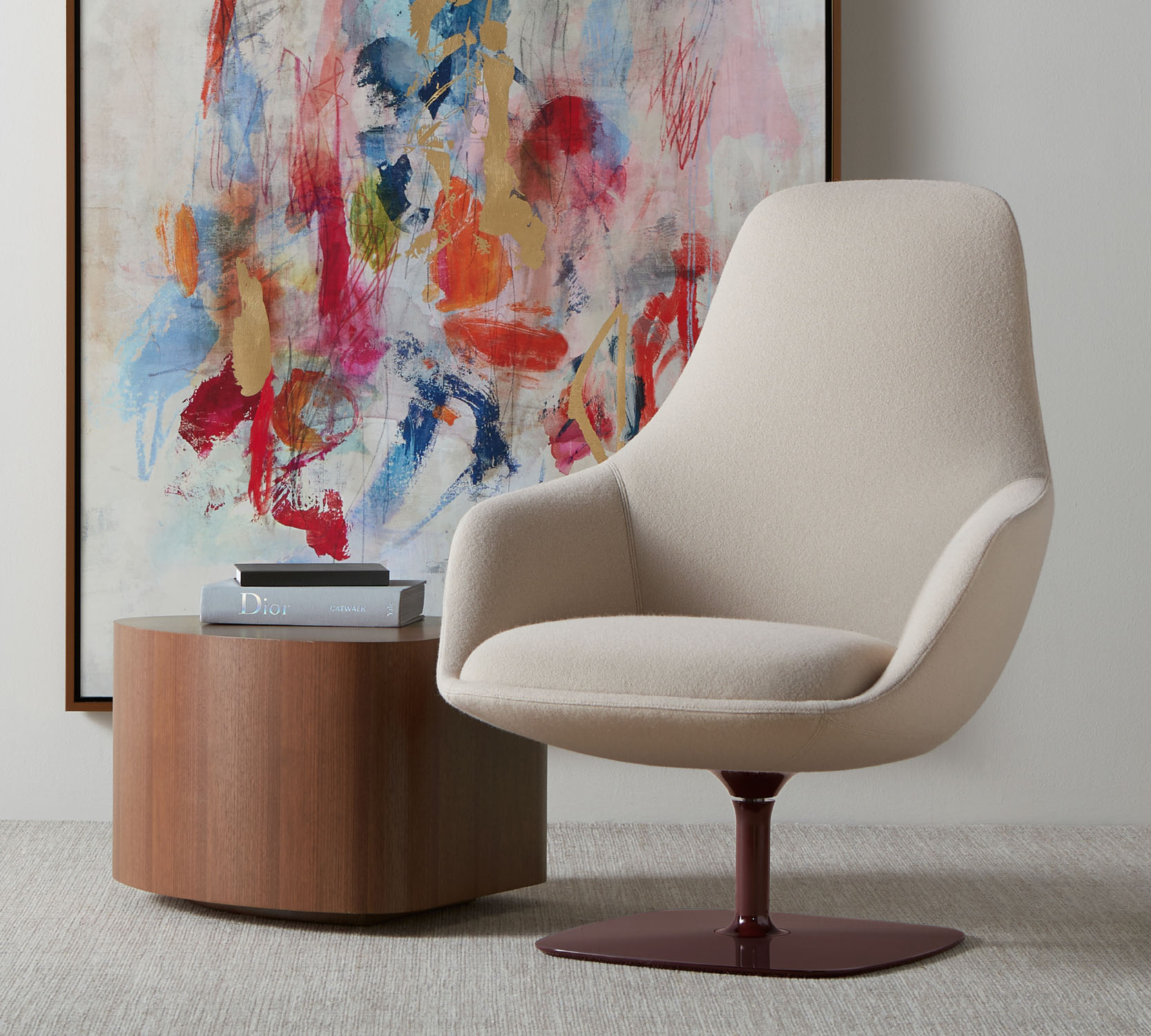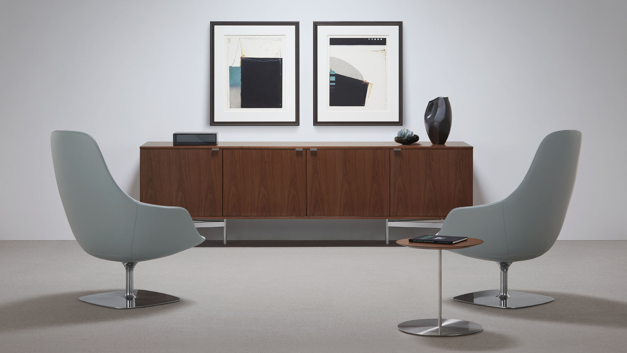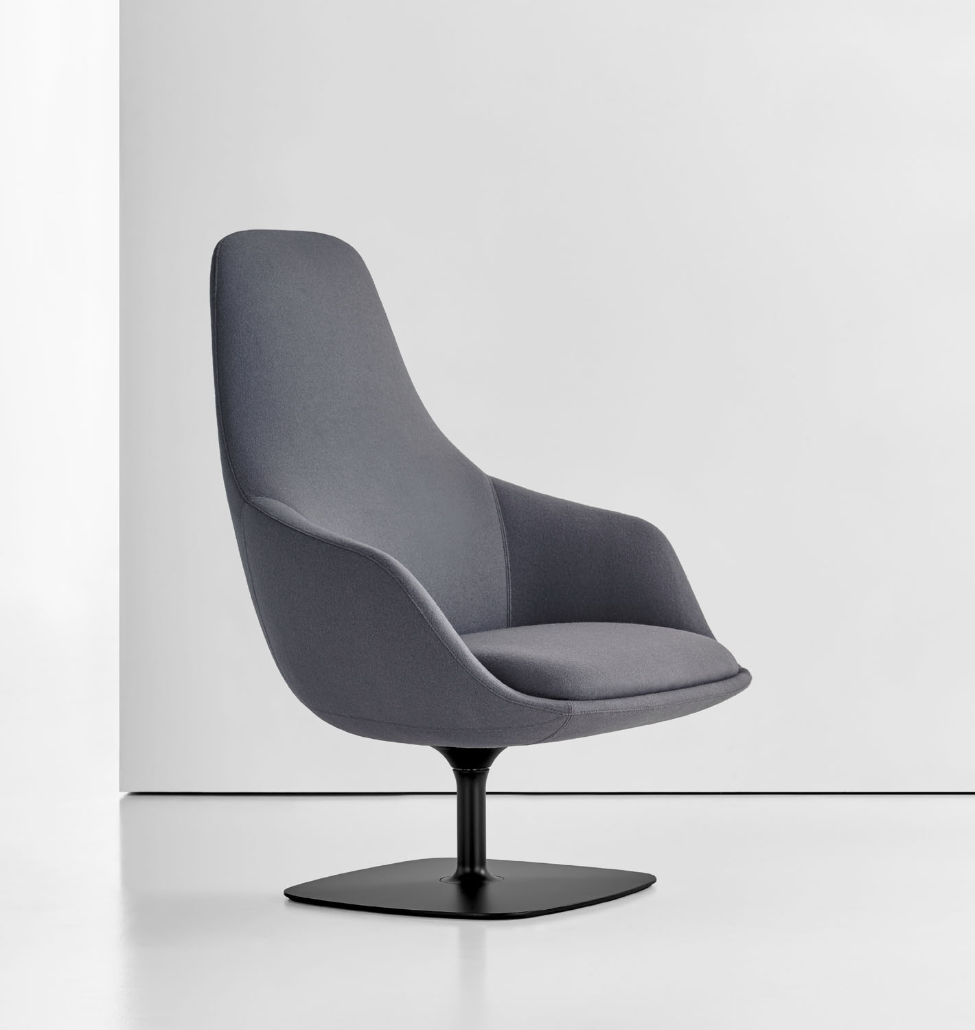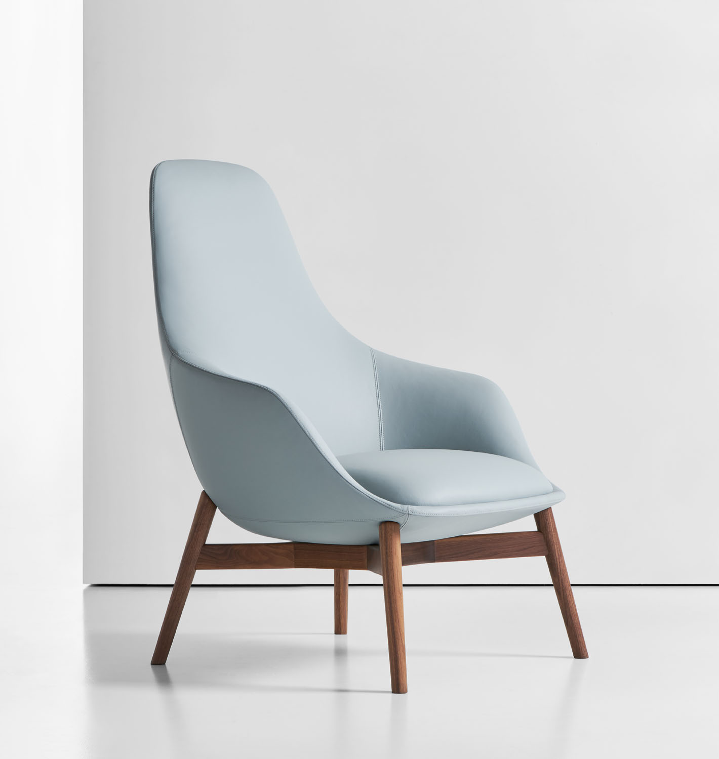 Canelle is offered with two base options: a sculptured cast-aluminum base with a self-returning swivel or a tailored wooden cross stretcher base. The metal base is available in polished aluminum or a powder-coated finish and the wooden base is crafted in solid American maple or walnut.