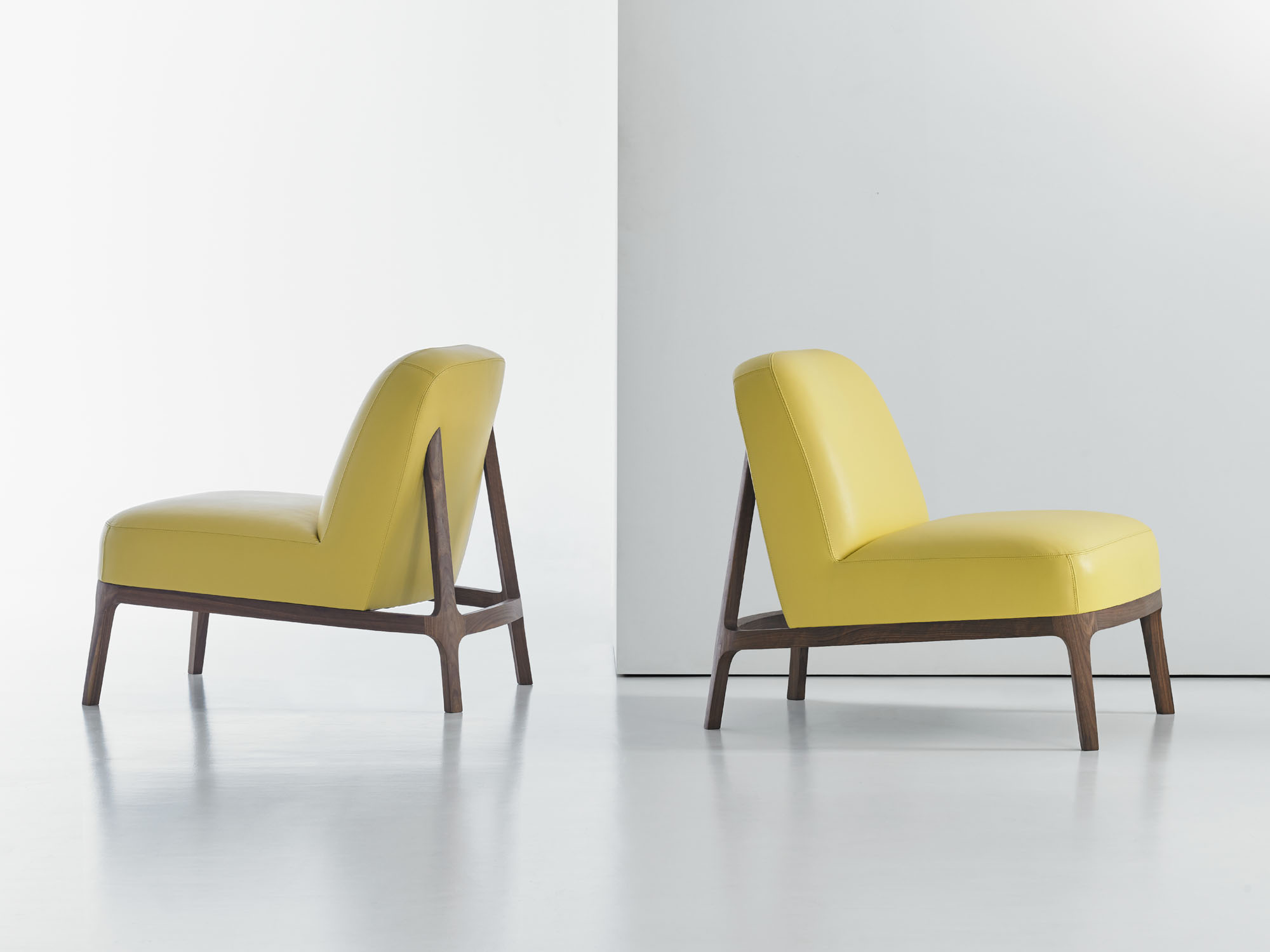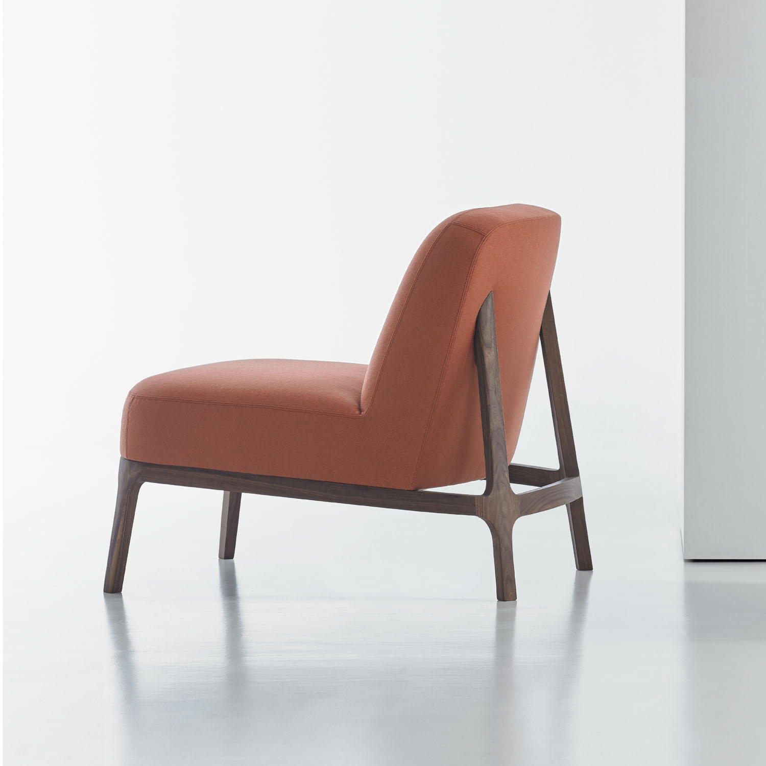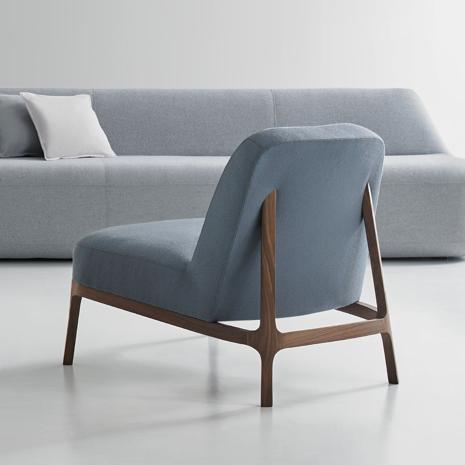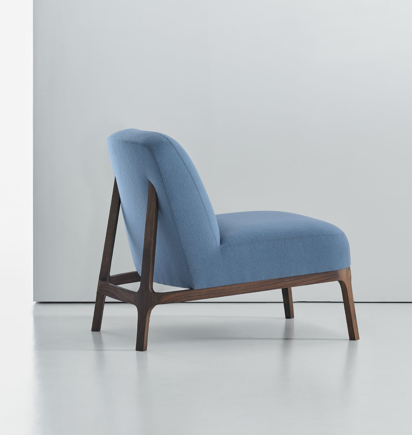 The canted back legs, constructed in solid American walnut, are seamlessly integrated into the upholstered back and give the design a sleekness and sense of motion.