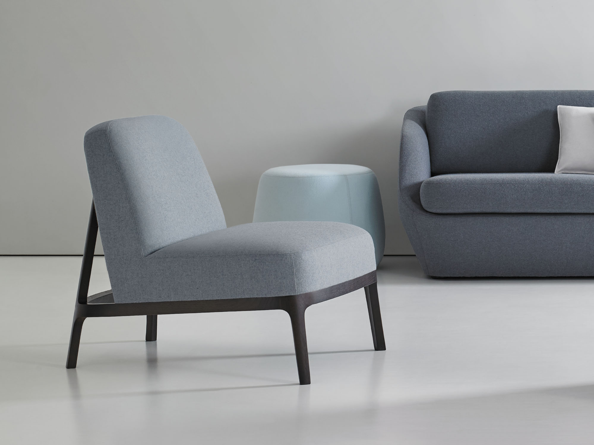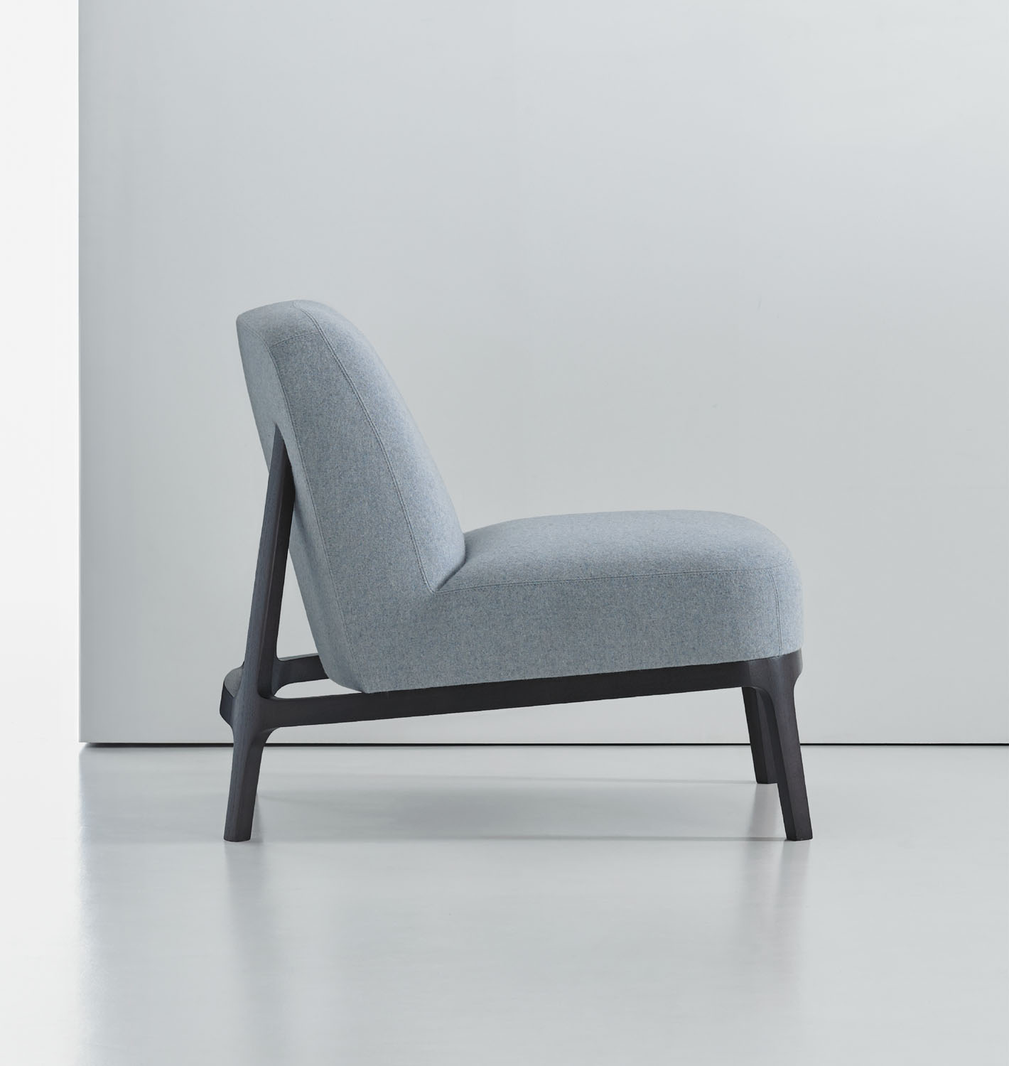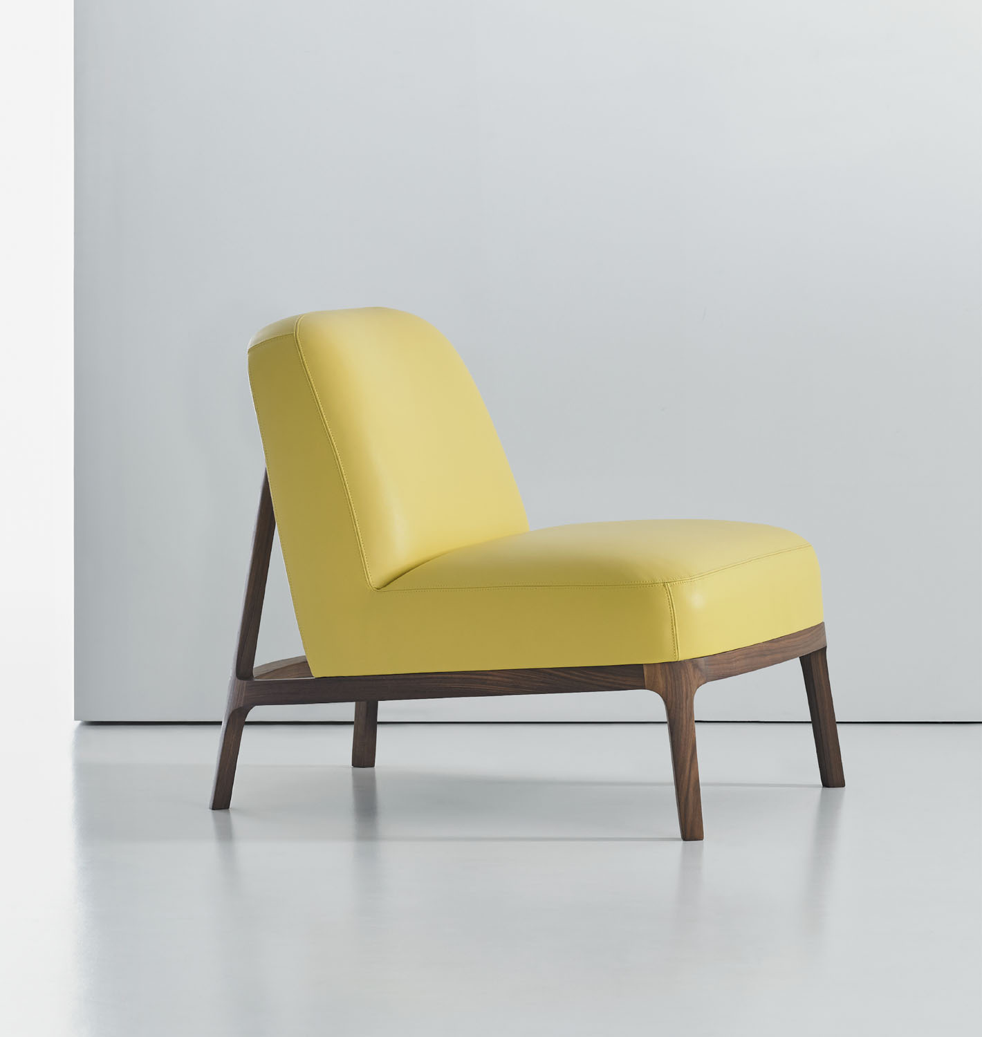 The canted back legs, constructed in solid American walnut, are seamlessly integrated into the upholstered back and give the design a sleekness and sense of motion.