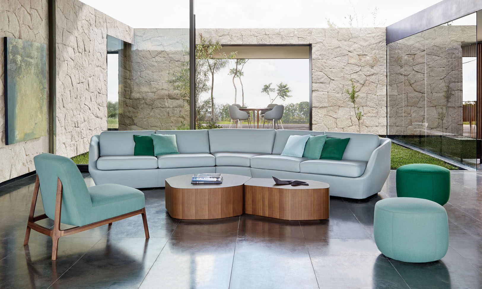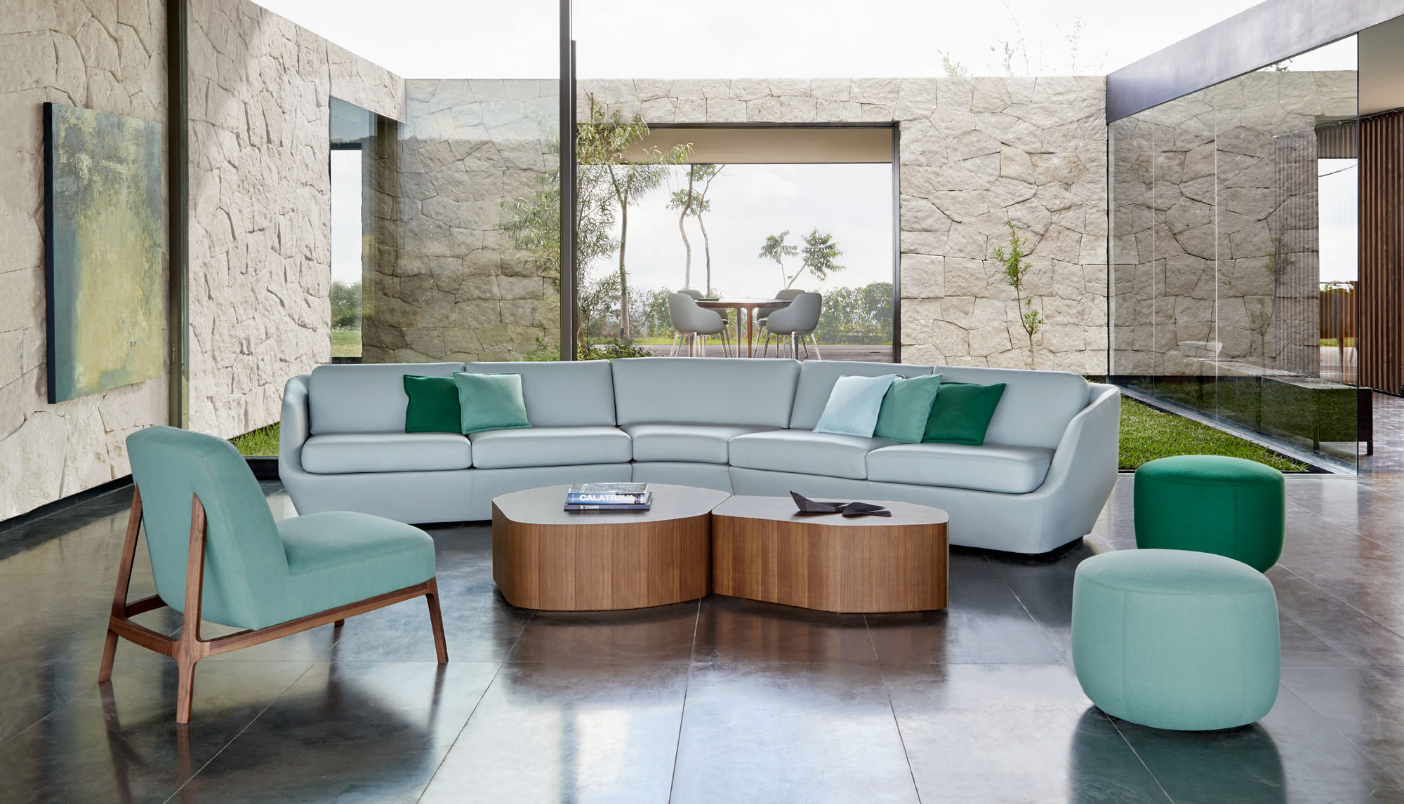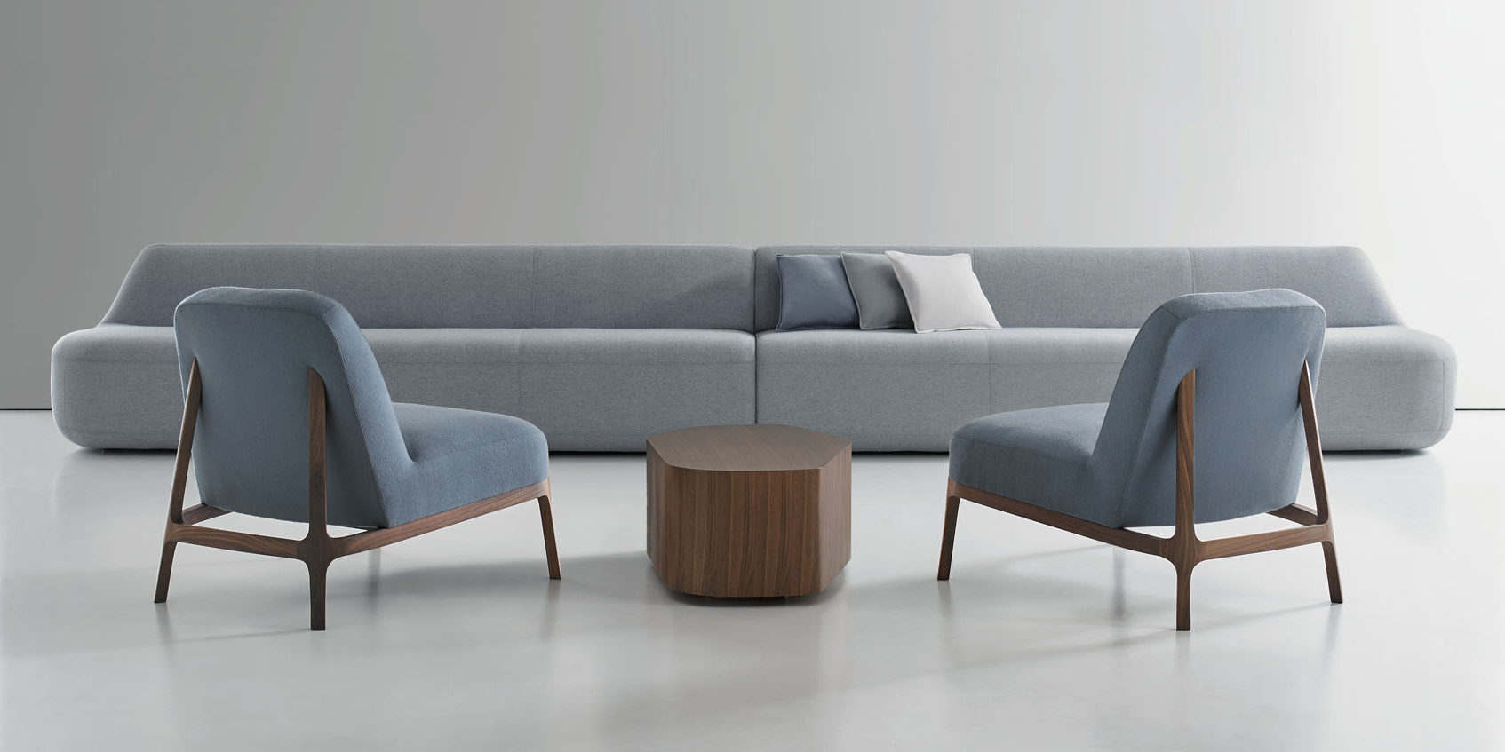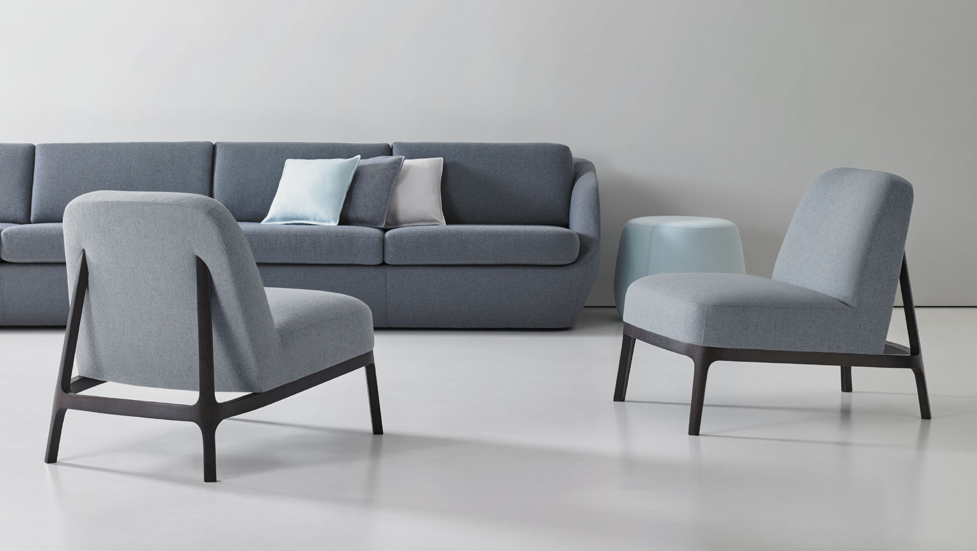The canted back legs, constructed in solid American walnut, are seamlessly integrated into the upholstered back and give the design a sleekness and sense of motion.