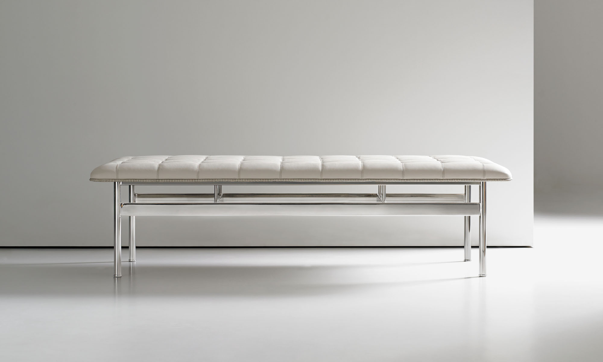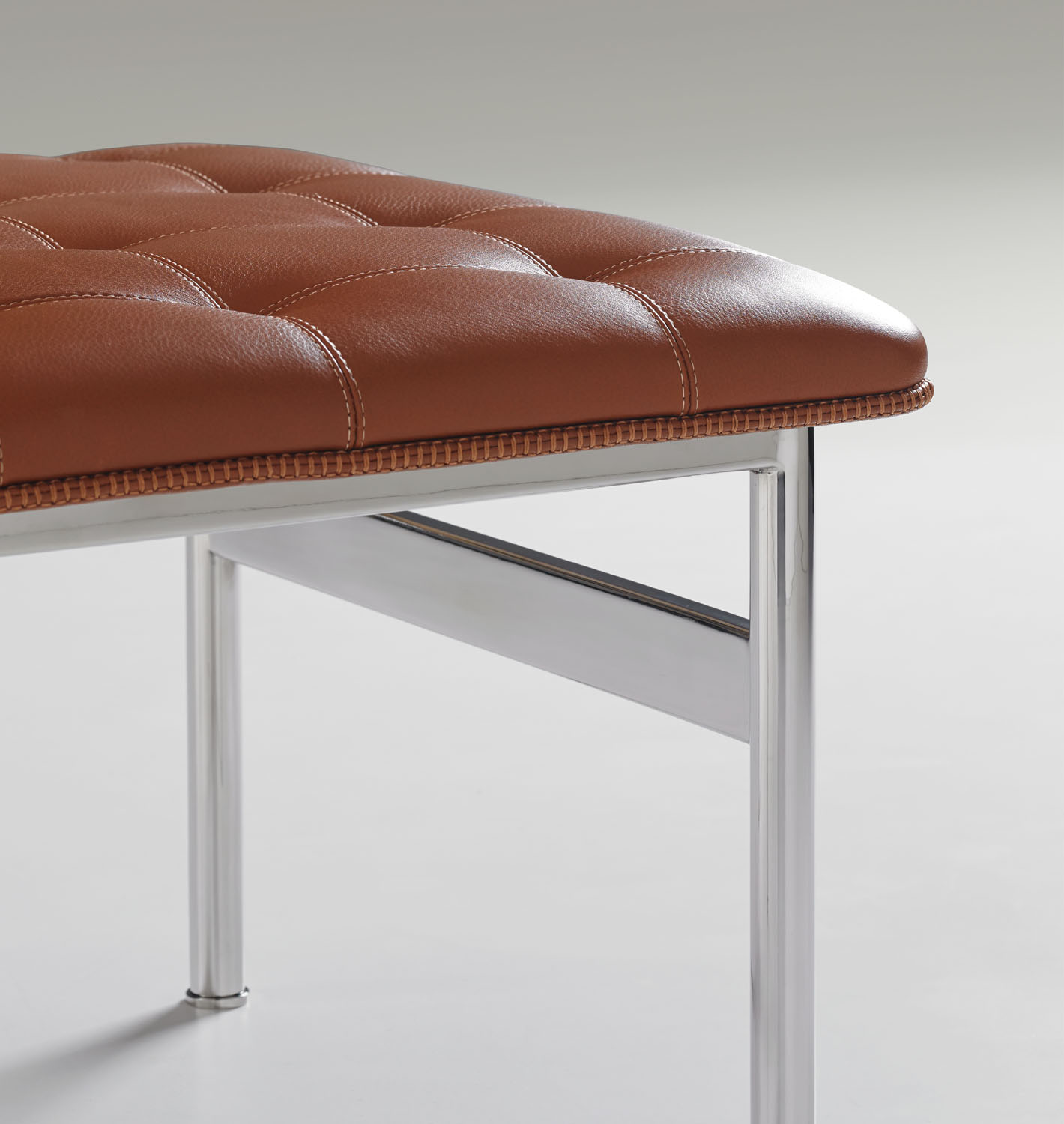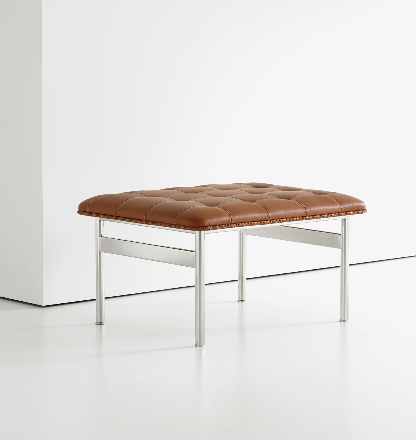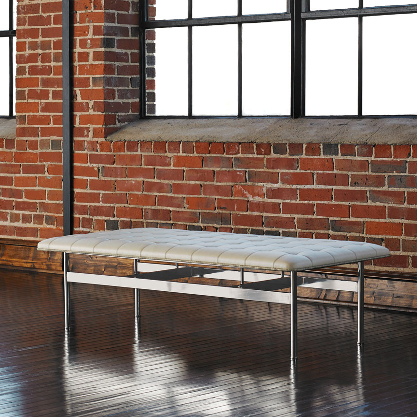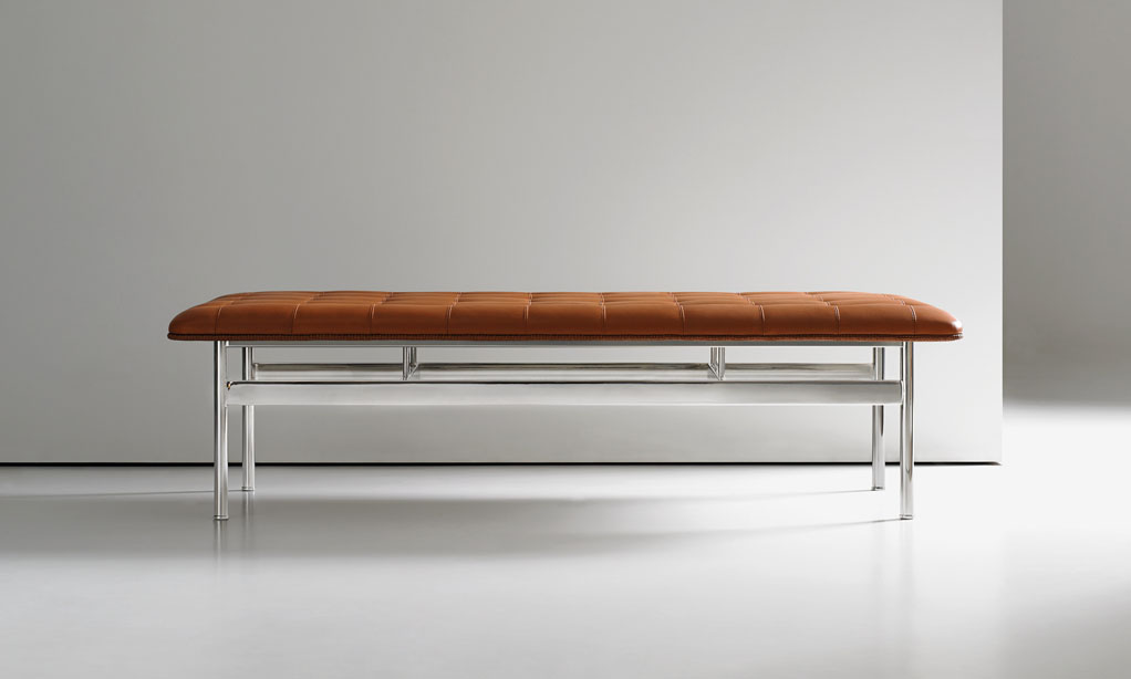 The CP.1 ottoman and bench blend a sleek stainless-steel frame with a classic hand-quilted seat to create a timeless, functional piece of art. The luxurious seat is detailed with a loop-stitched cording that traces the seat’s perimeter.