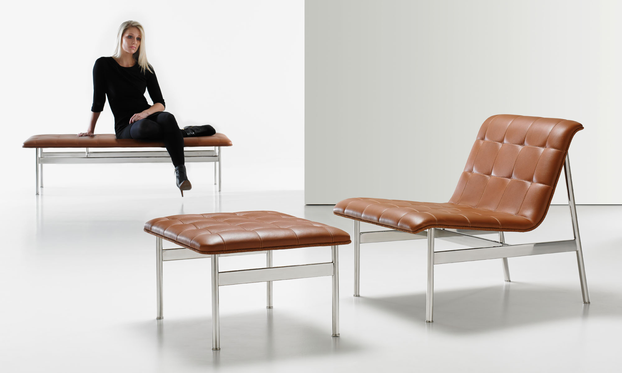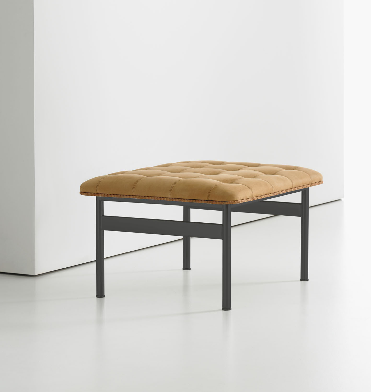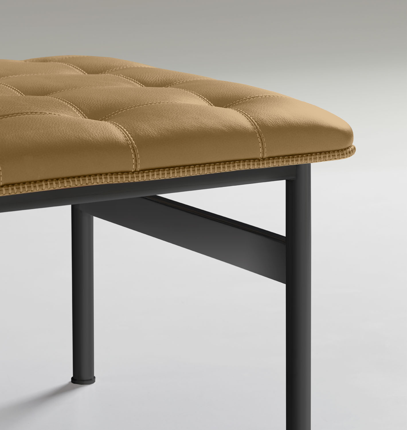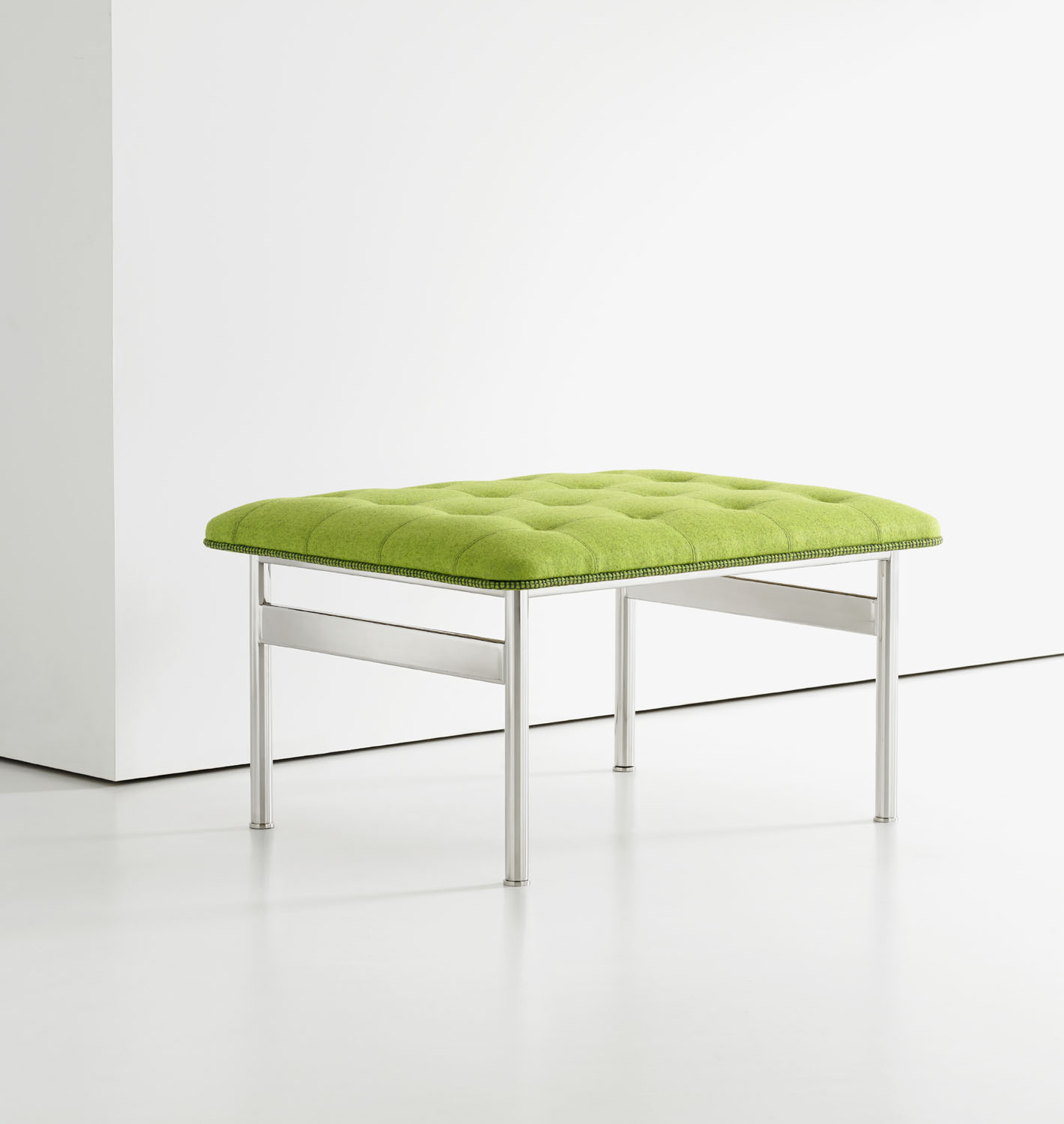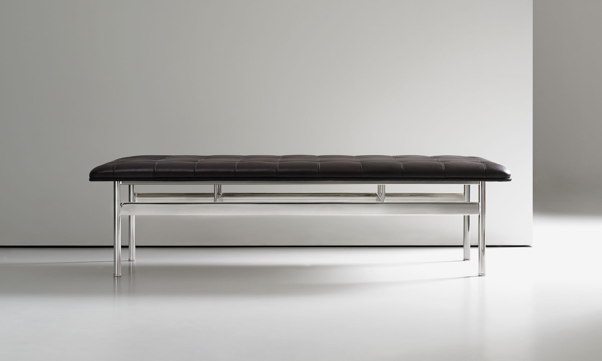 The CP.1 ottoman and bench blend a sleek stainless-steel frame with a classic hand-quilted seat to create a timeless, functional piece of art. The luxurious seat is detailed with a loop-stitched cording that traces the seat’s perimeter.