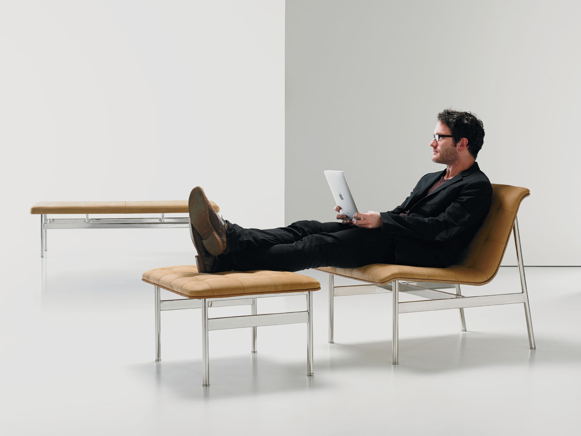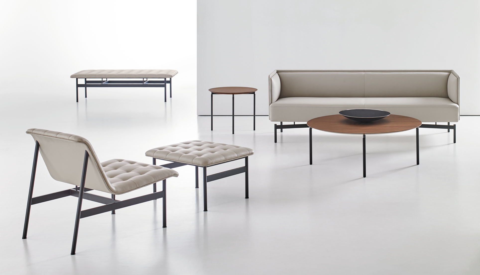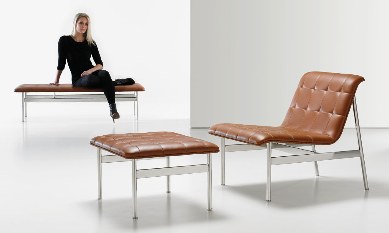 The CP.1 collection features an ottoman and a bench that seats two people.