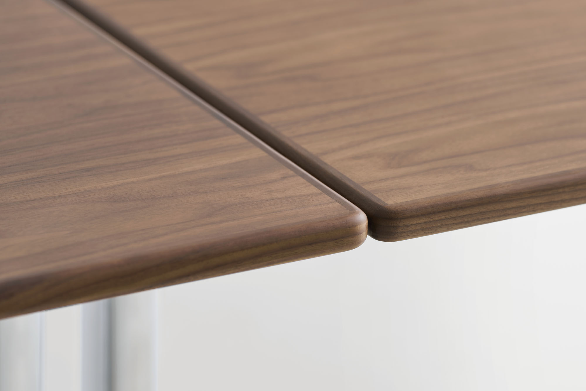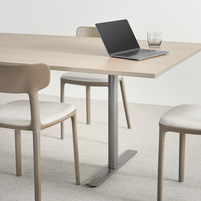 Dillon tables are available in rectangular, teleconference, and half-round versions, ranging from 24″ wide to 90″ long. Tops in oak and walnut veneer or laminate offer several edge detail options. Aluminum bases in two distinct styles offer a polished or powder coat finish.