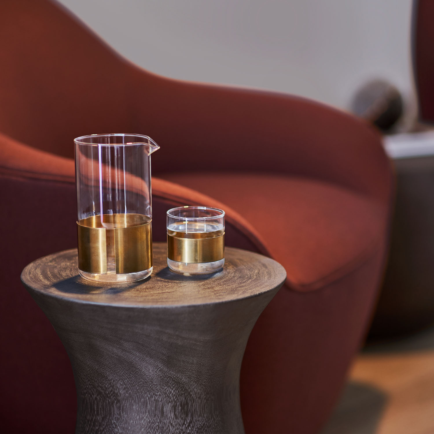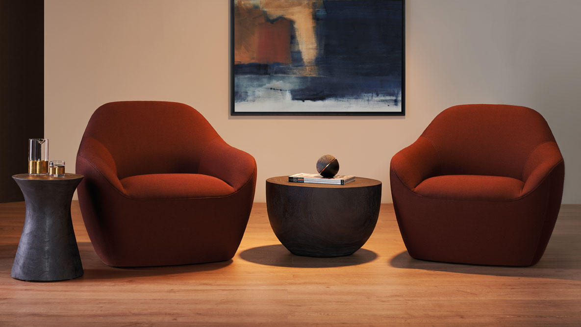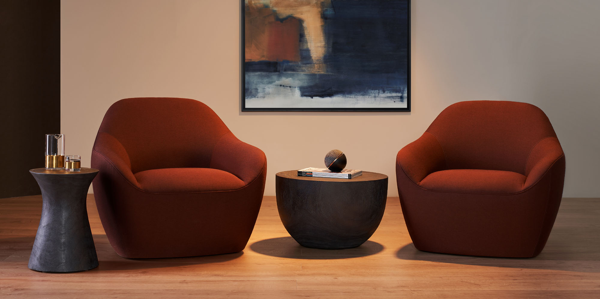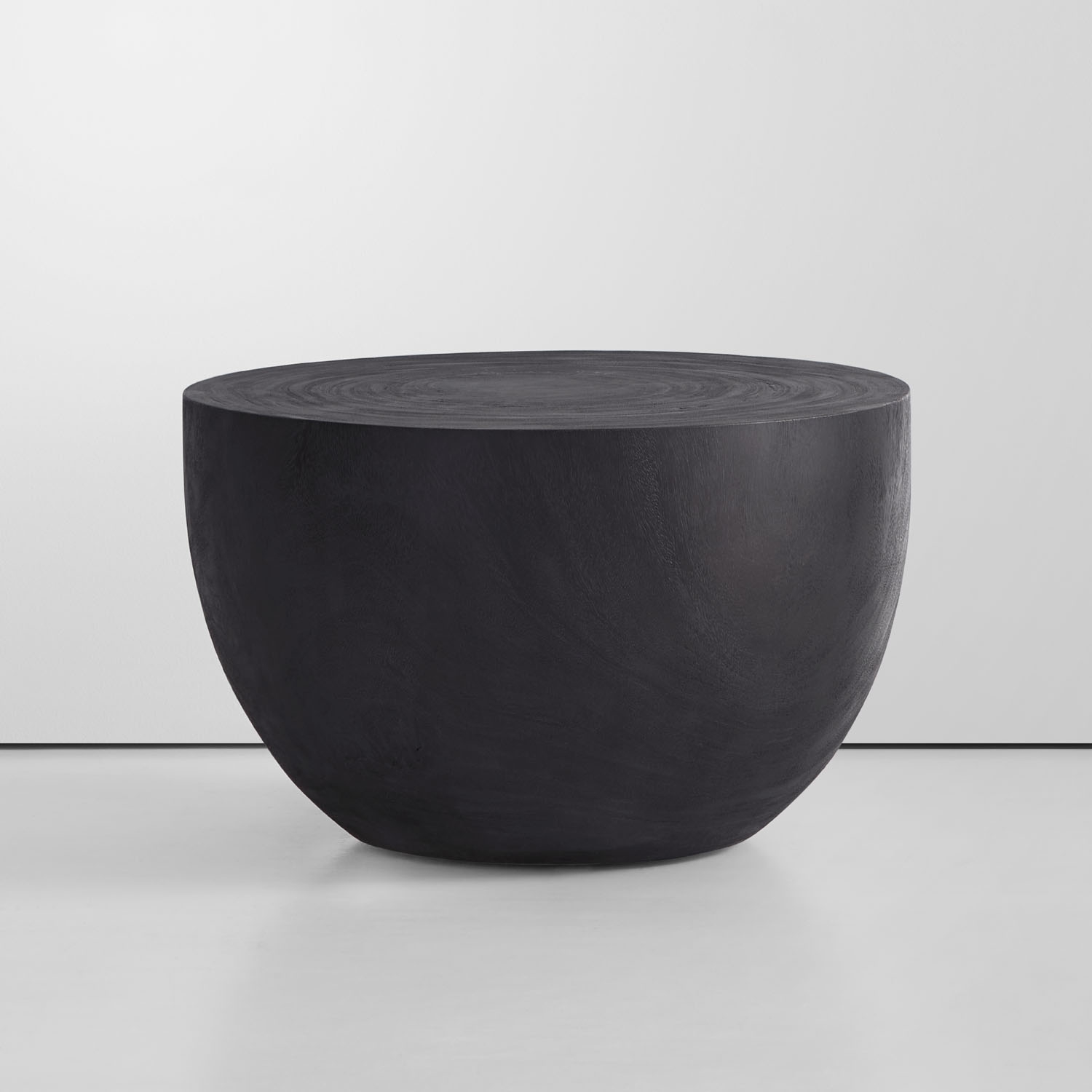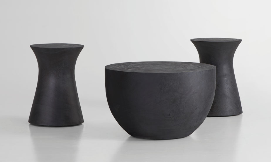 The collection features a half-sphere table and a smaller cylinder table with non-marring glides.