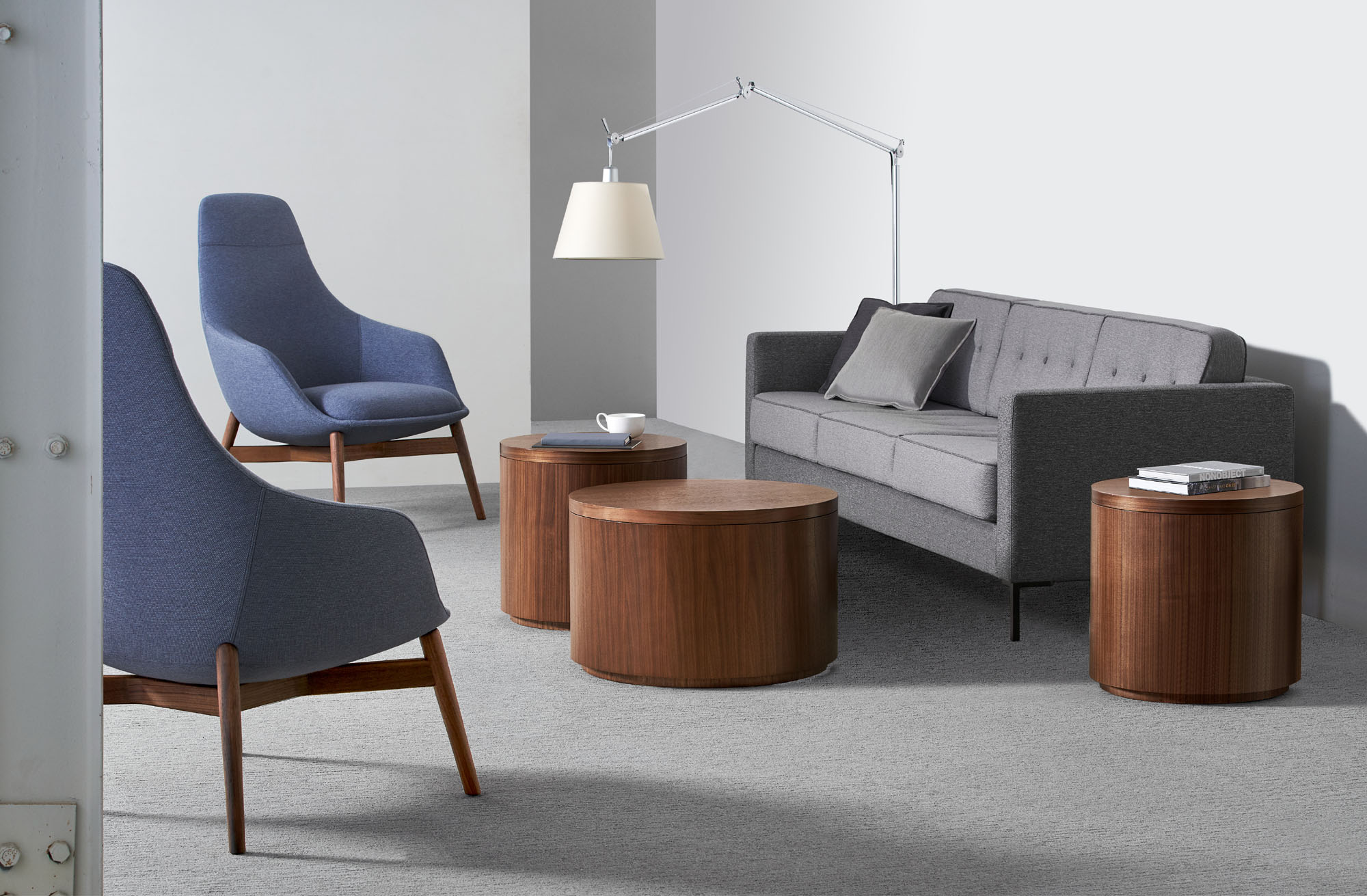 Available in an oak or walnut base, Elevation Drum tables can accommodate an oak, laminate, or solid surface top.