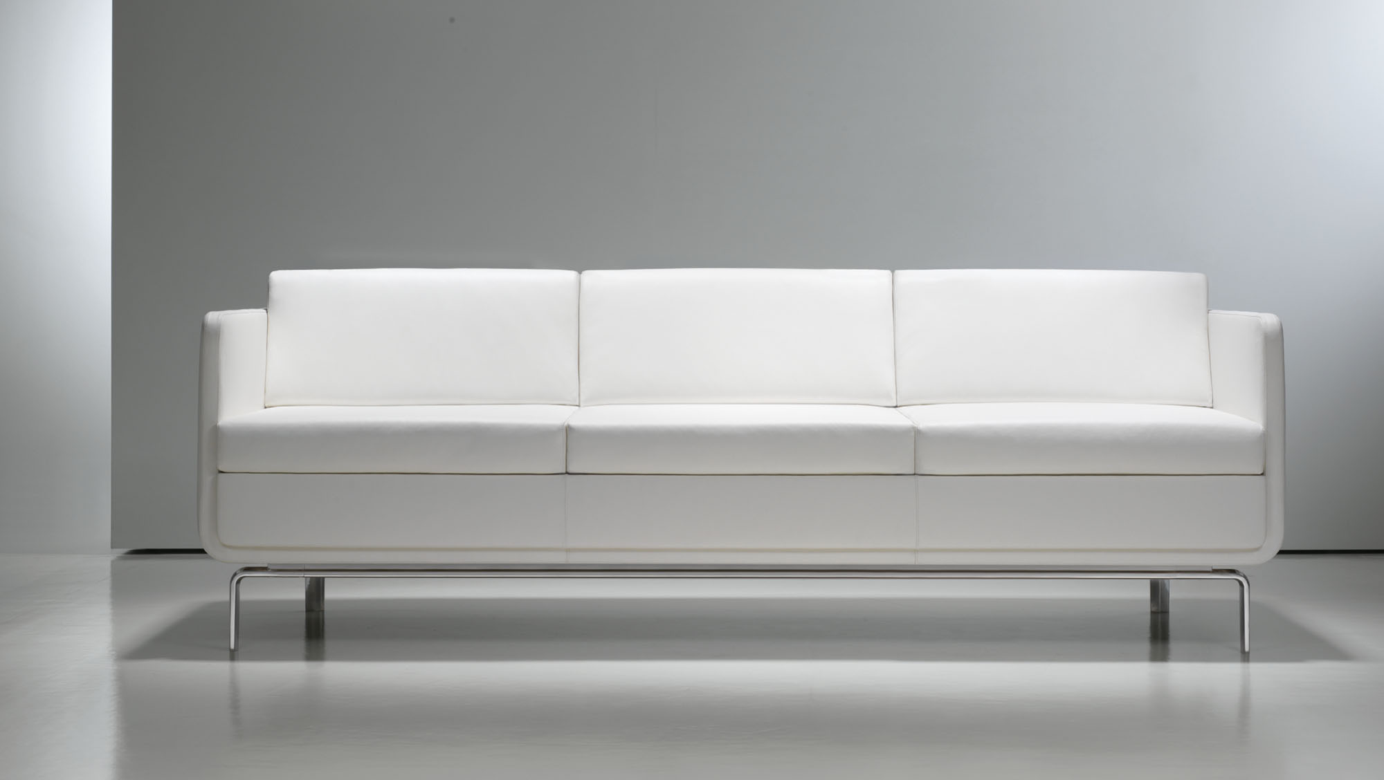 Both low and high-armed versions visually swoop into a sculpted outer shell extending across the frame, cradling molded-foam cushions.