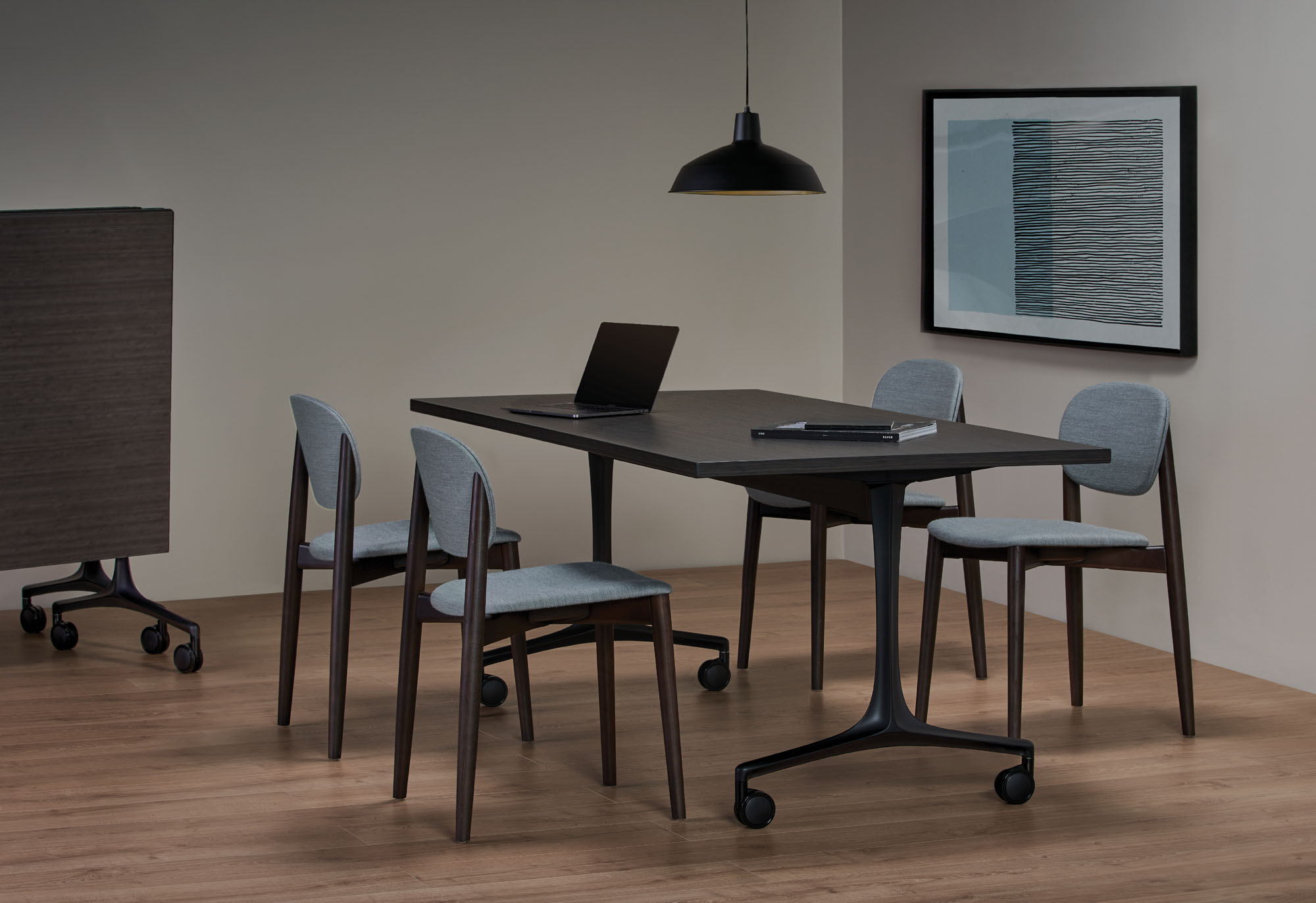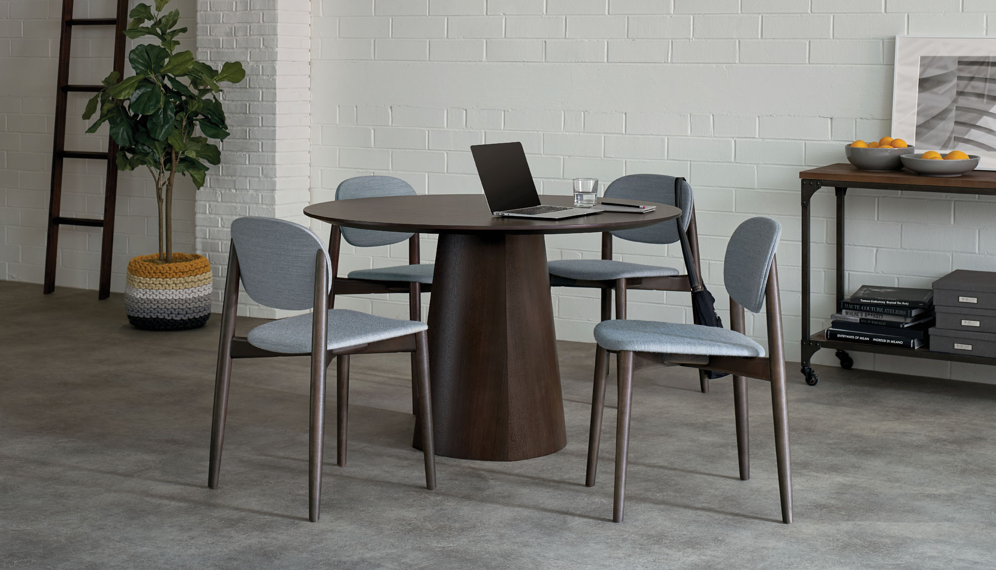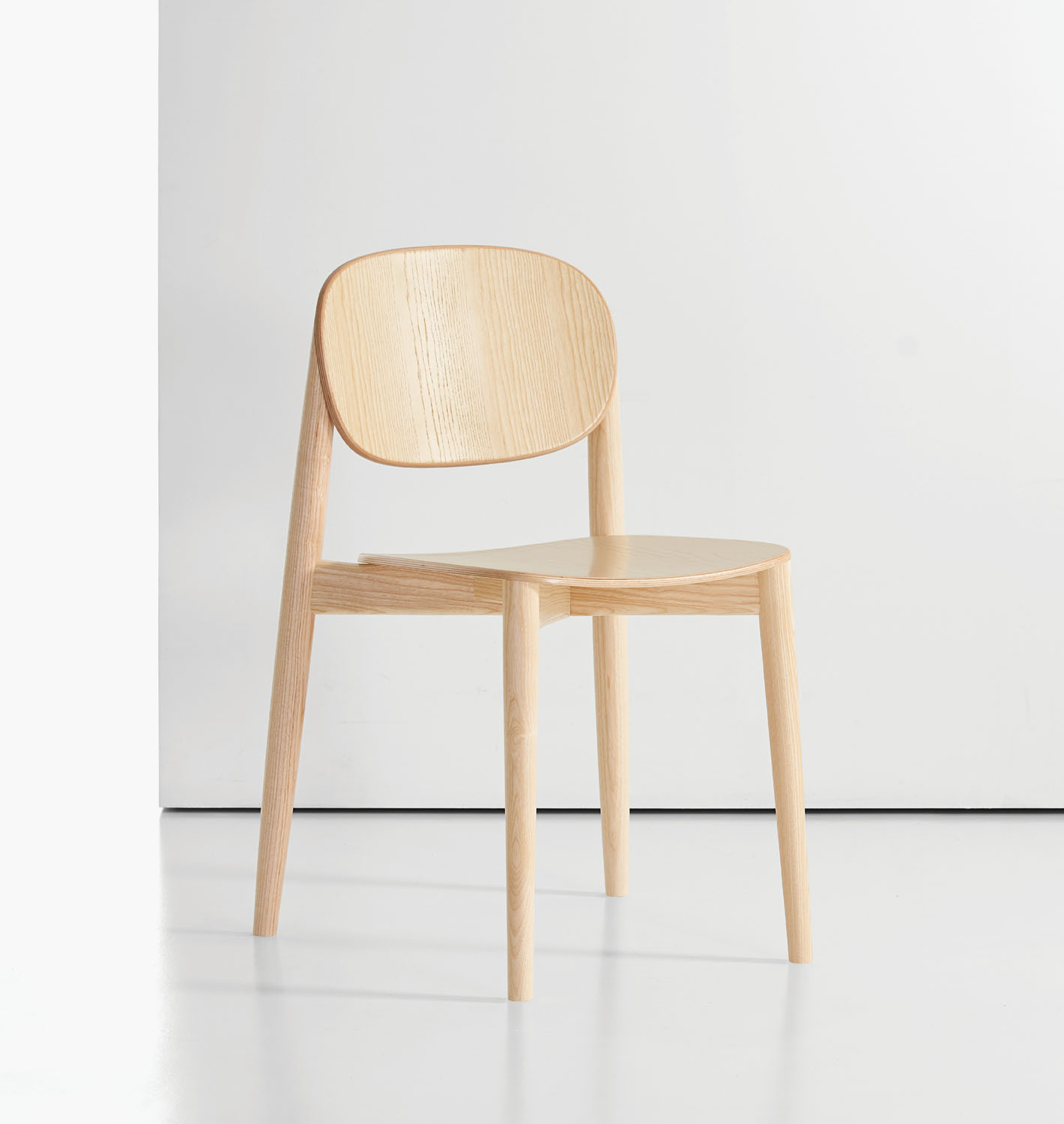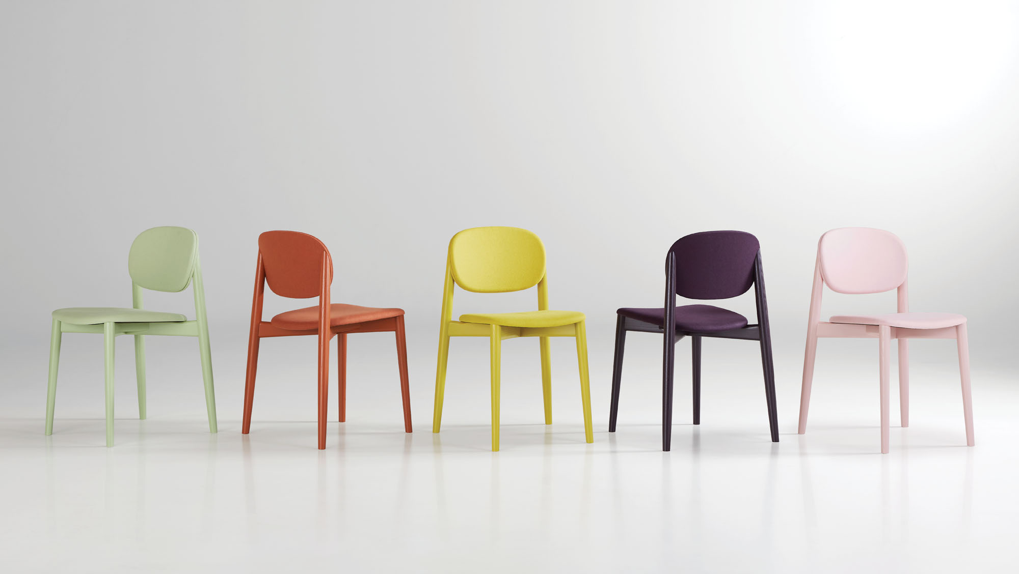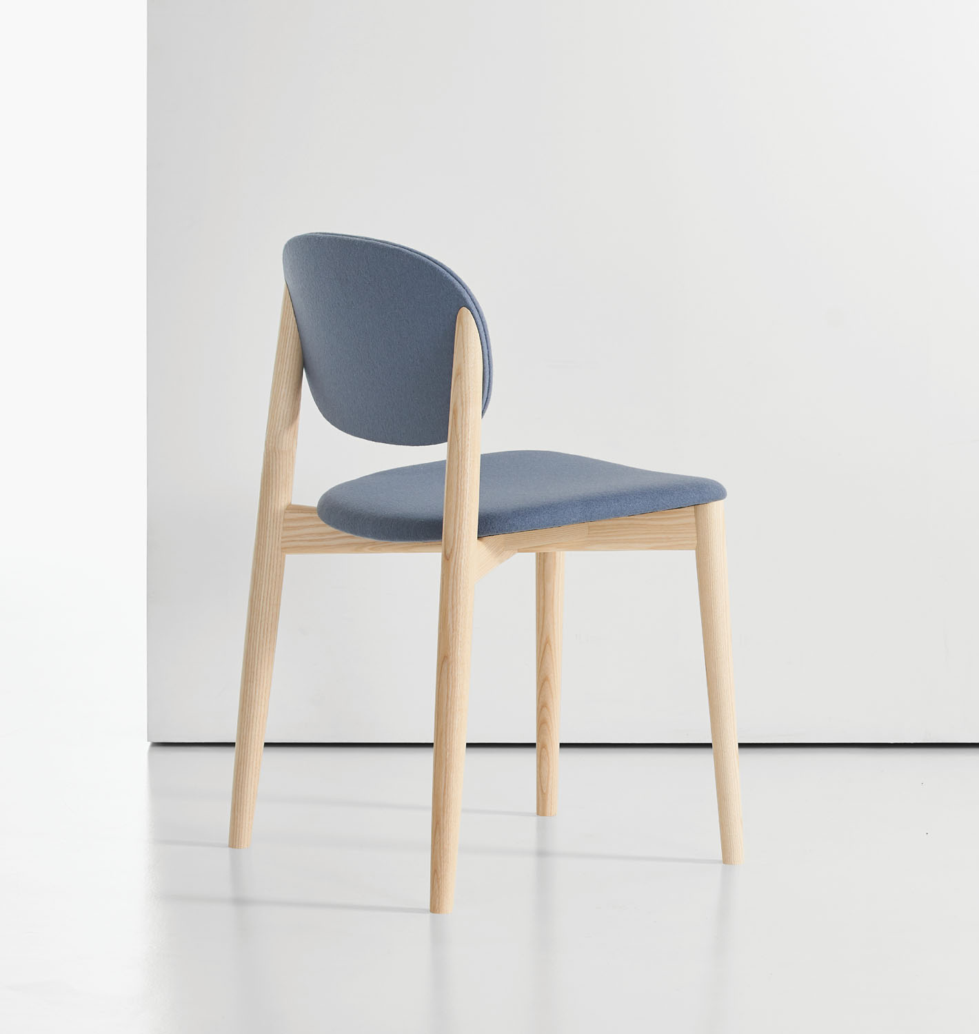 Halo is constructed in a solid ash base, offered in a variety of painted or natural wood finishes. Seat and back options include upholstered or ash veneer.