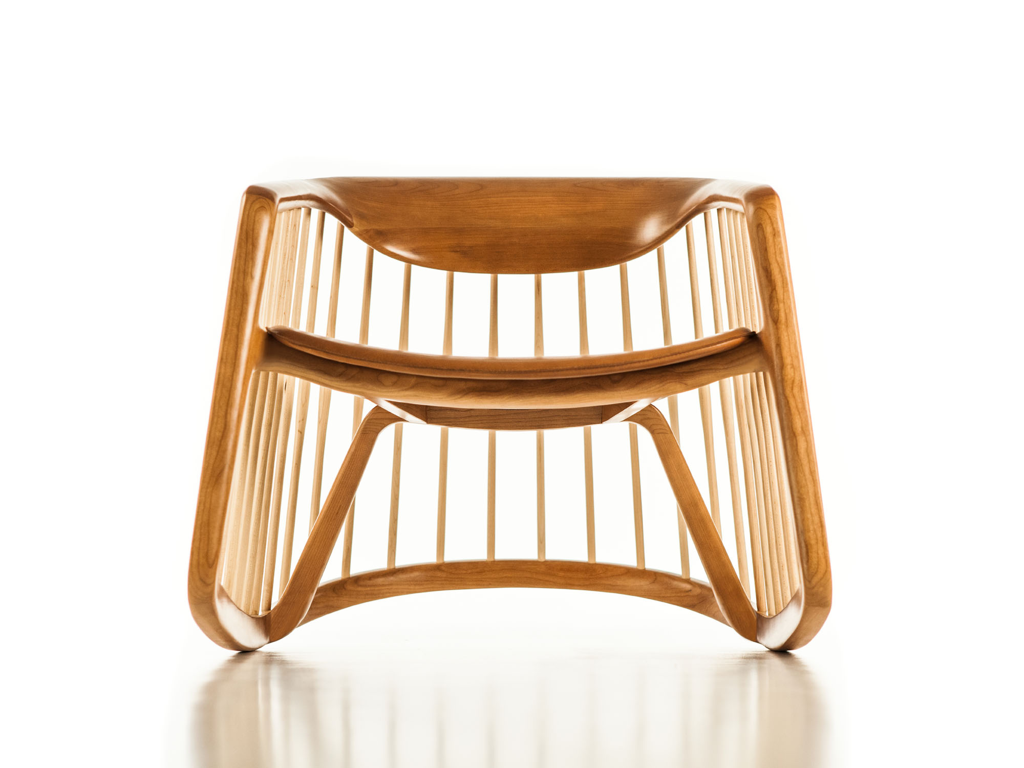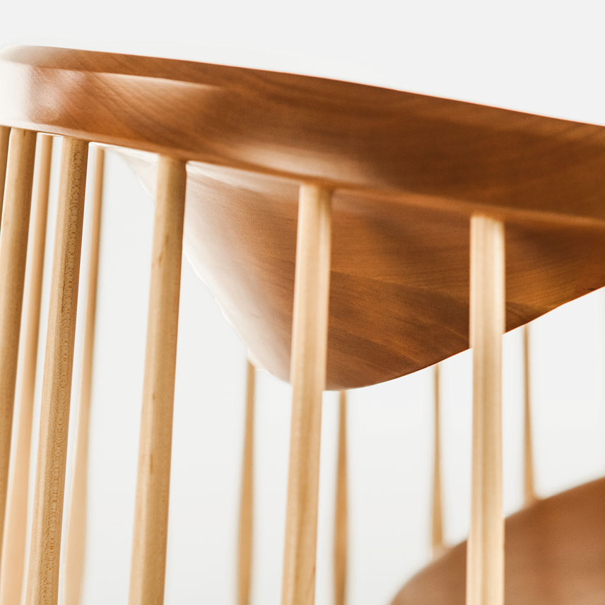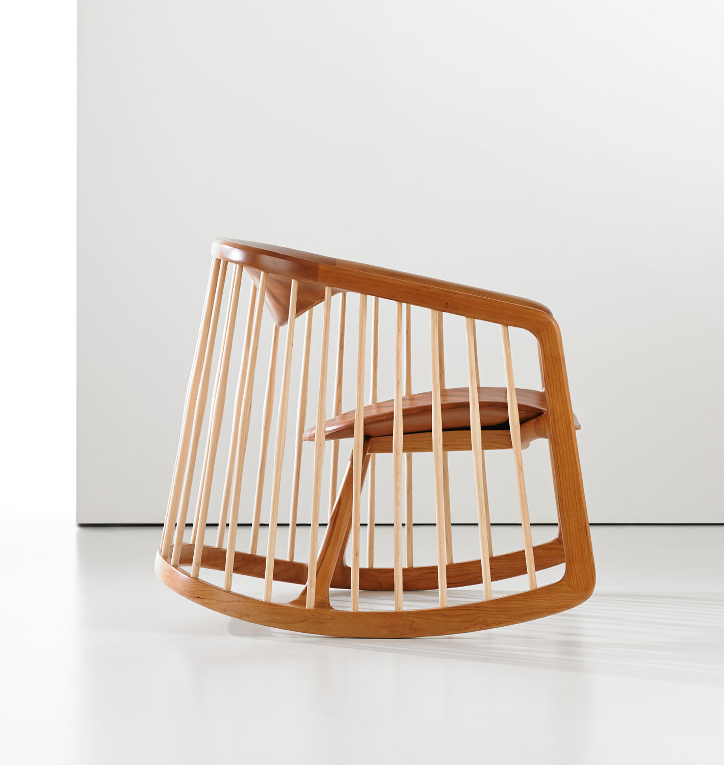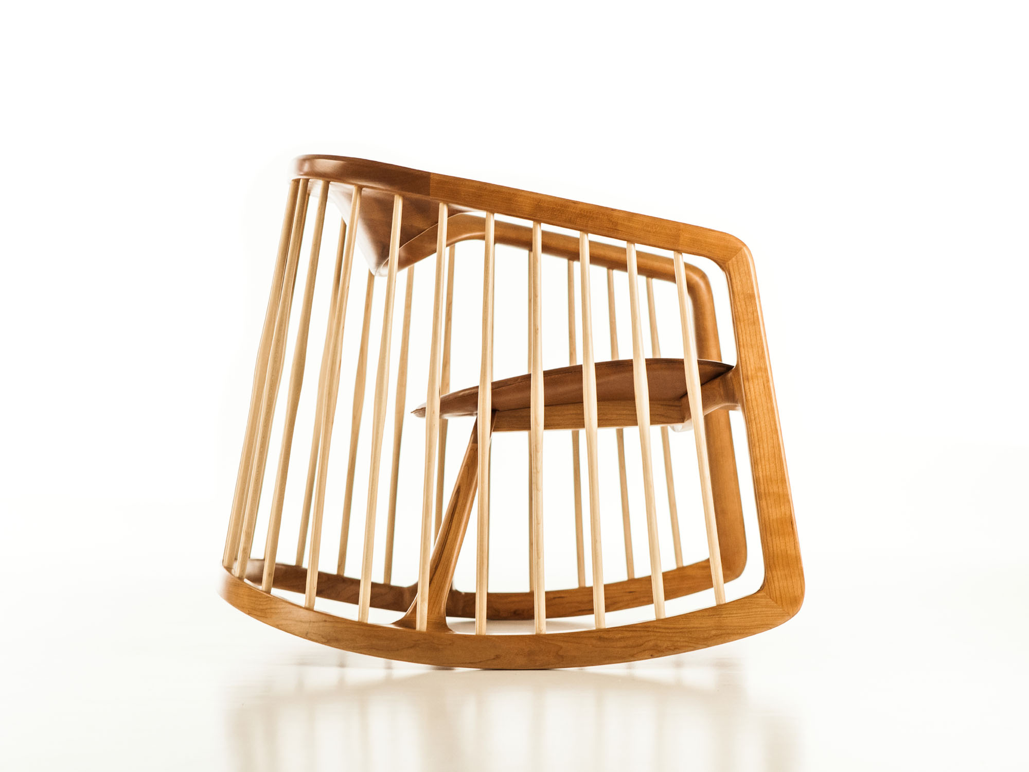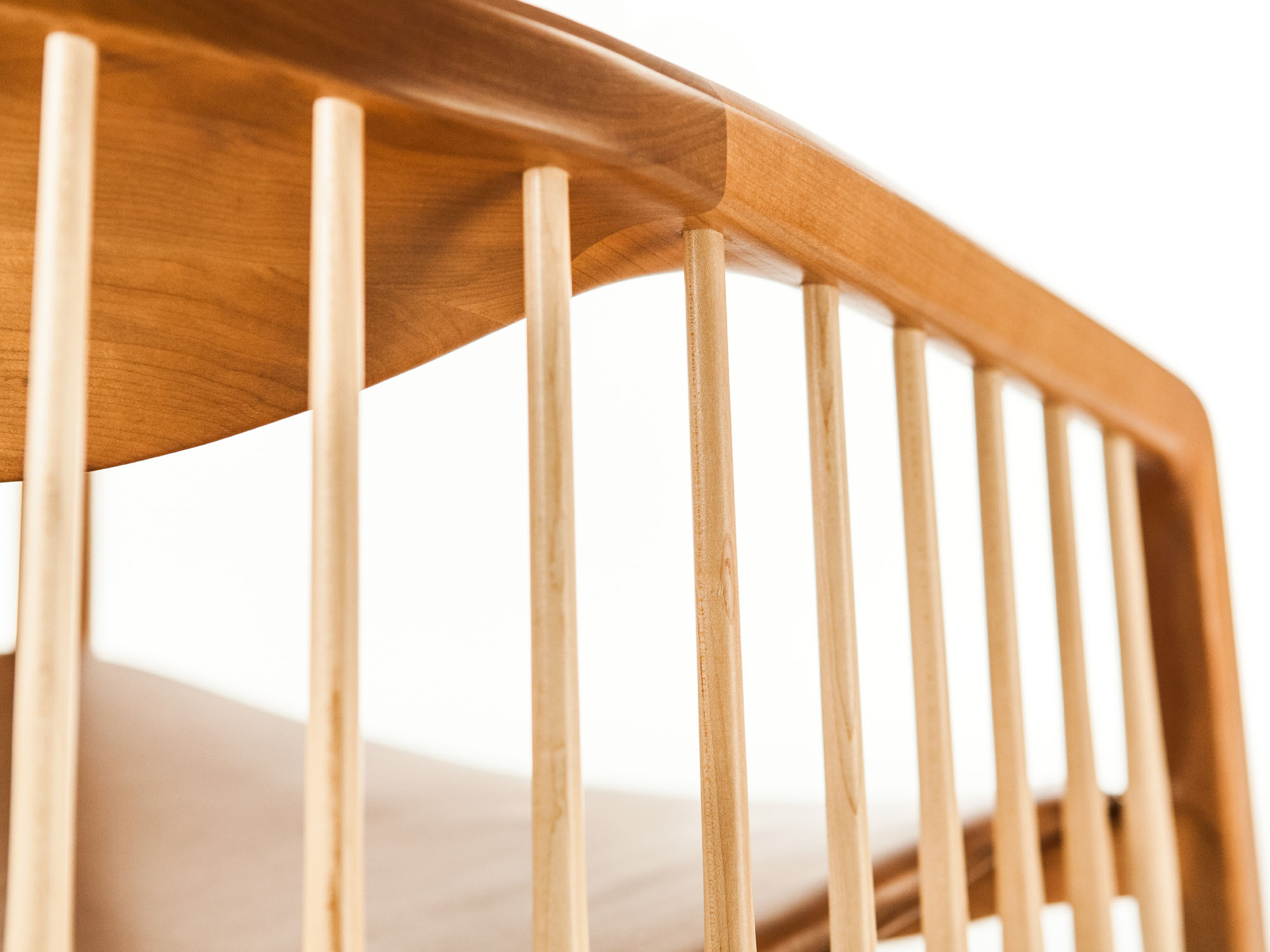 The chair frame, coated with a natural clear finish, is made from solid cherry and features maple tapered spindles. The contrast between two woods enables one to follow the form of the chair and easily see the suspended interior.