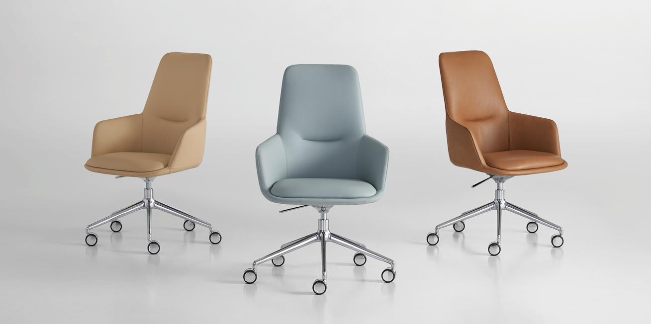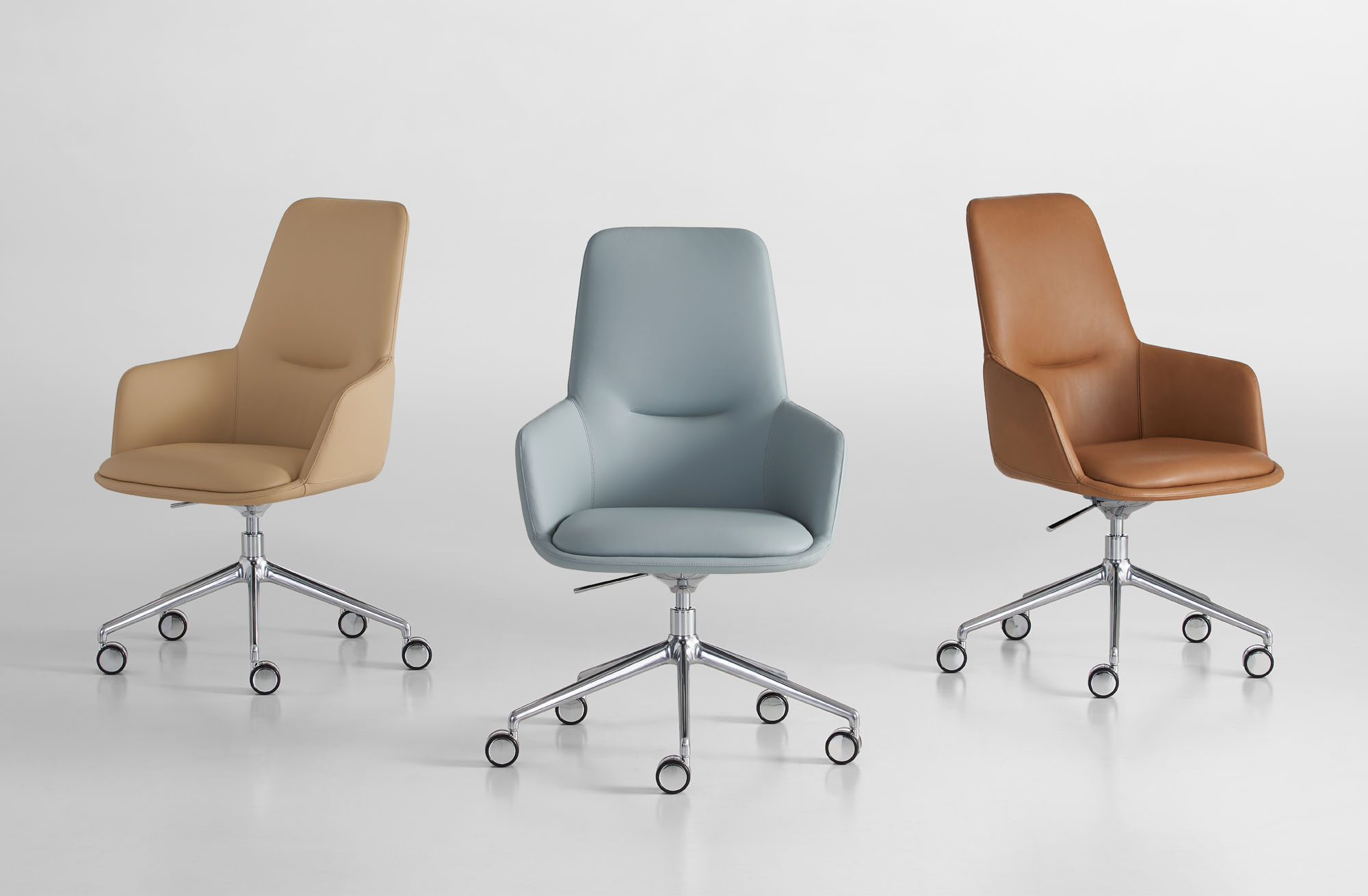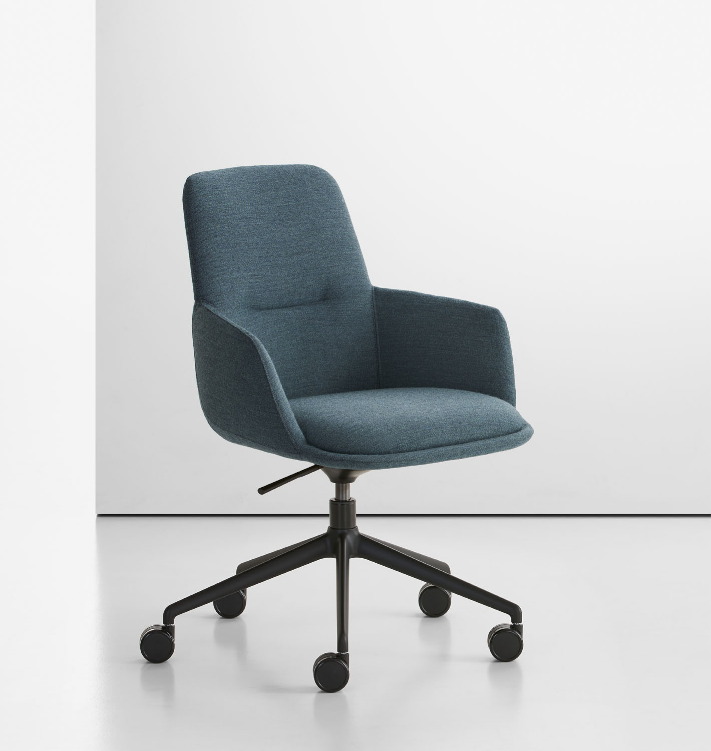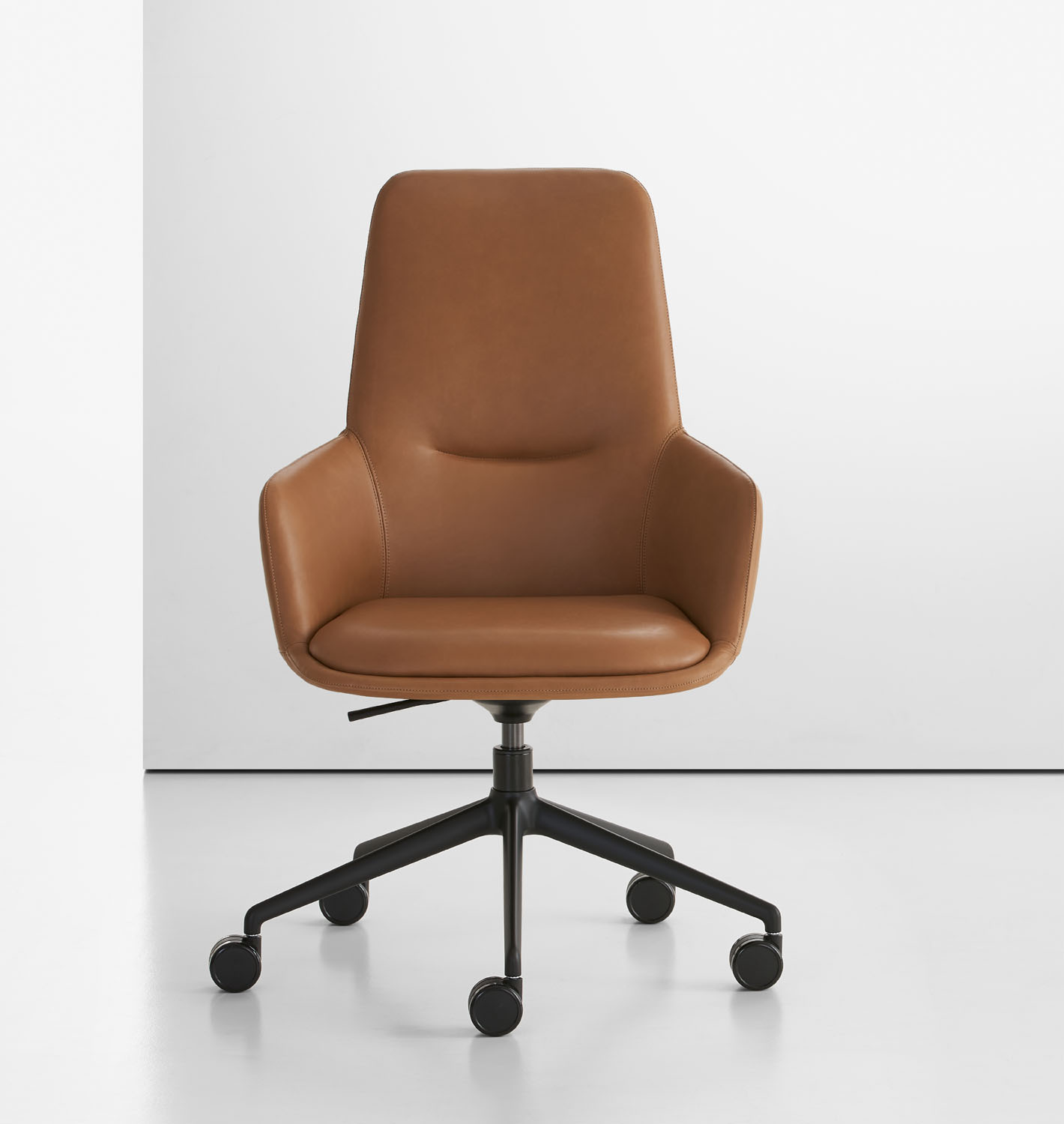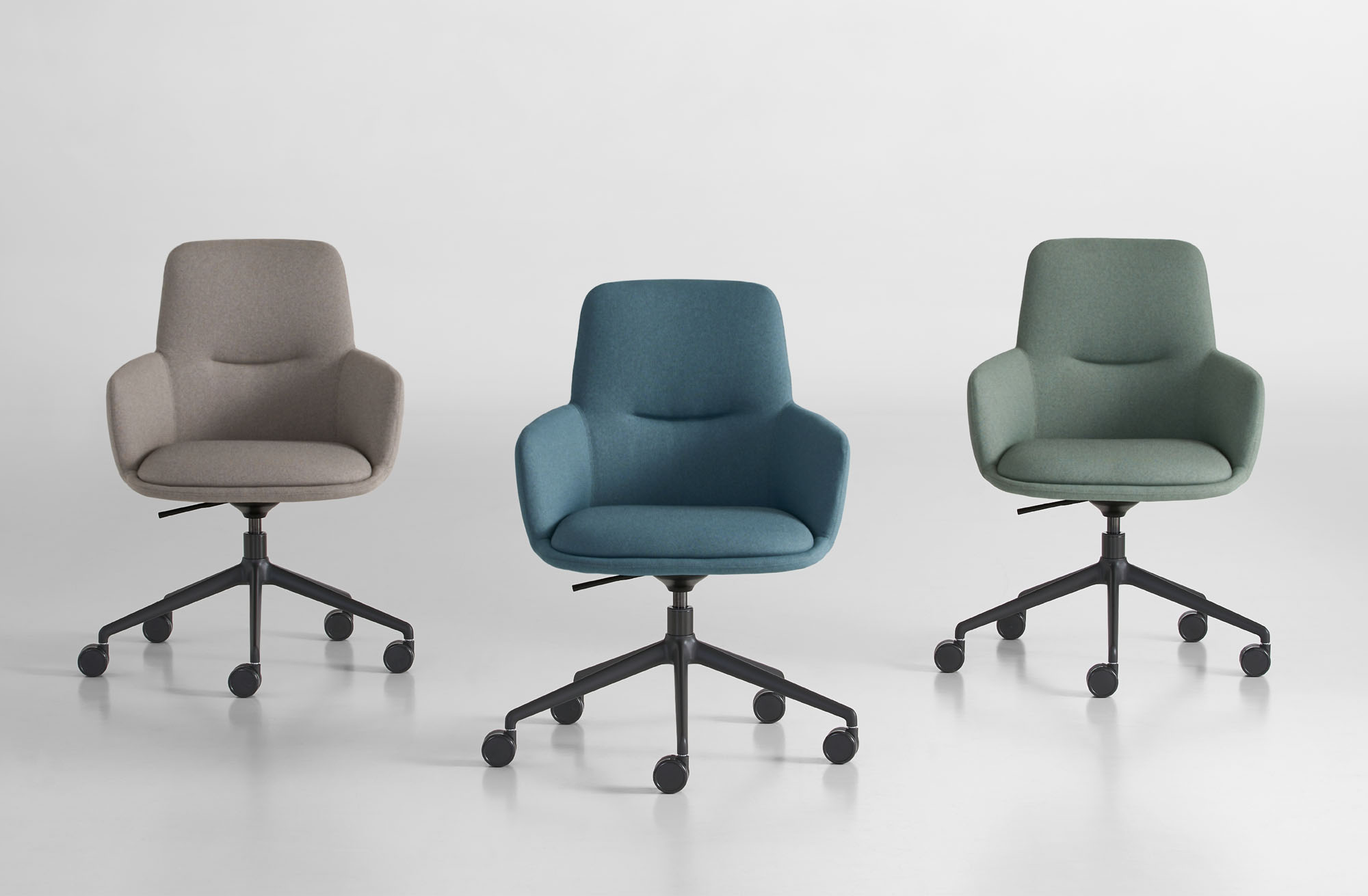 The Kylo chair was designed with comfort in mind, resulting in a swivel with a cozy shell that envelops. Kylo is available as a low-profile mid-back or a high-back for added support. The sleek design highlights rounded curves and gentle lines.