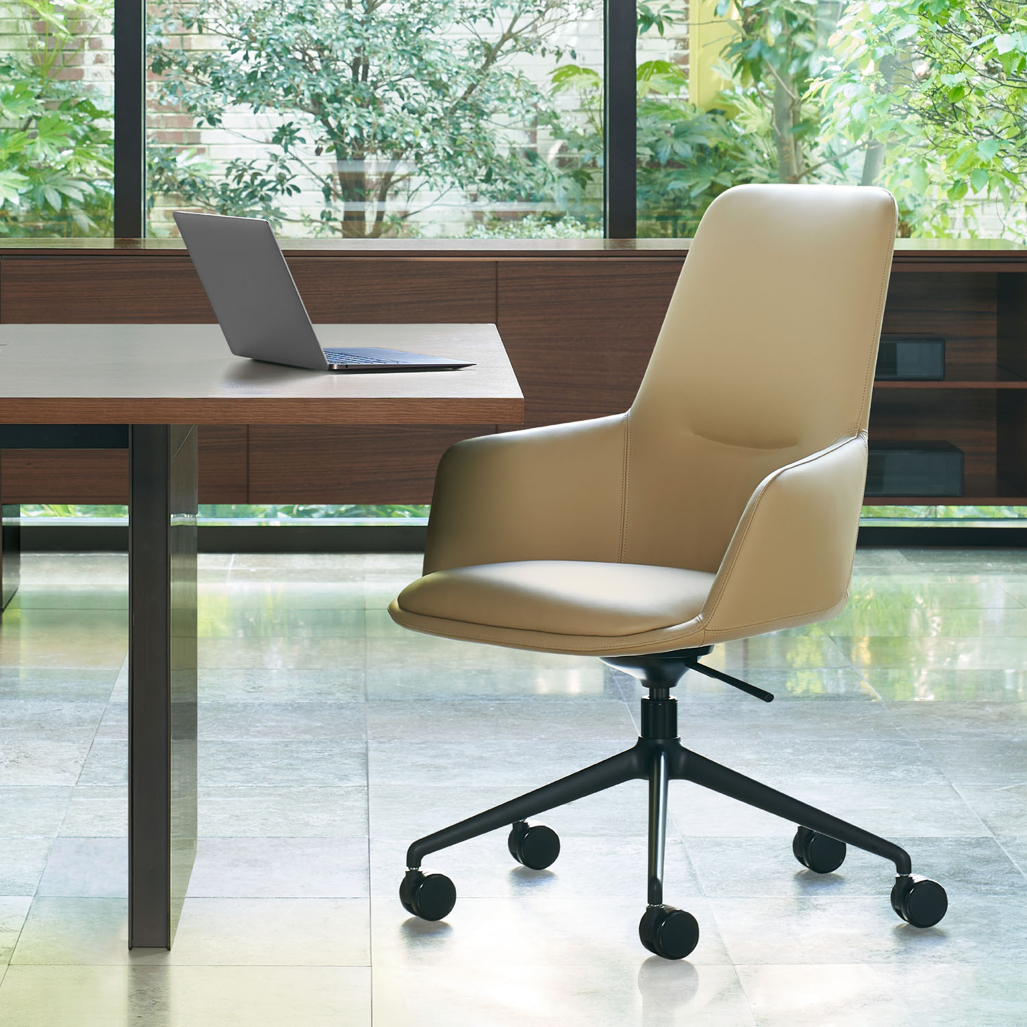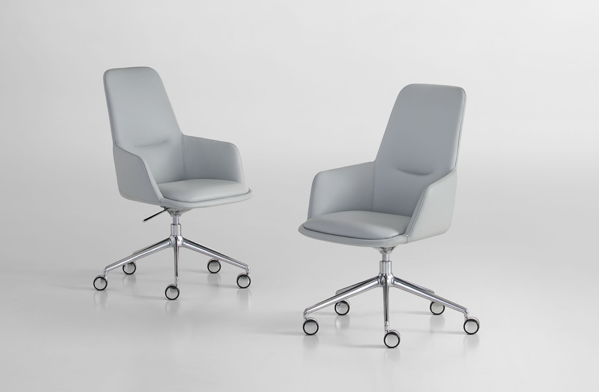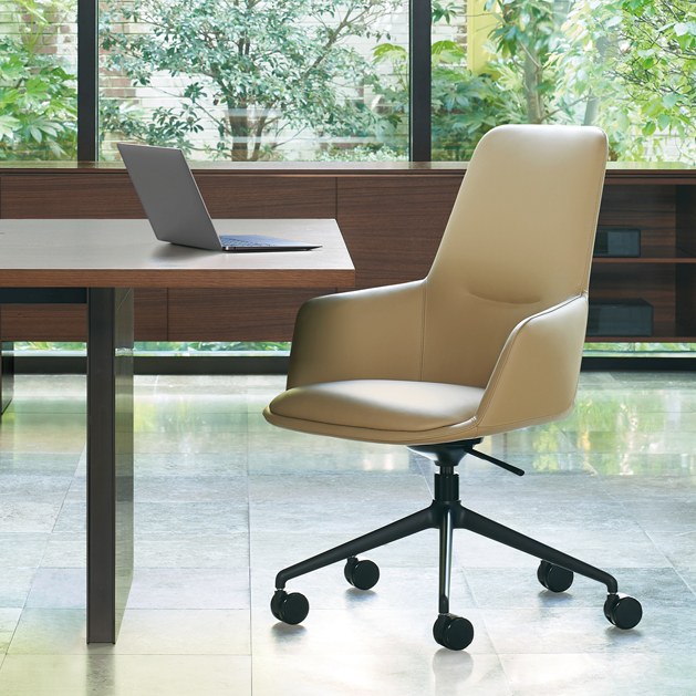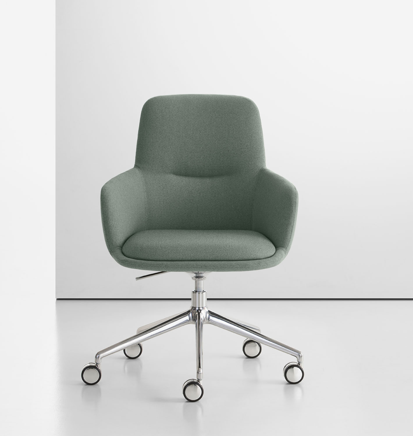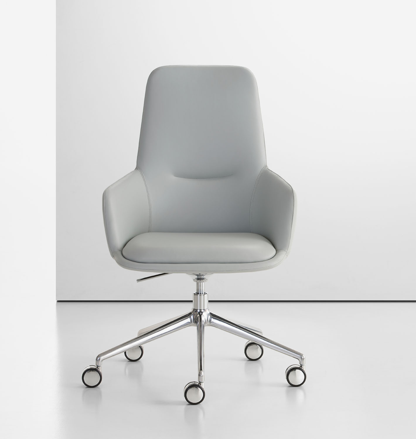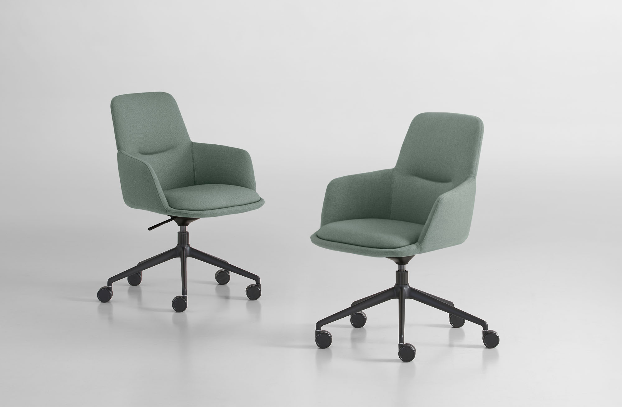The Kylo chair was designed with comfort in mind, resulting in a swivel with a cozy shell that envelops. Kylo is available as a low-profile mid-back or a high-back for added support. The sleek design highlights rounded curves and gentle lines.