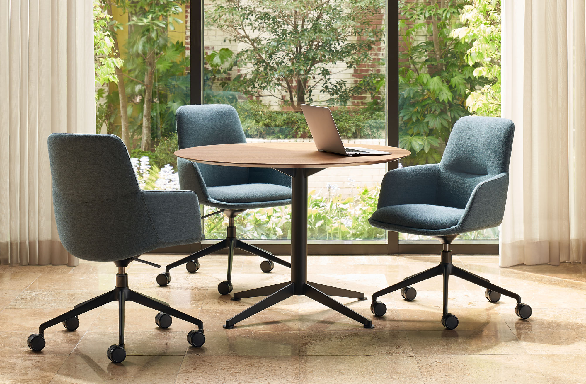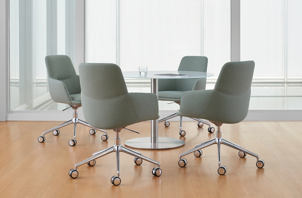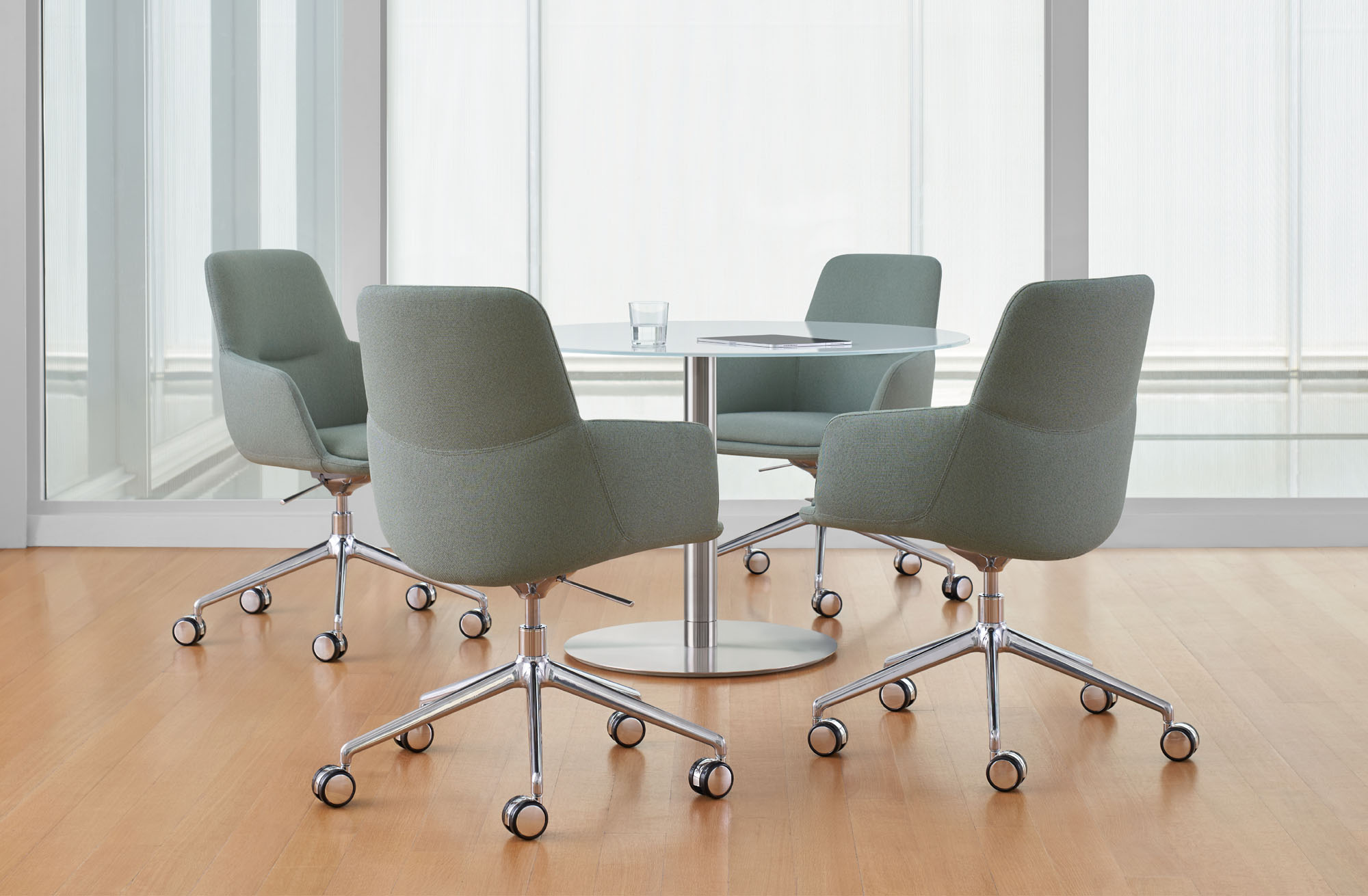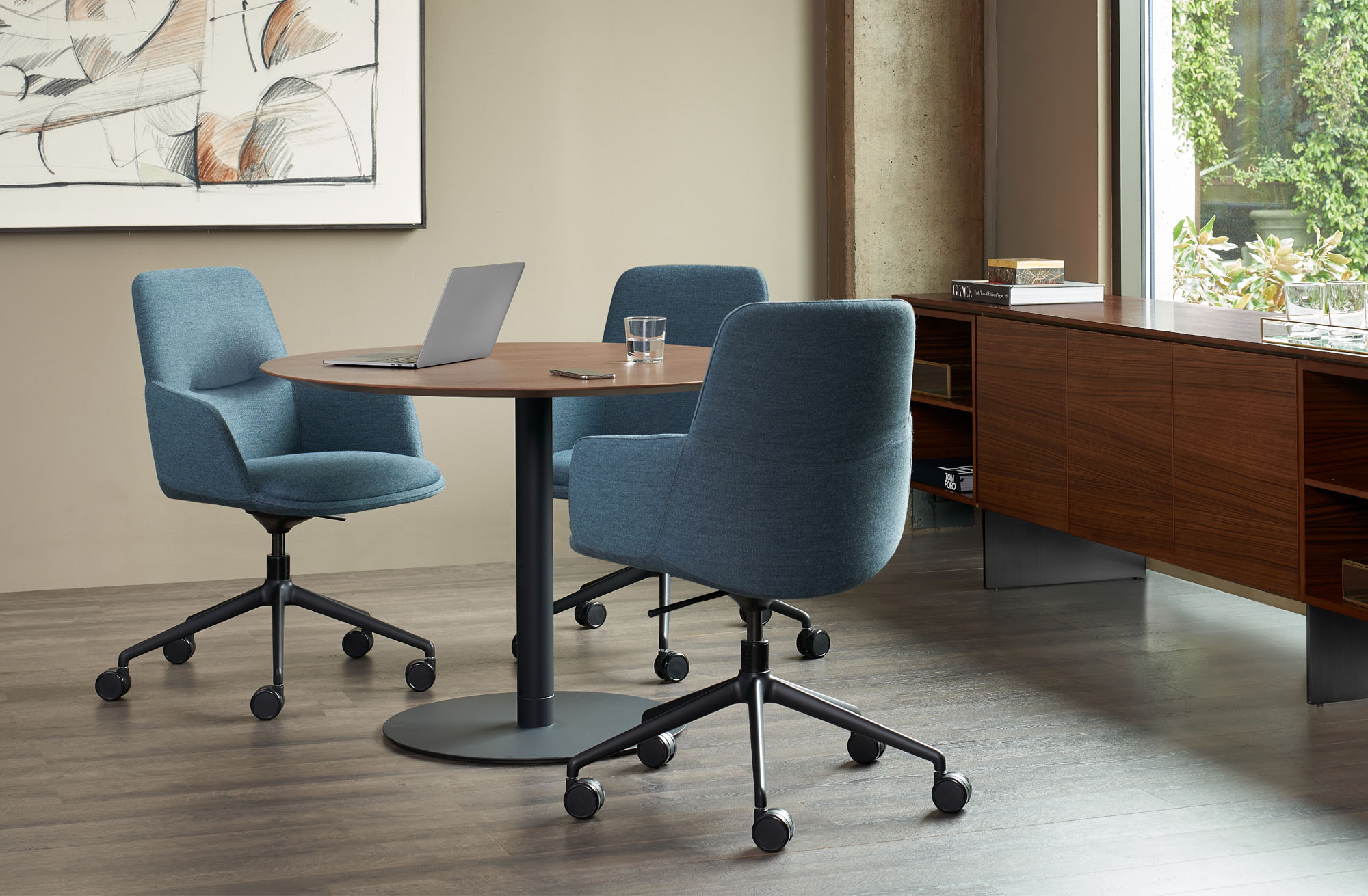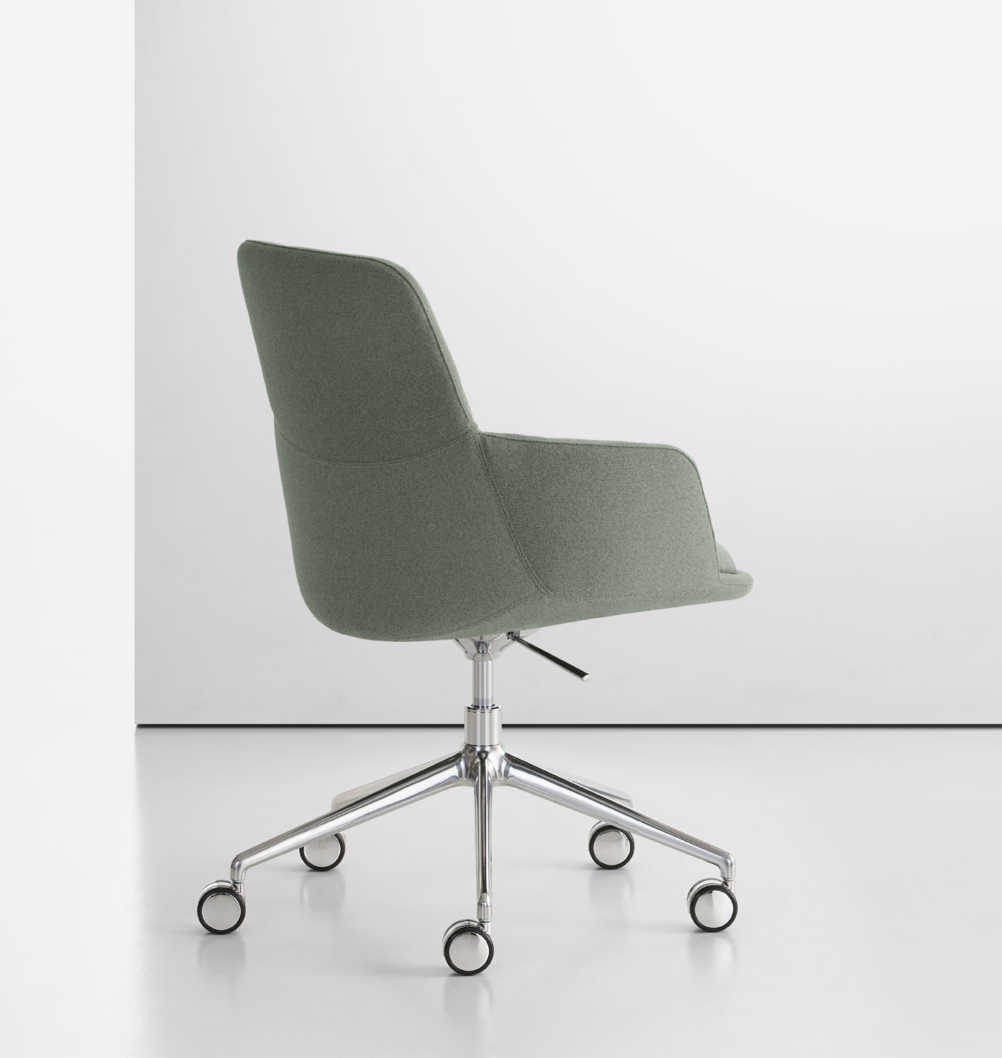 The Kylo chair was designed with comfort in mind, resulting in a swivel with a cozy shell that envelops. Kylo is available as a low-profile mid-back or a high-back for added support. The sleek design highlights rounded curves and gentle lines.