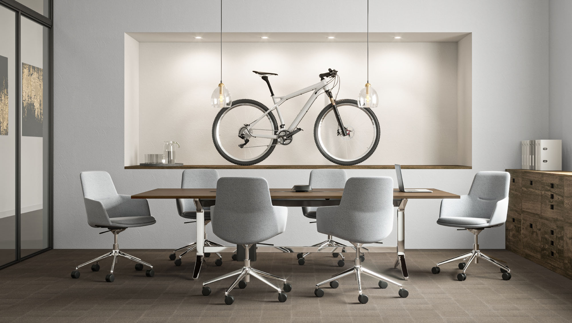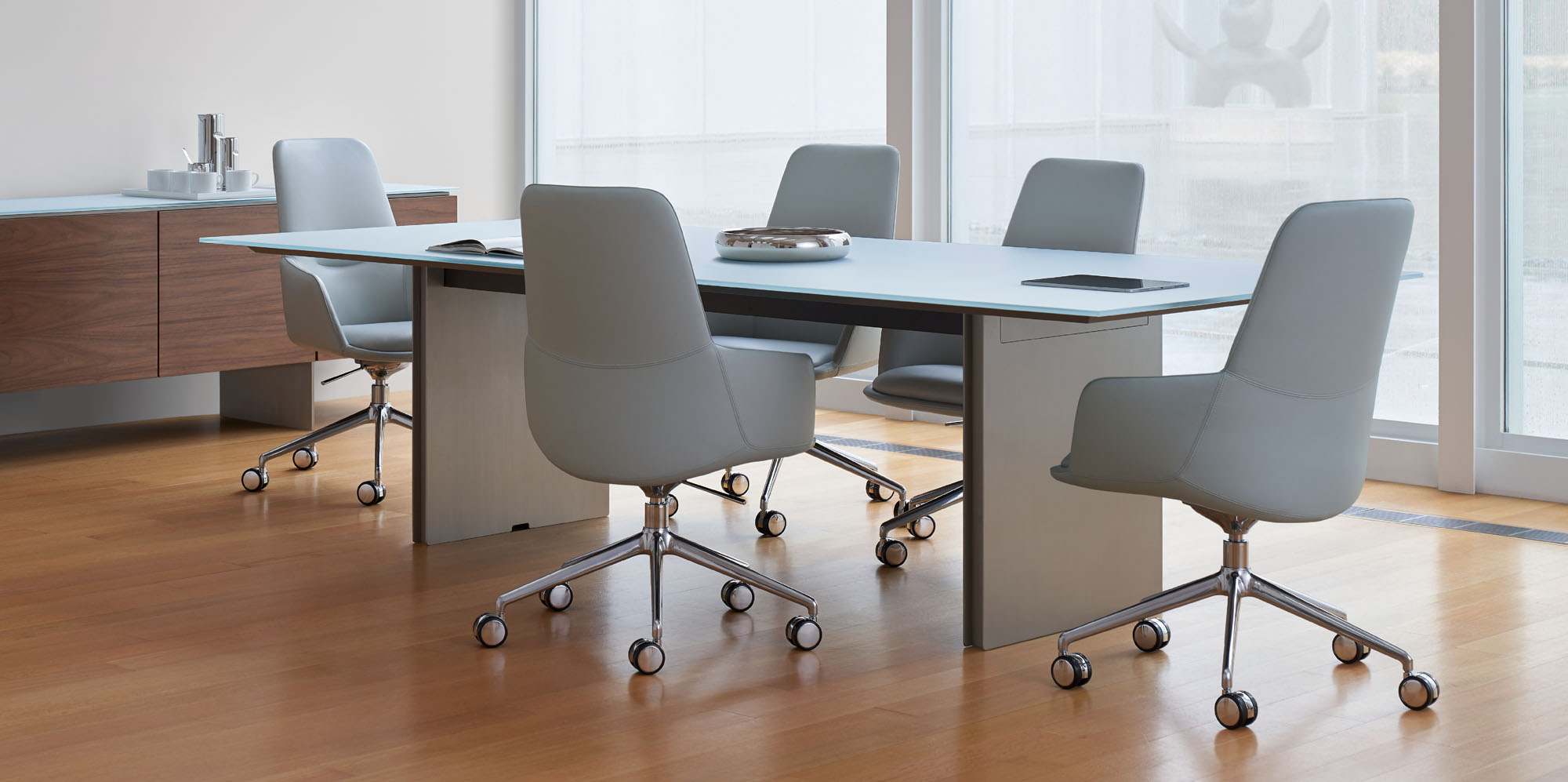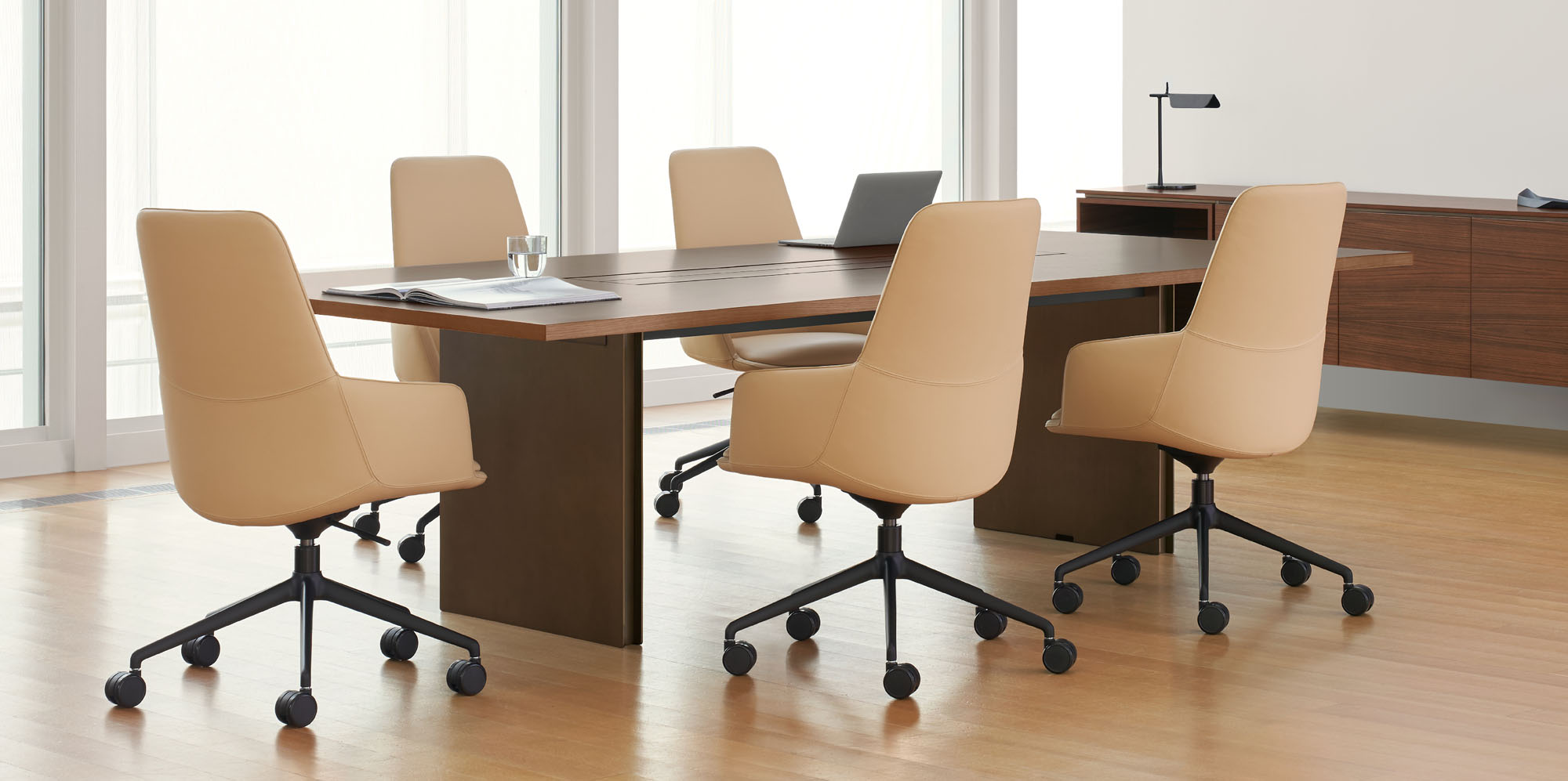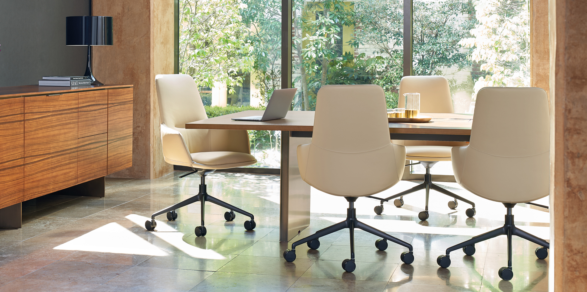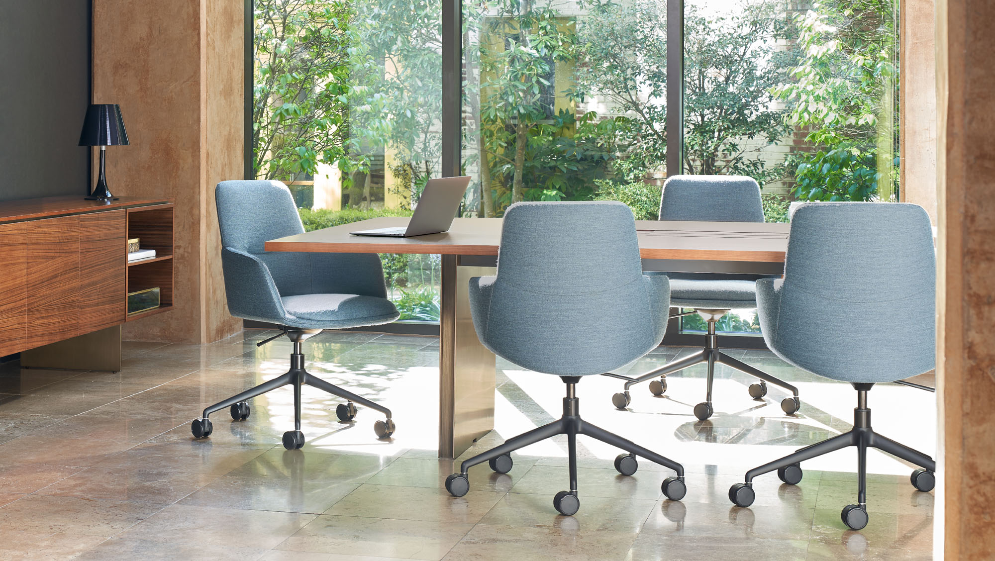 The Kylo chair was designed with comfort in mind, resulting in a swivel with a cozy shell that envelops. Kylo is available as a low-profile mid-back or a high-back for added support. The sleek design highlights rounded curves and gentle lines.