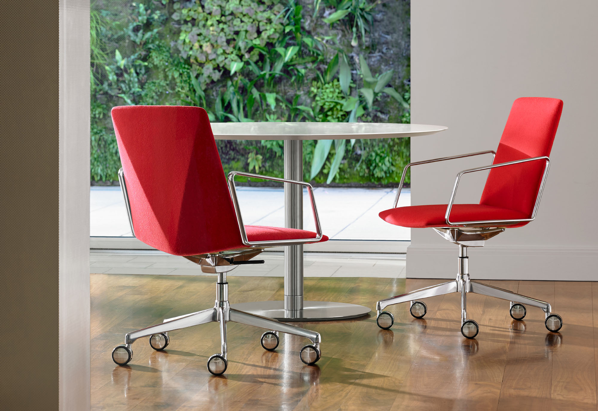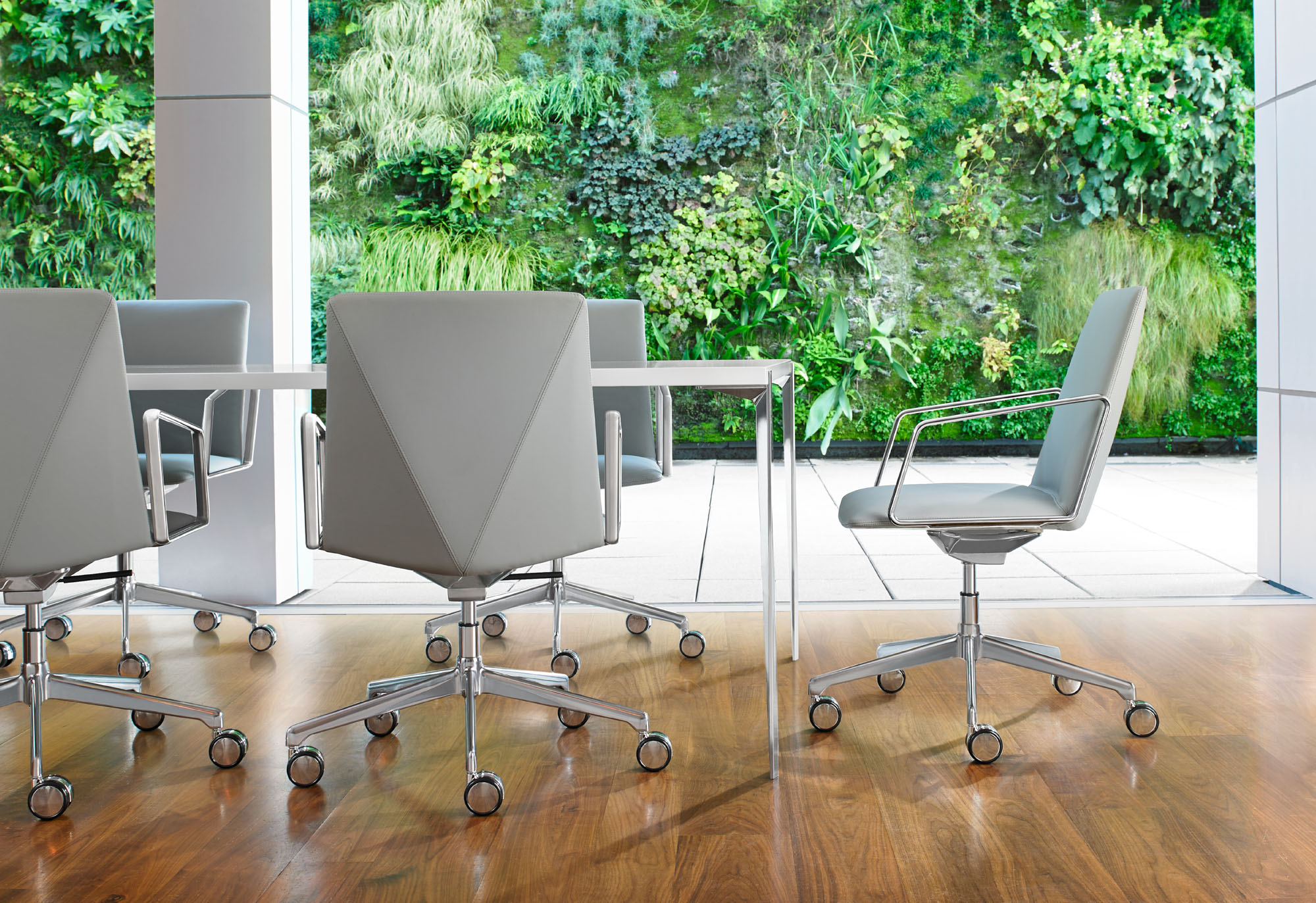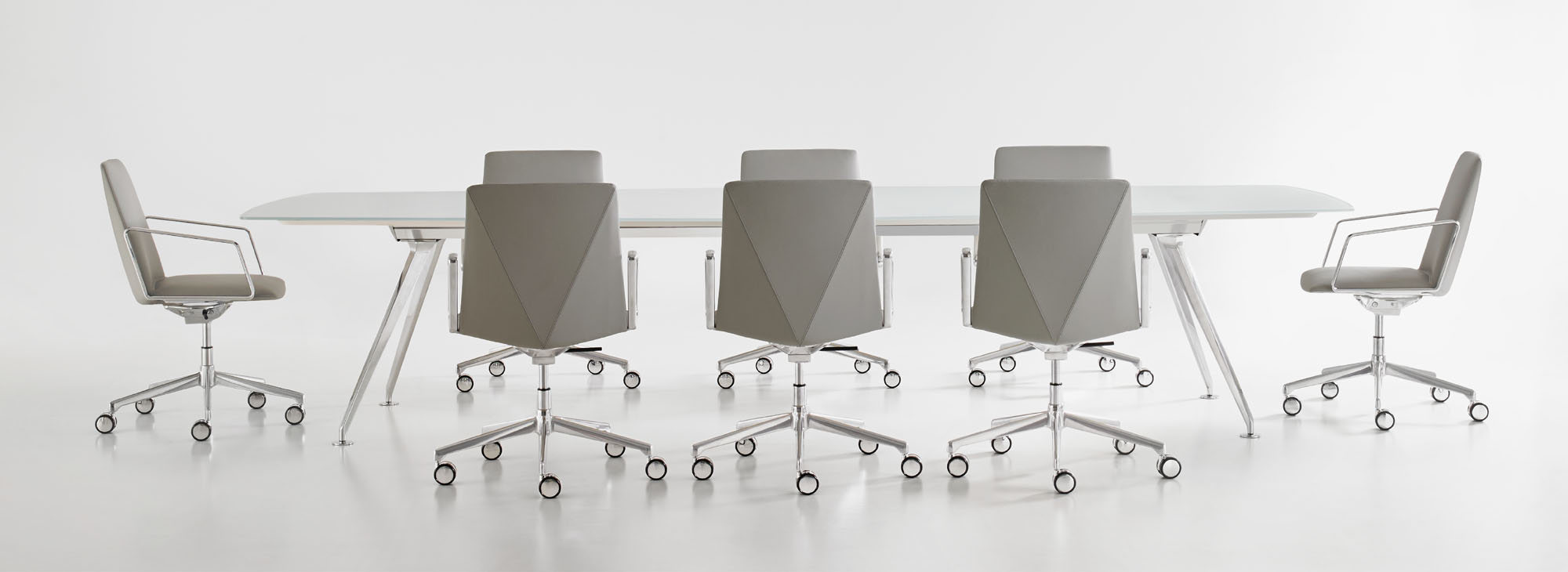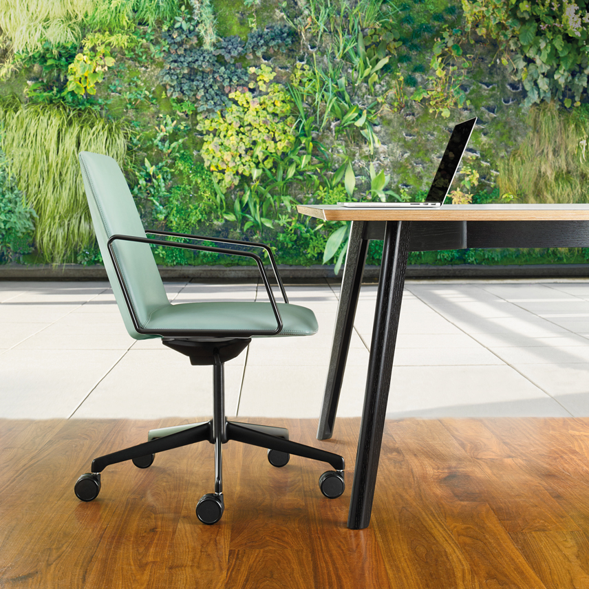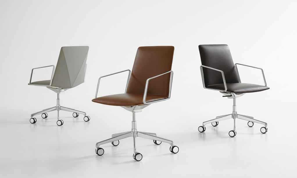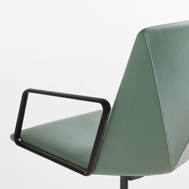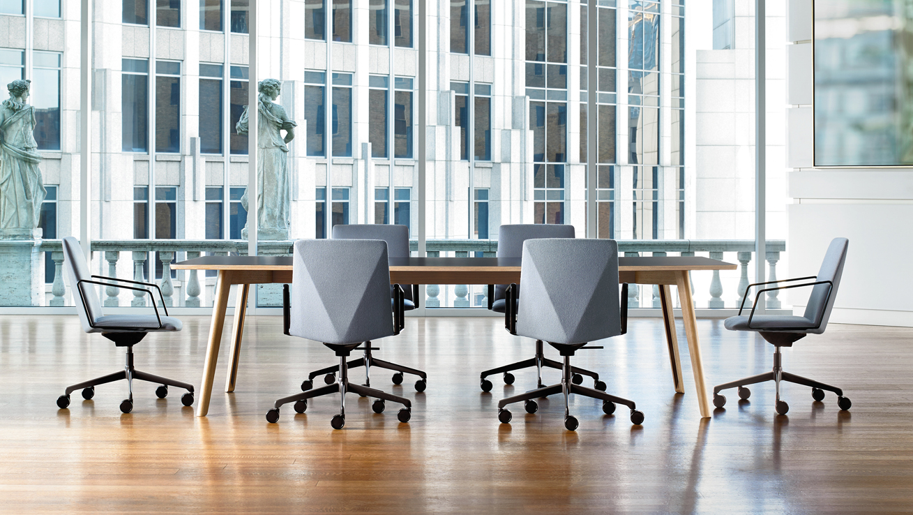 The refined and gently faceted exterior is not dominating. L.A.M.’s organic seat juxtaposed with the angular back makes it an engaging chair when viewed from any perspective and offers a distinctive visual interest when used in conference and boardroom settings.