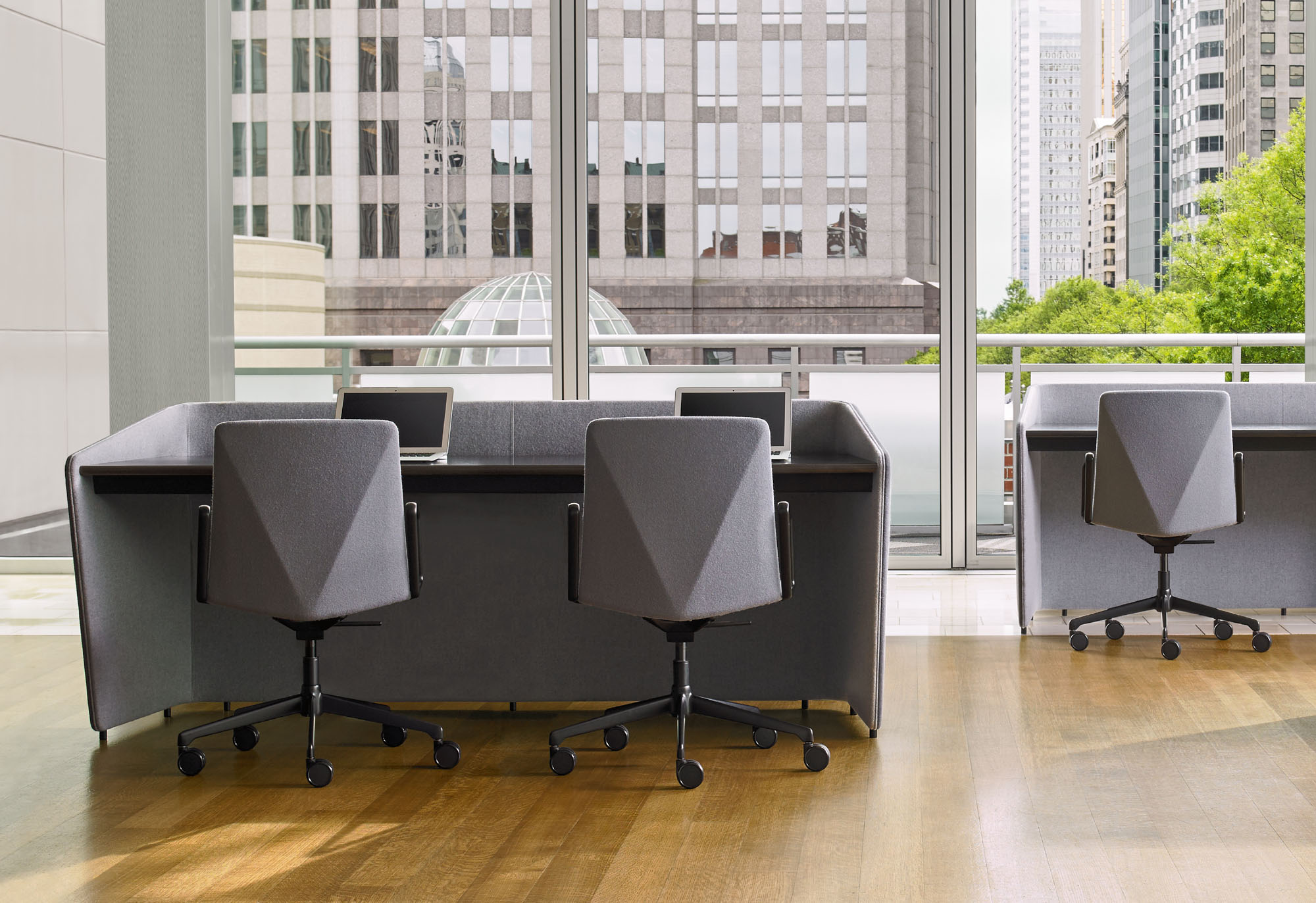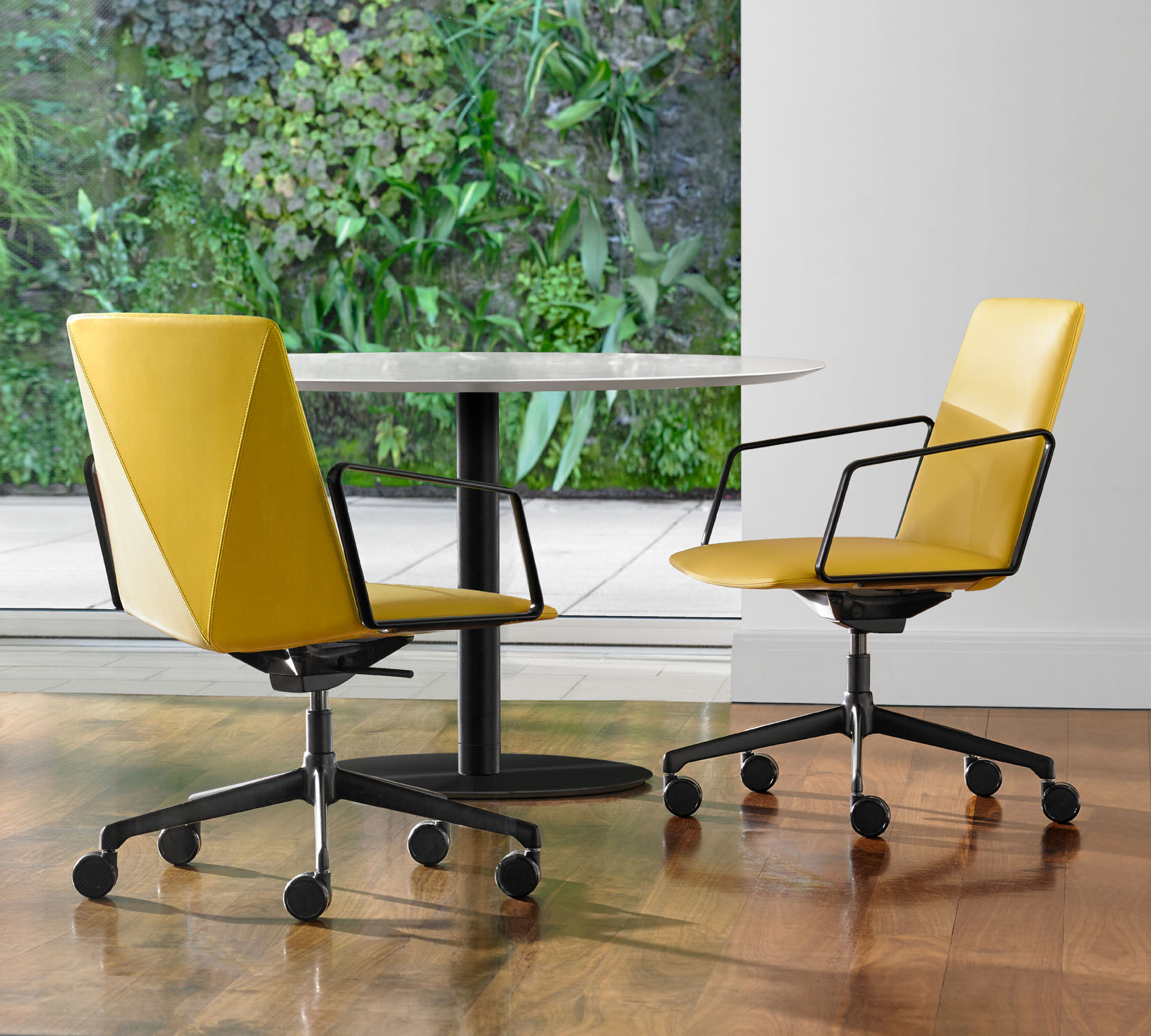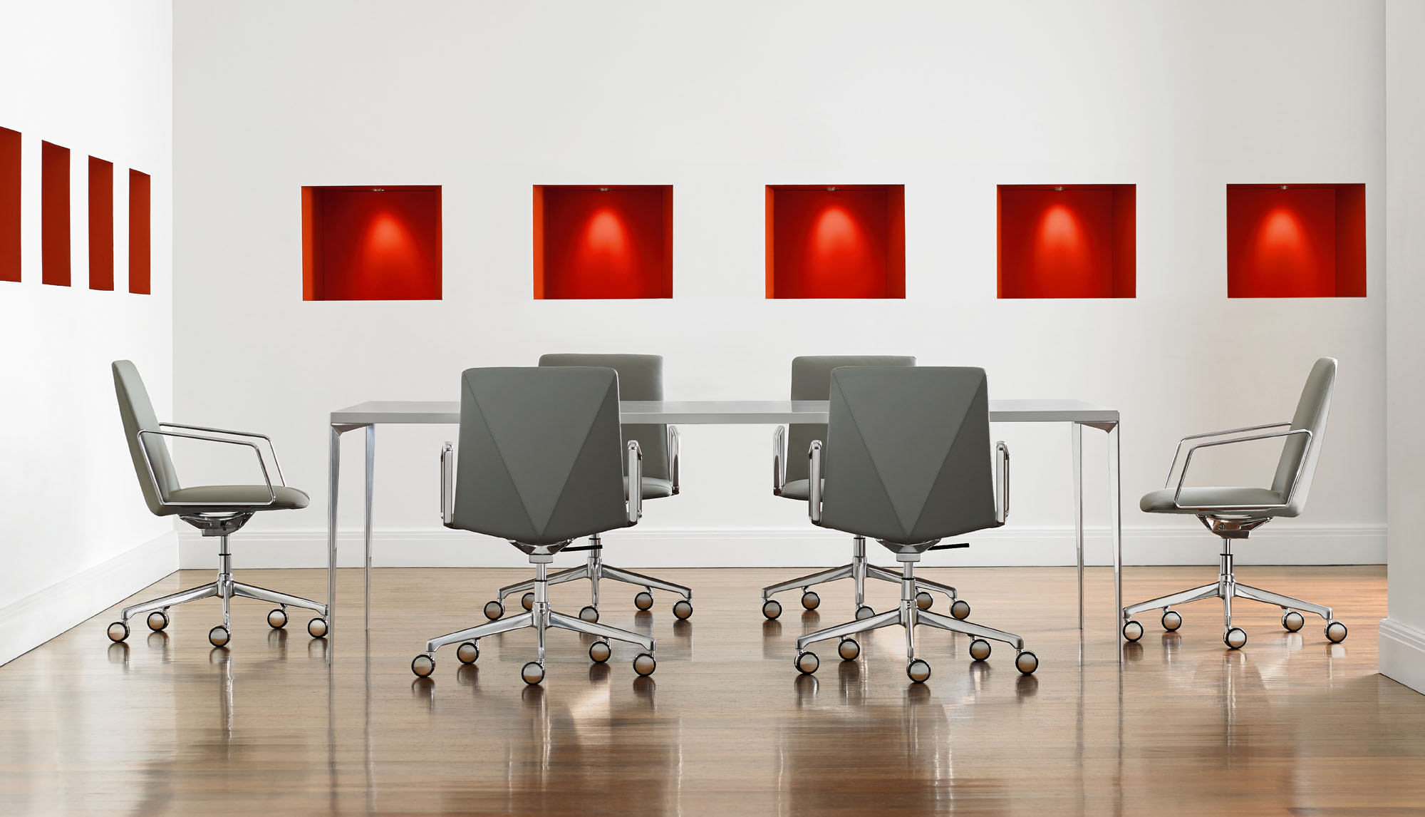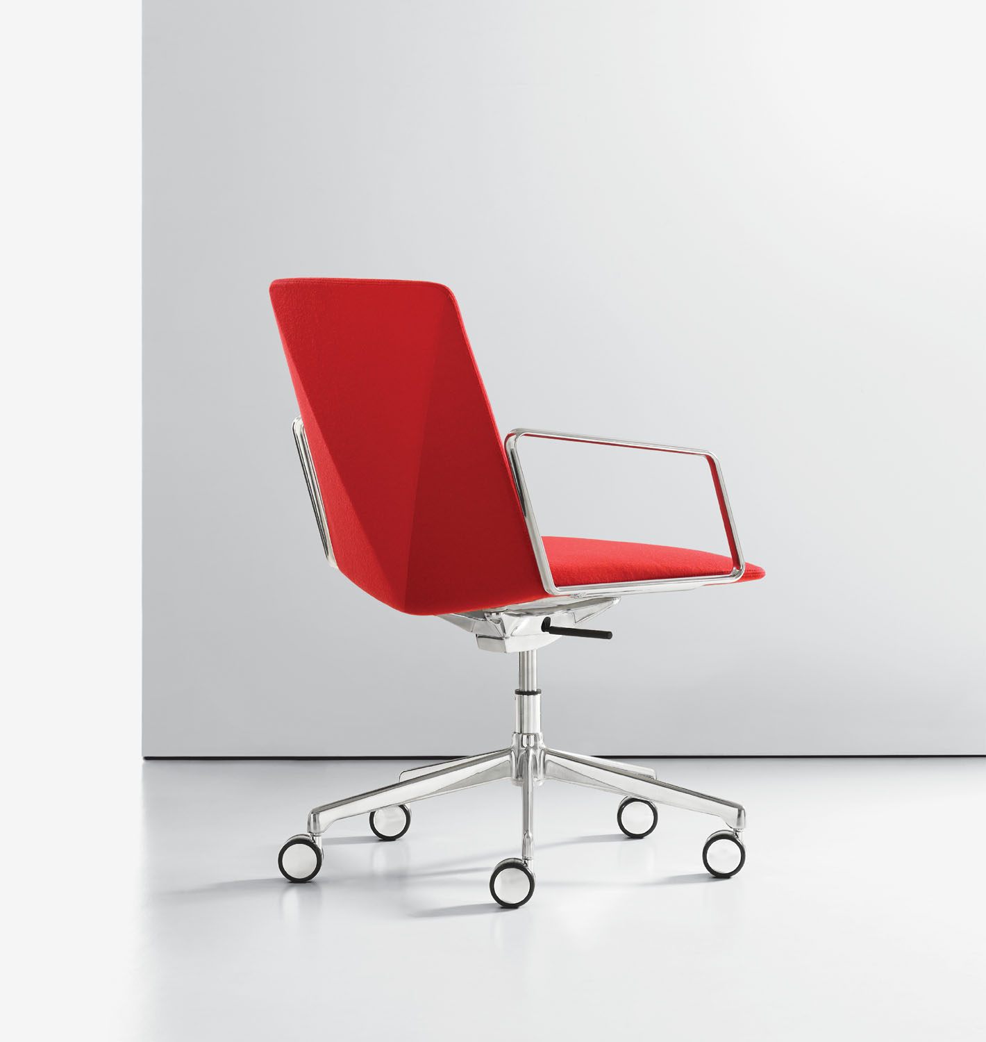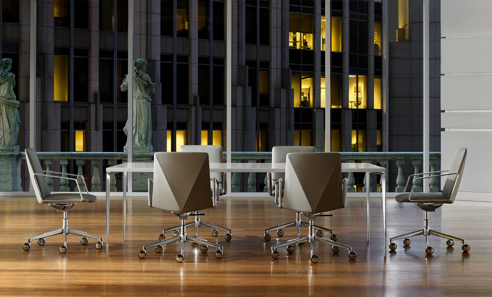 The refined and gently faceted exterior is not dominating. L.A.M.’s organic seat juxtaposed with the angular back makes it an engaging chair when viewed from any perspective and offers a distinctive visual interest when used in conference and boardroom settings.