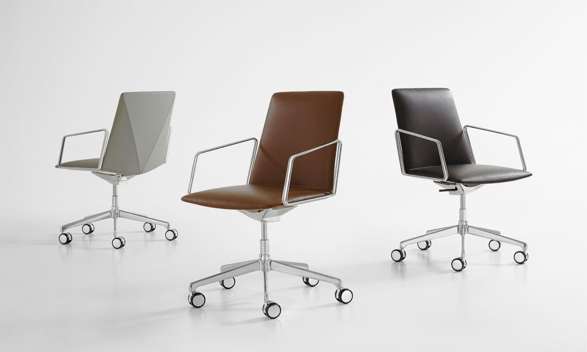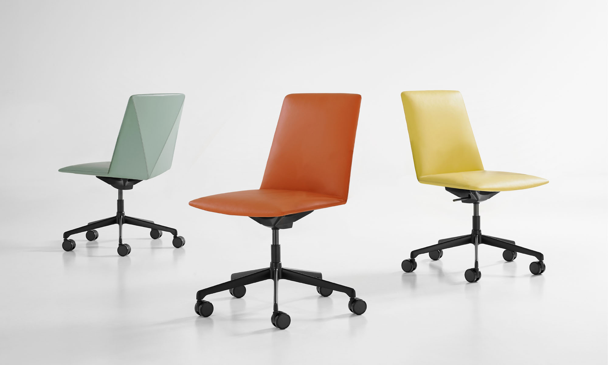 The five-star base is offered in polished aluminum or matte black powder coat finish and integrates a swivel tilt mechanism and pneumatic lift for adjustable heights.