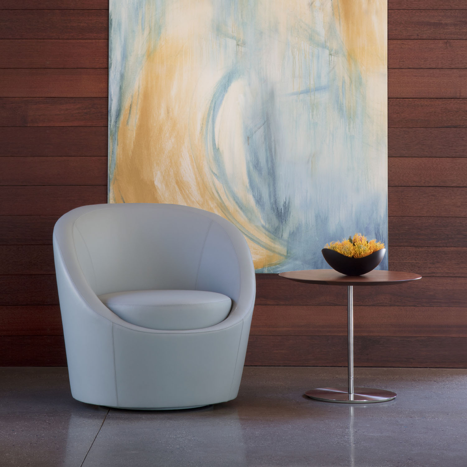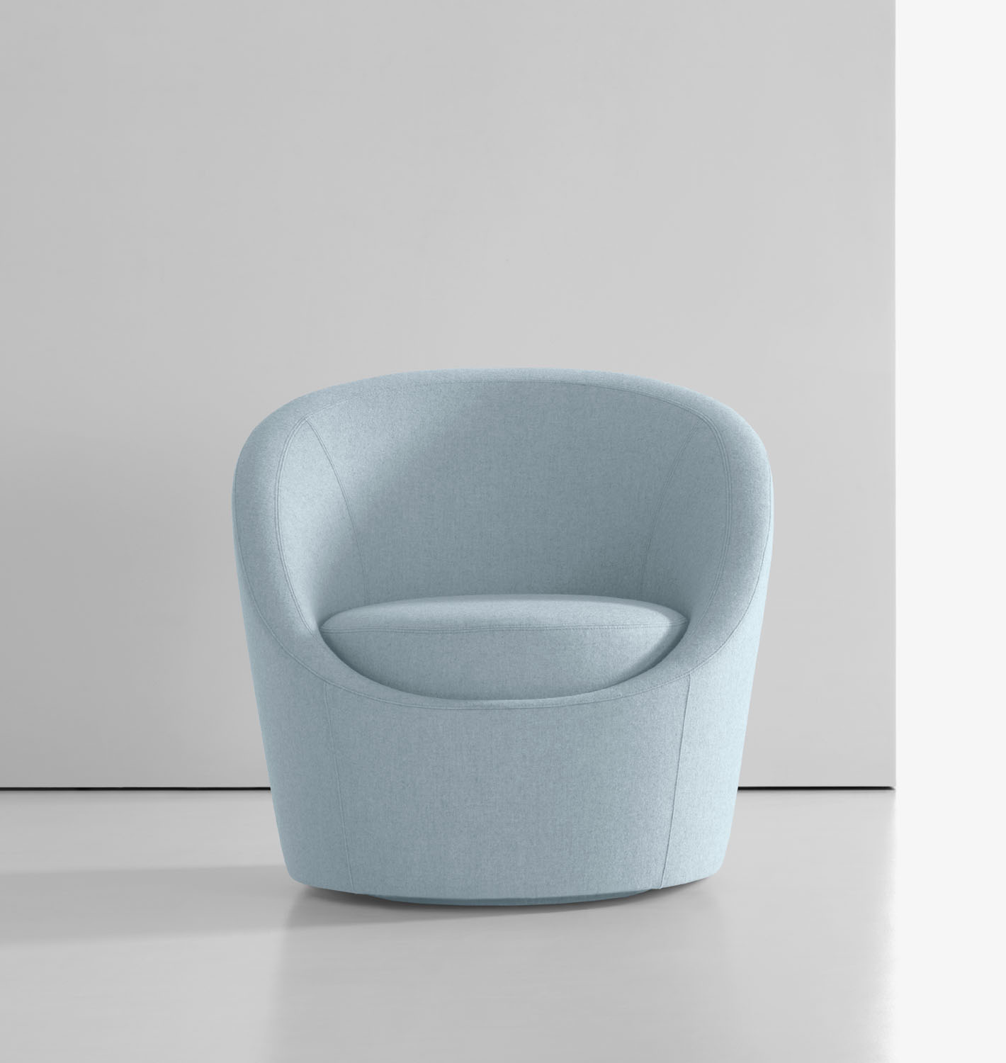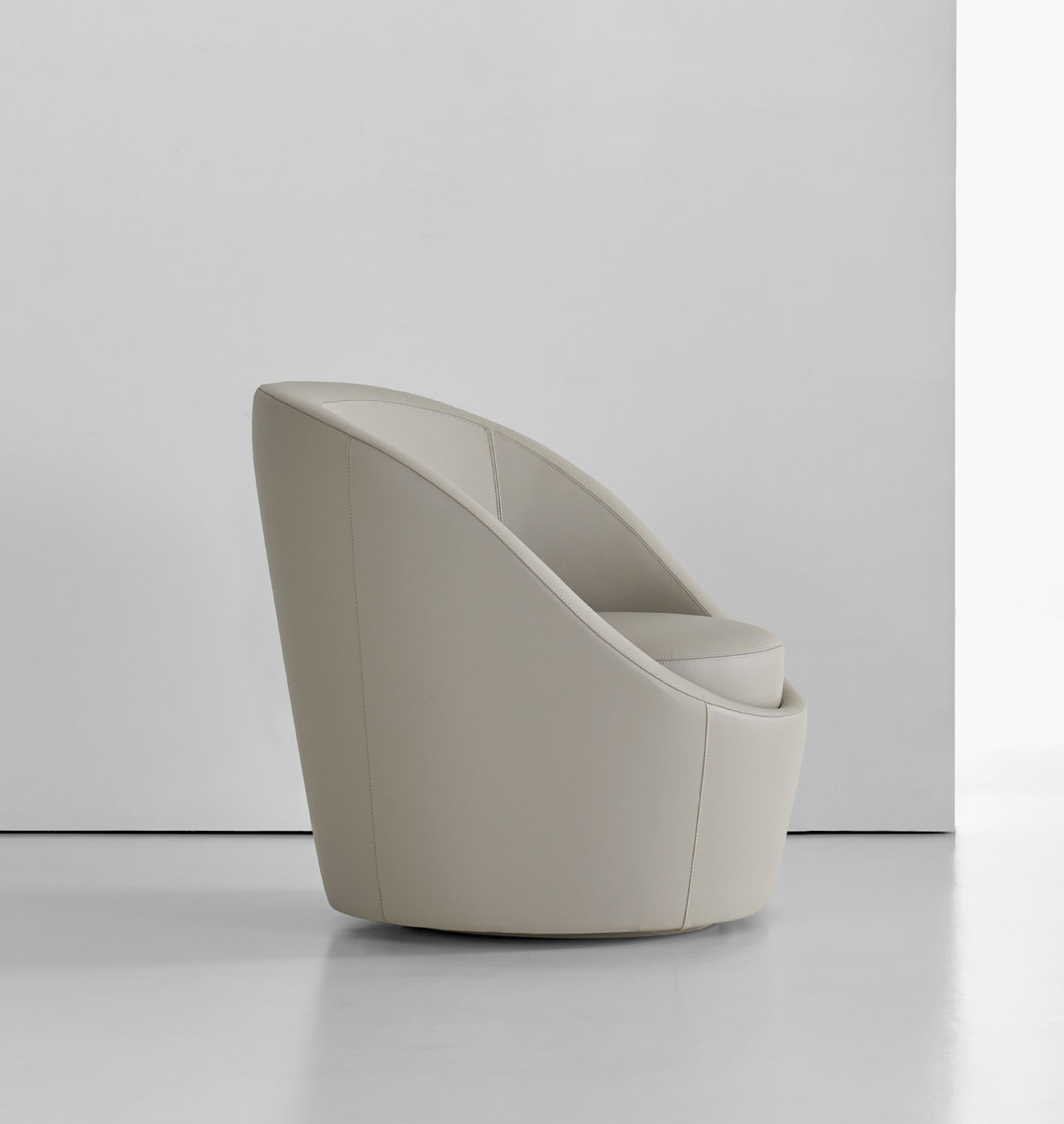 The Lily chair takes its cue from the sinuous form of the lily pad. It features a continuous unbroken line that traces the exterior of the chair, which encases a soft circular cushion much like the center of a blooming flower. The chair subtly converges from an open bloom at the top to a perfect circle at the base.