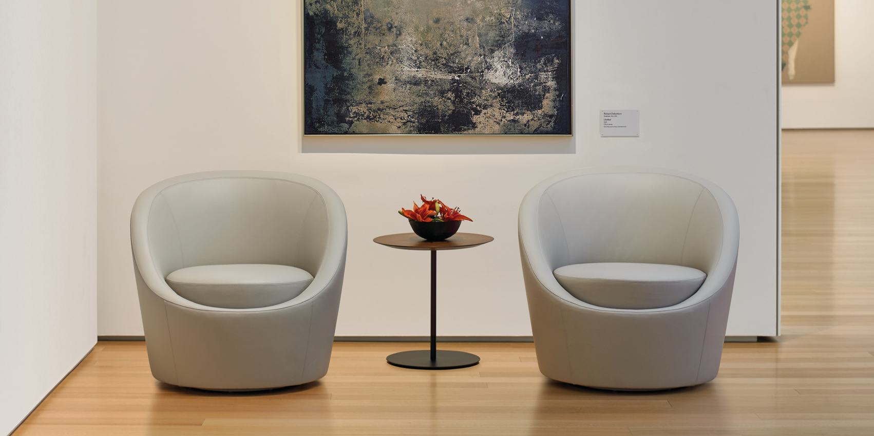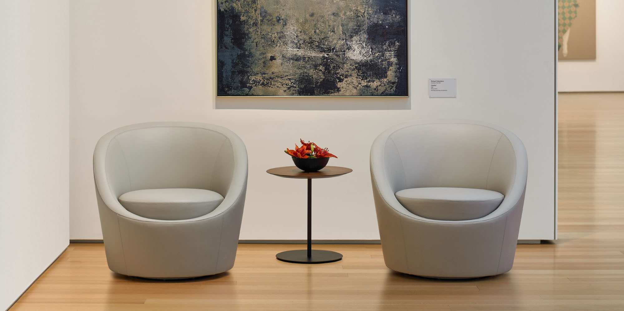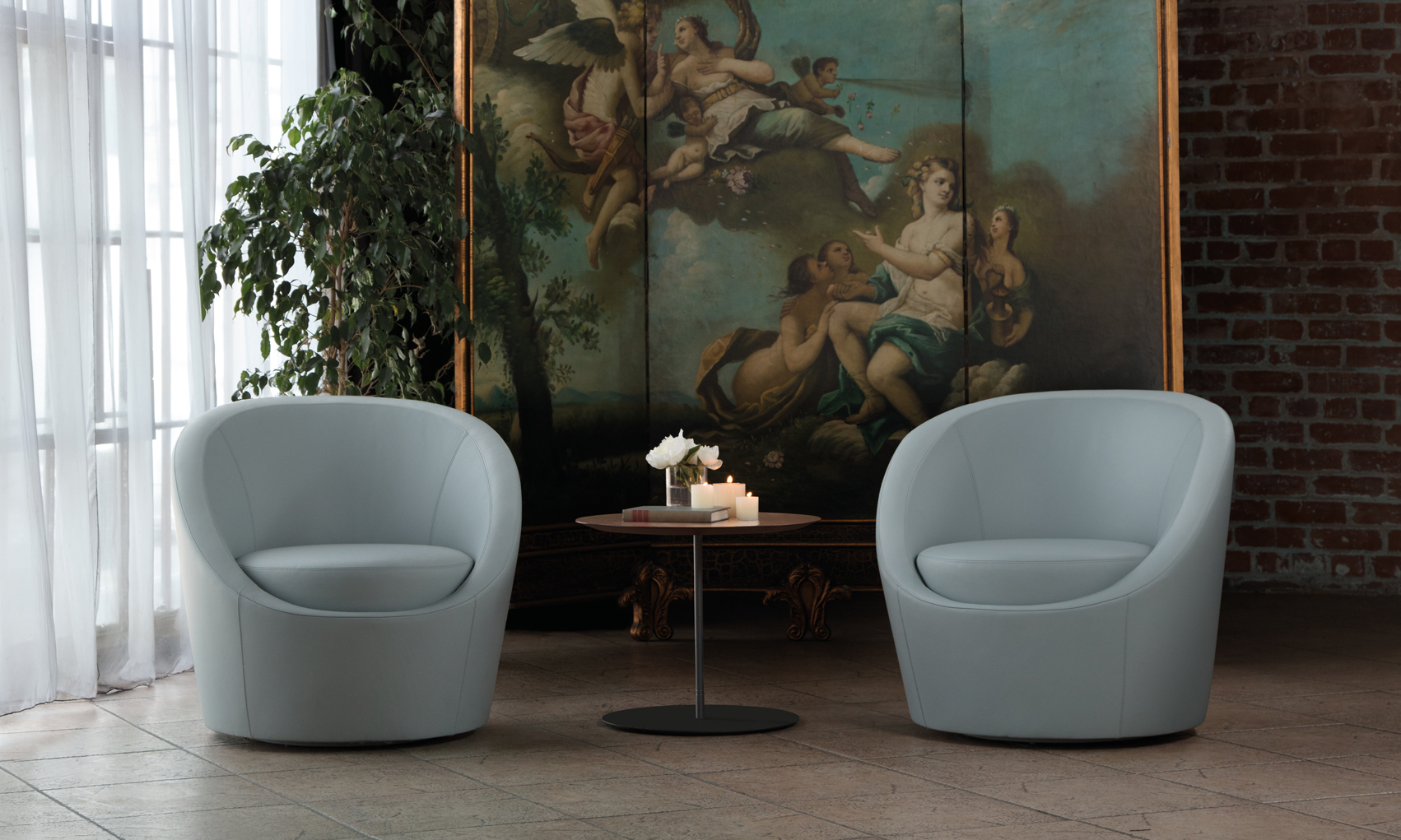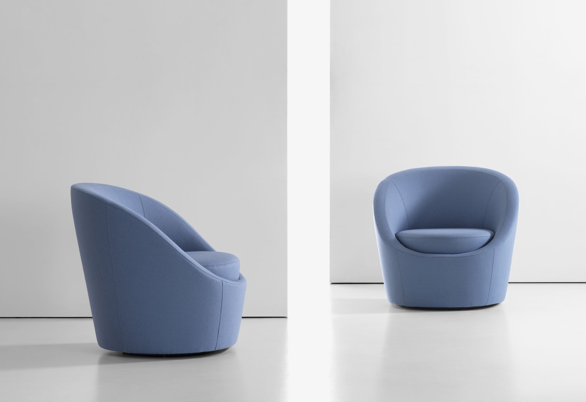 The Lily chair takes its cue from the sinuous form of the lily pad. It features a continuous unbroken line that traces the exterior of the chair, which encases a soft circular cushion much like the center of a blooming flower. The chair subtly converges from an open bloom at the top to a perfect circle at the base.