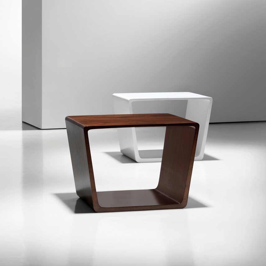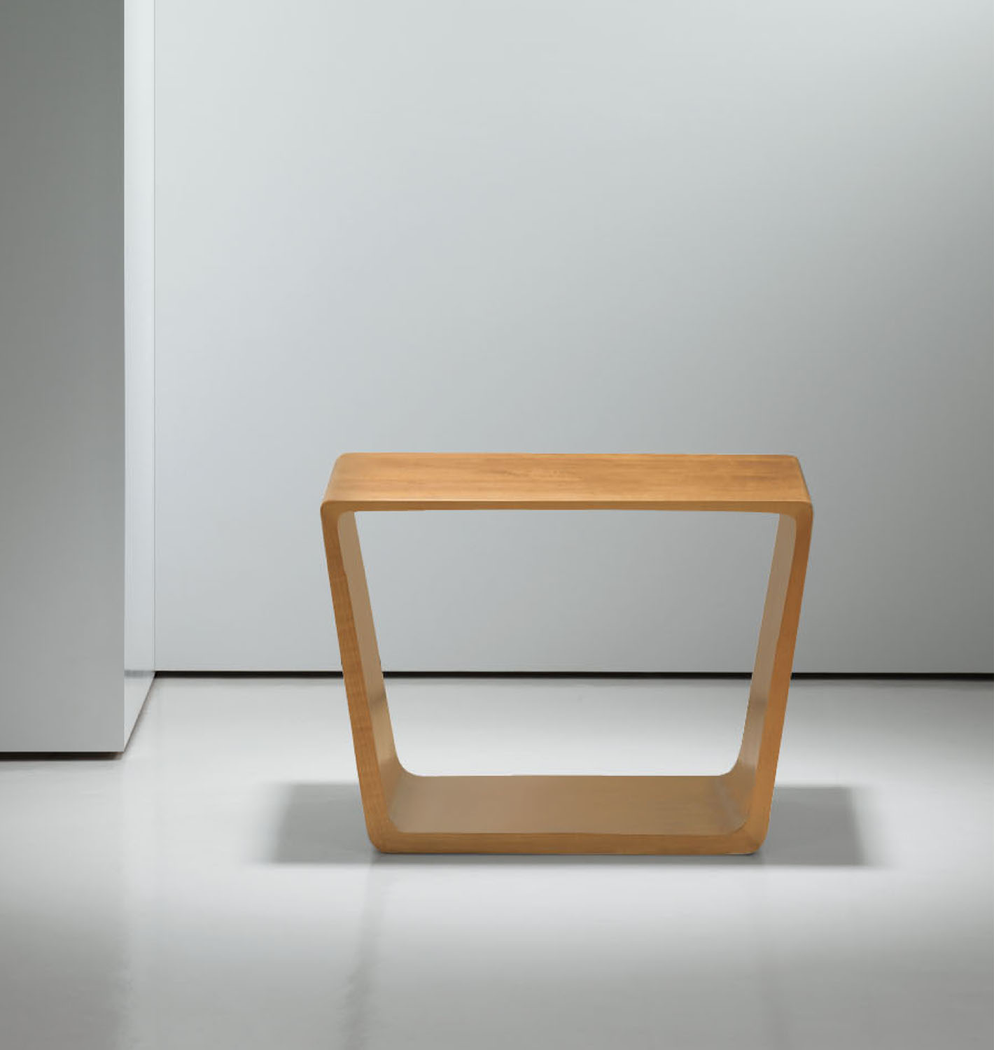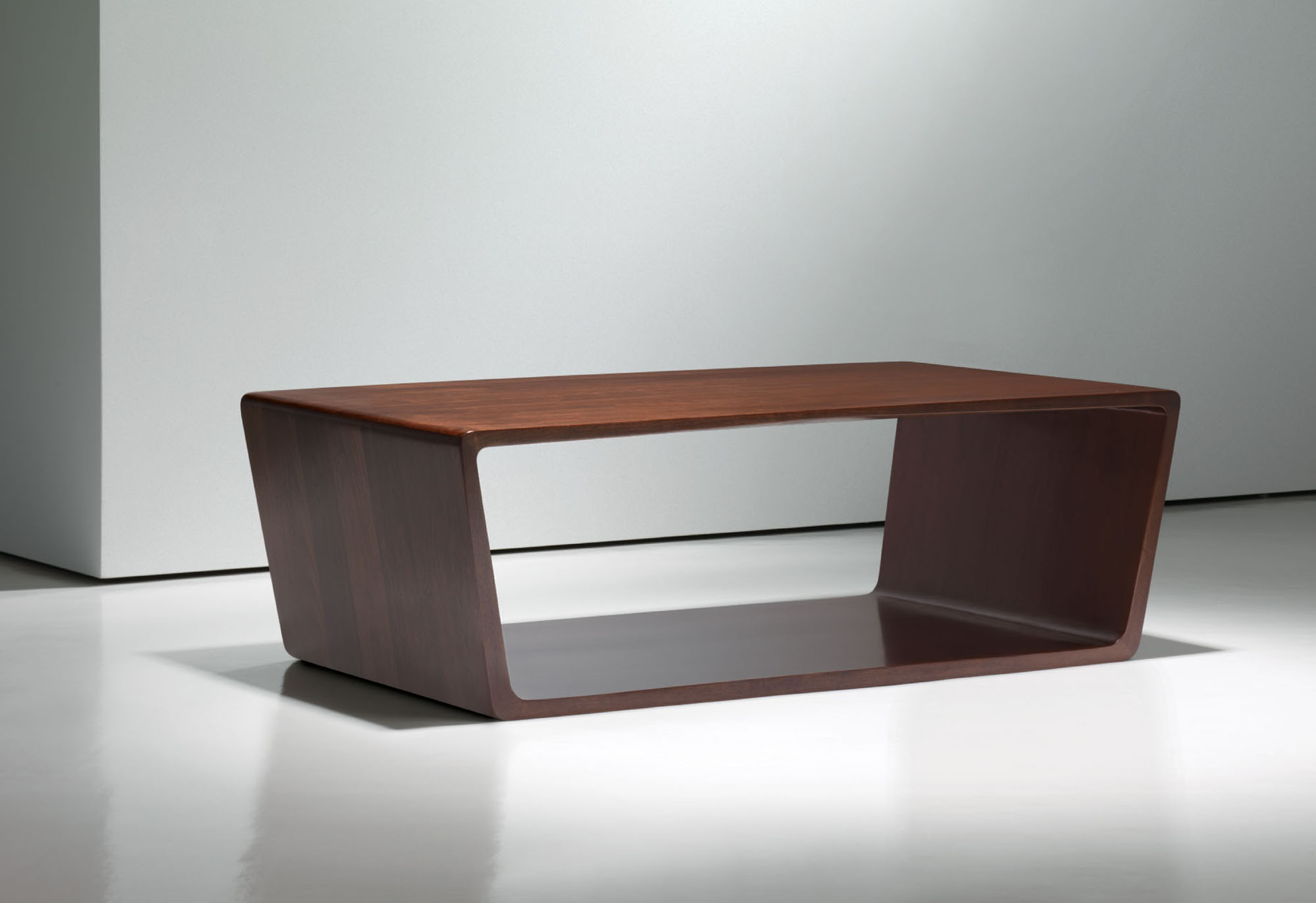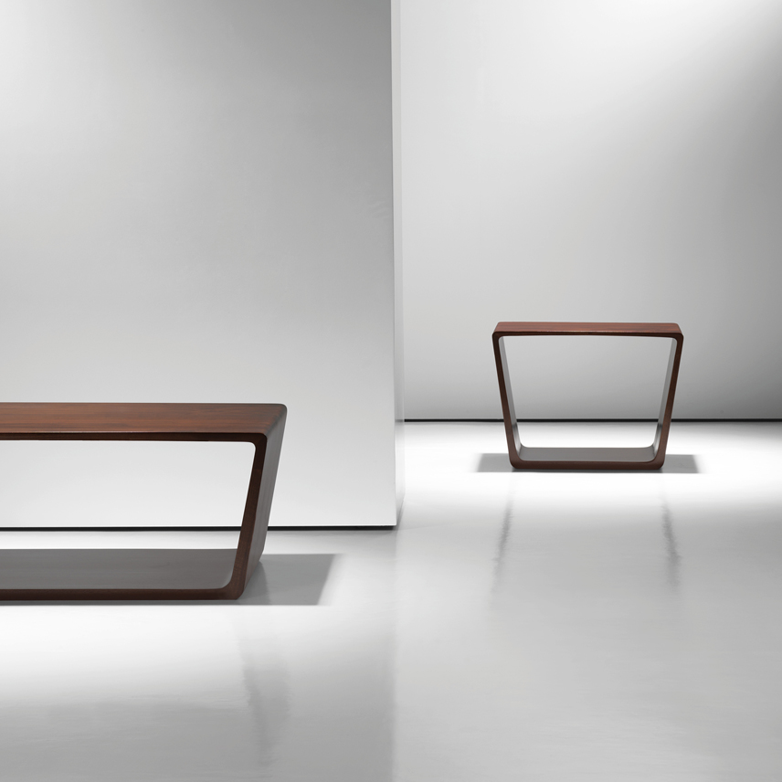 Designed as a seemingly continuous wood loop, Linc tables feature gentle curves with a subtle angular expression. Linc, available in two sizes, exhibits tapering platforms constructed of solid American maple or walnut.