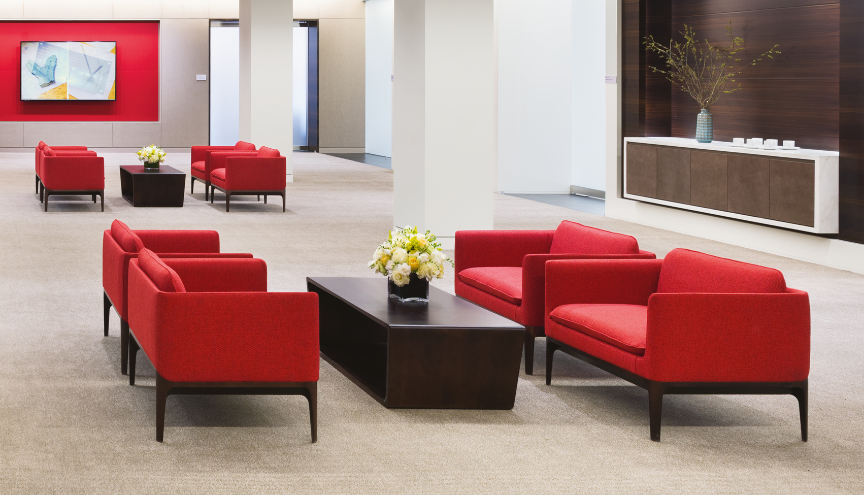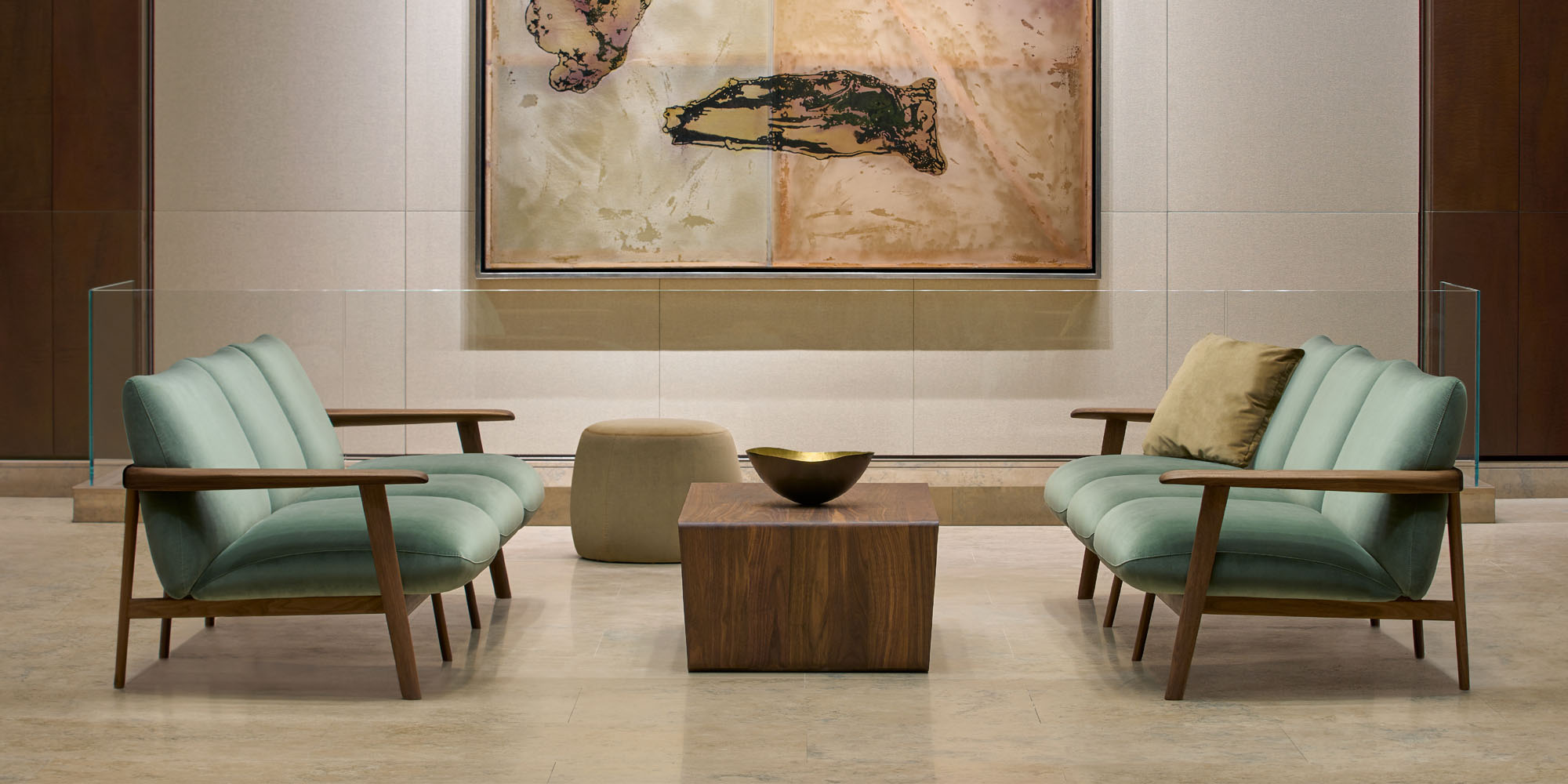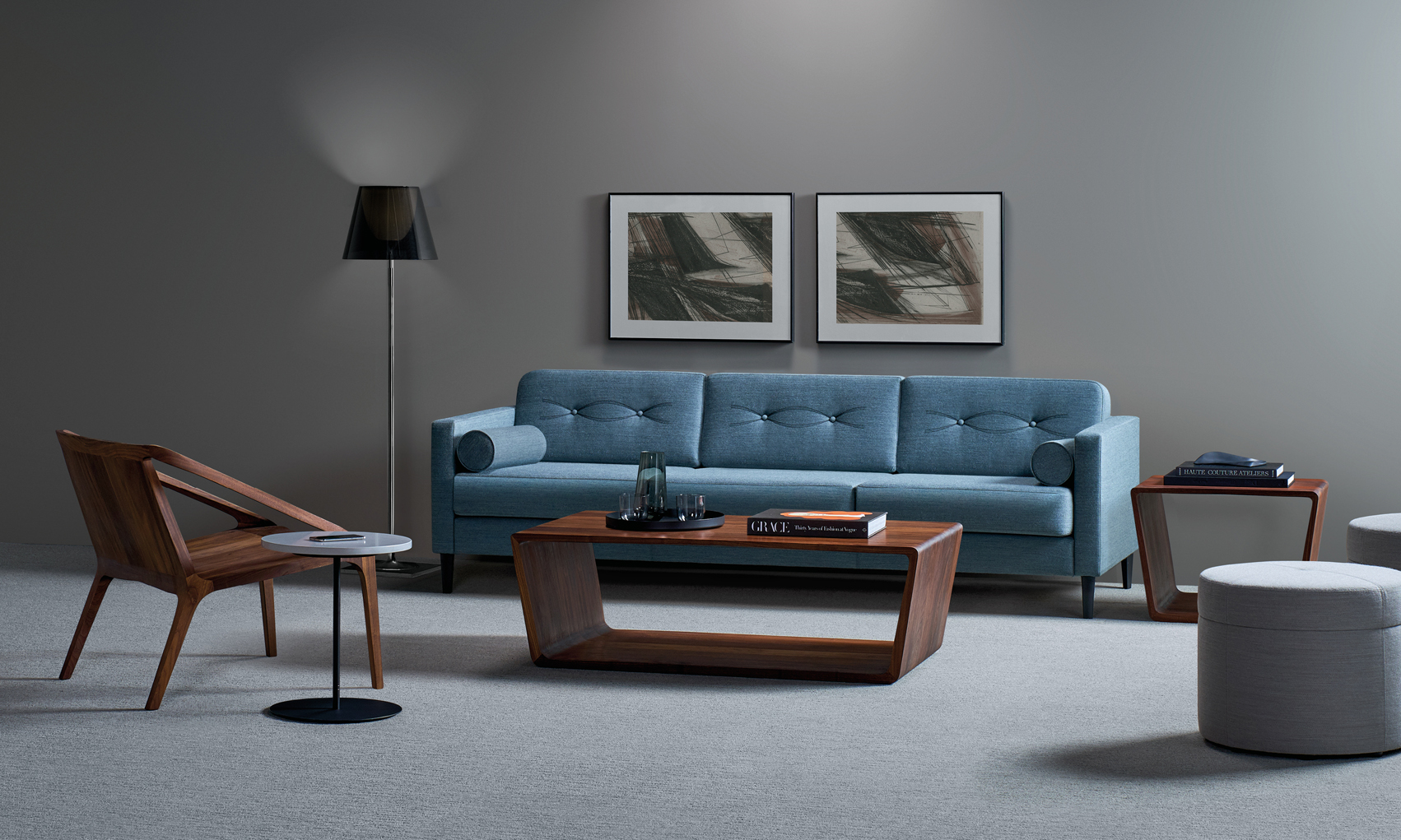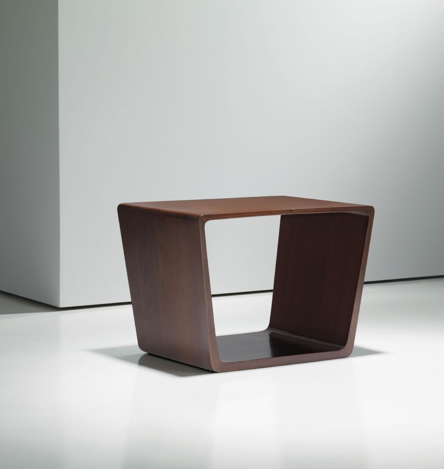 Designed as a seemingly continuous wood loop, Linc tables feature gentle curves with a subtle angular expression. Linc, available in two sizes, exhibits tapering platforms constructed of solid American maple or walnut.