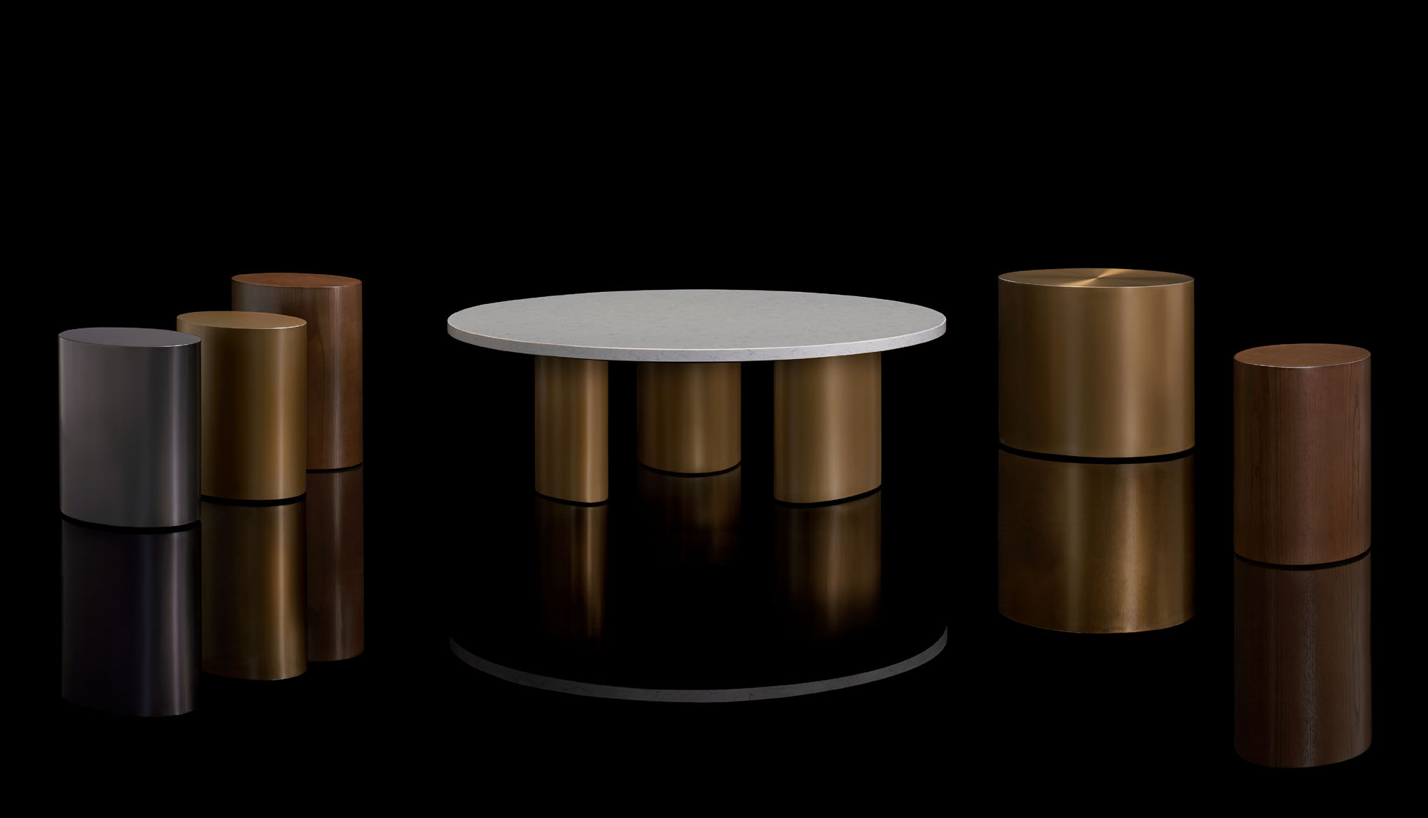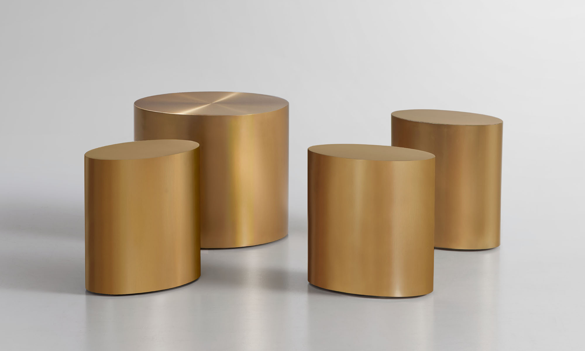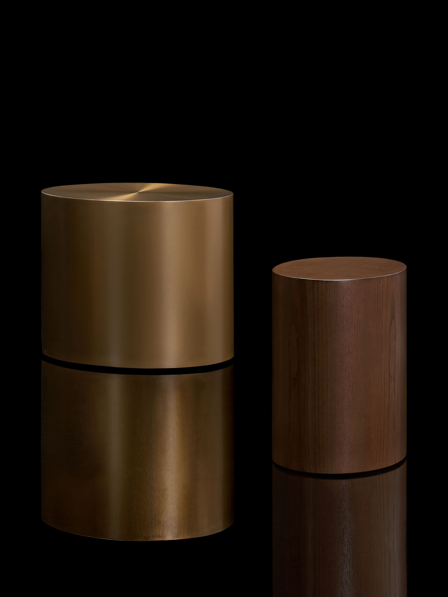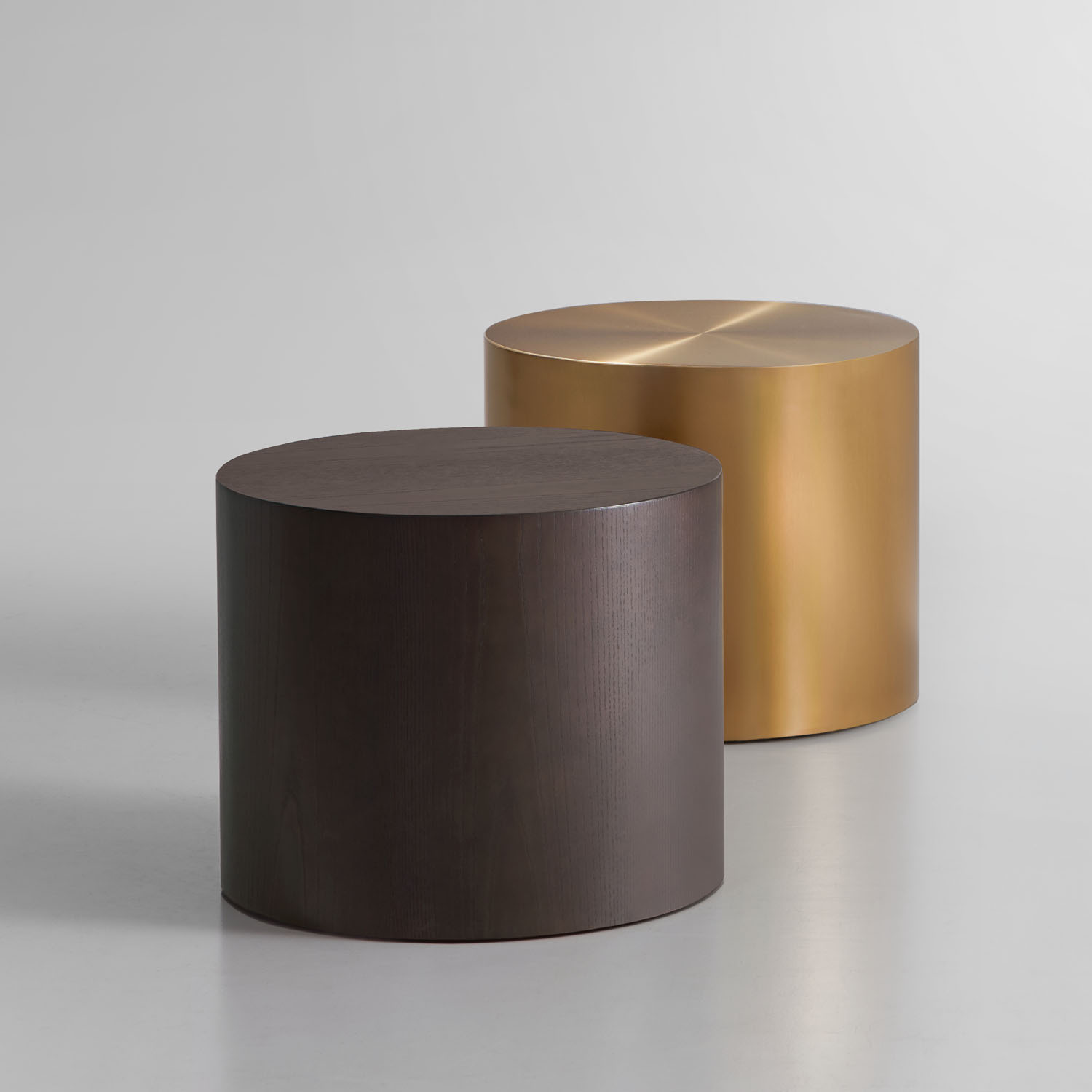 The fully enclosed Marlowe drum tables are available in ash veneer and brushed stainless steel in two finishes: brushed graphite and brushed brass.