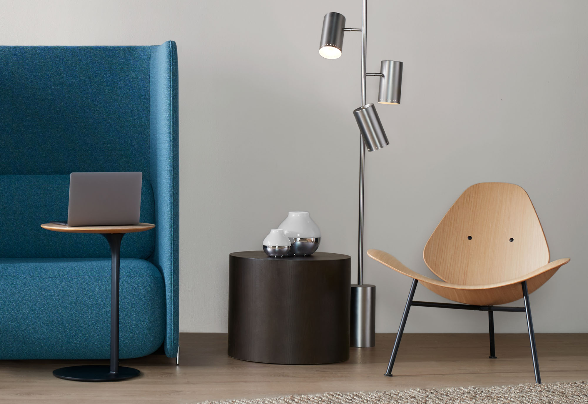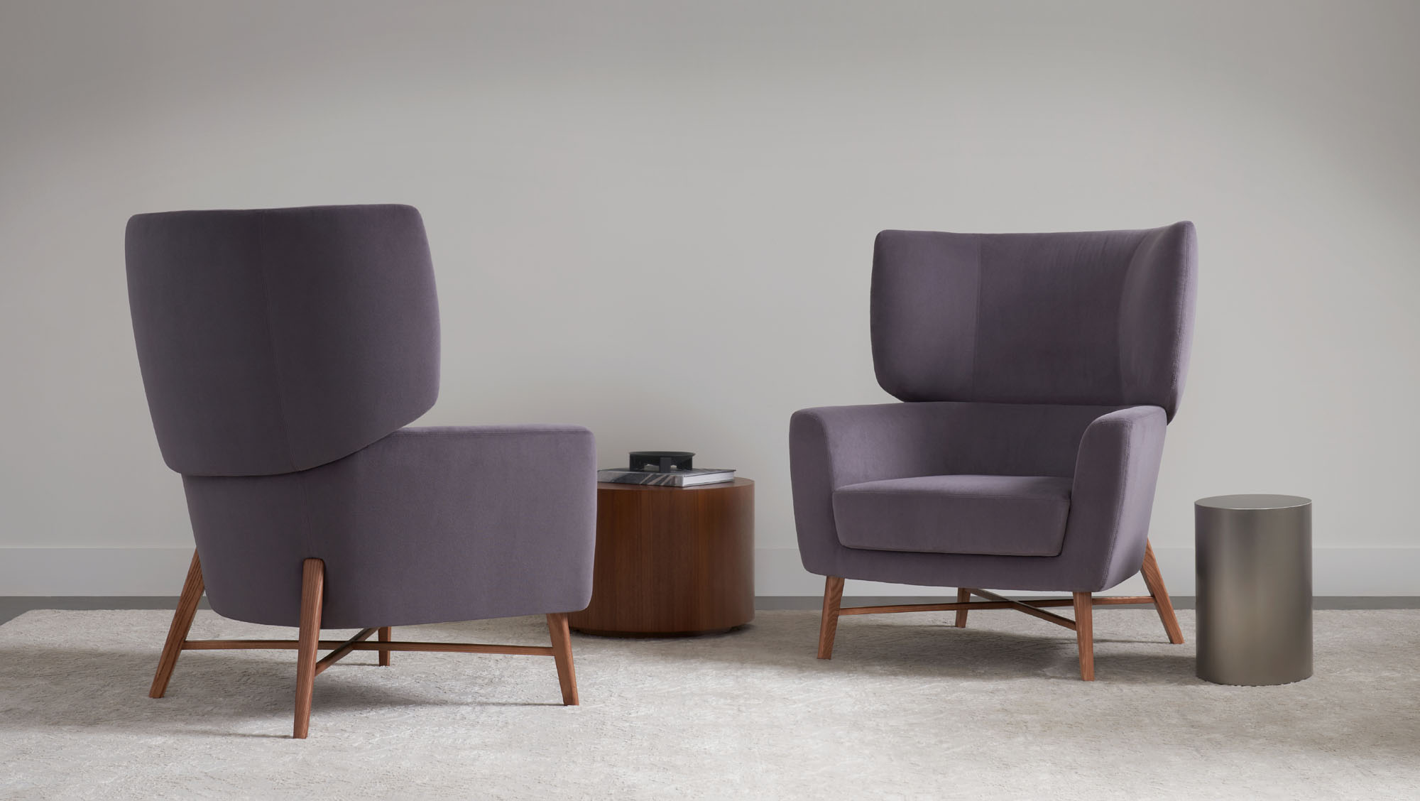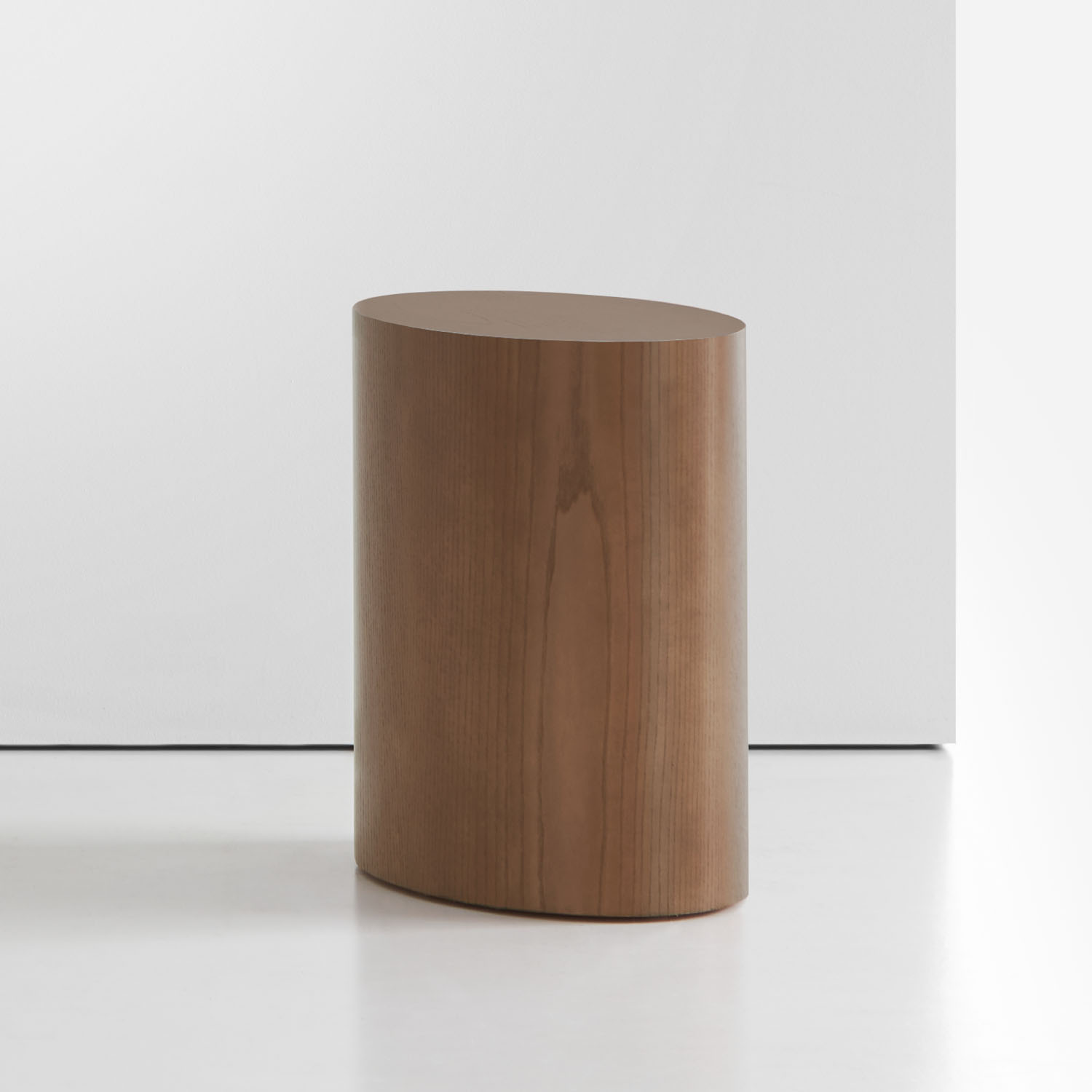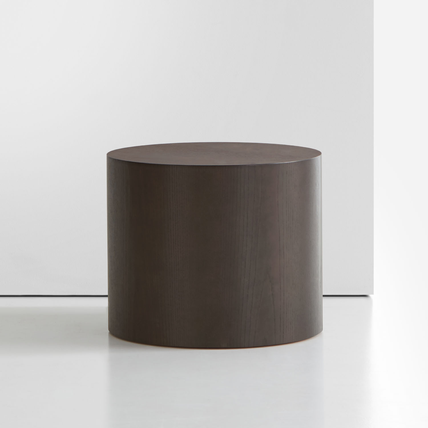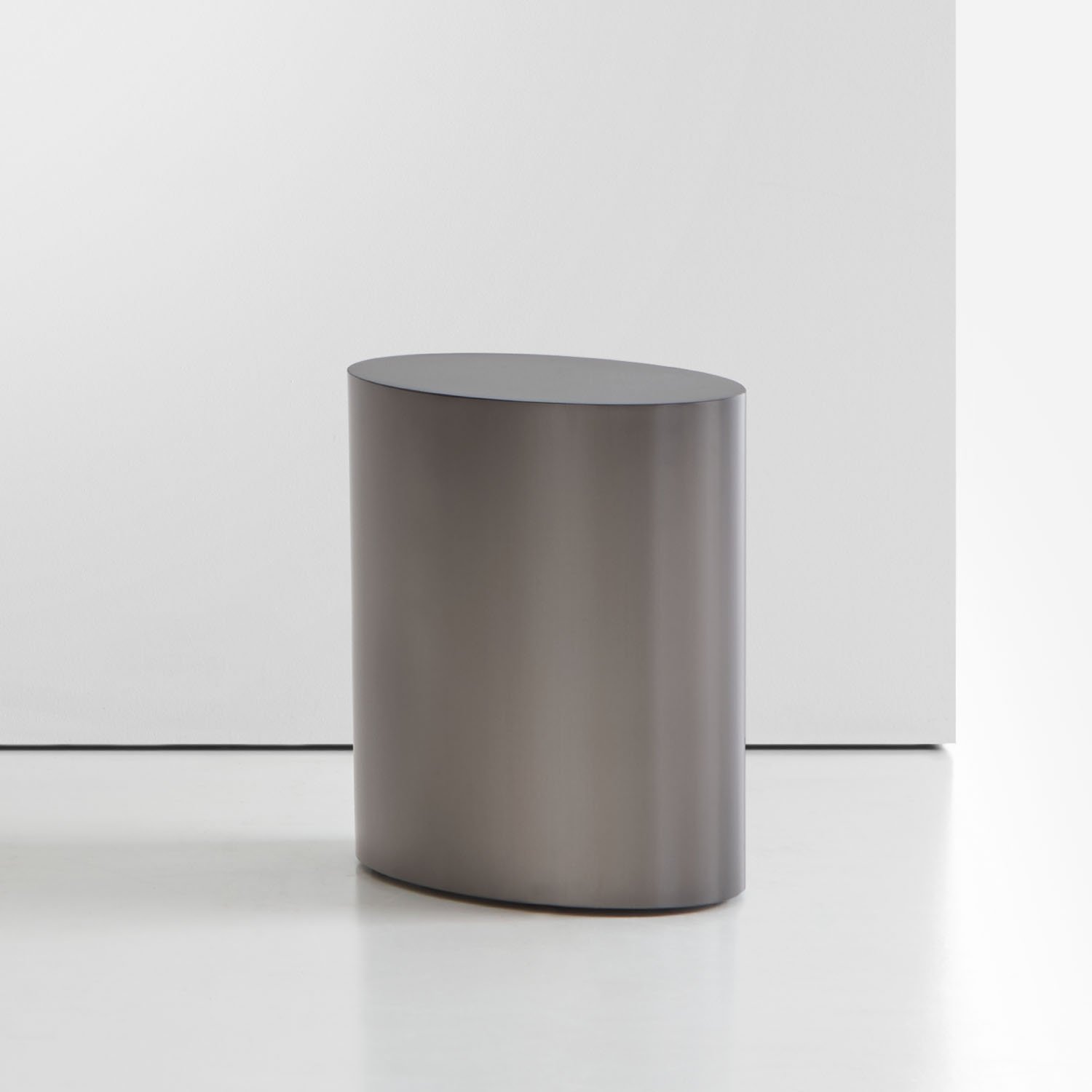 The fully enclosed Marlowe drum tables are available in ash veneer and brushed stainless steel in two finishes: brushed graphite and brushed brass.