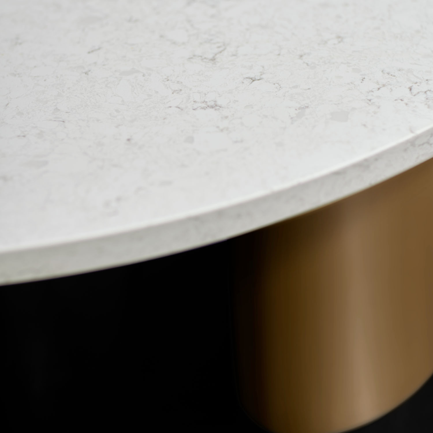 Marlowe coffee table tops are available in ash veneer or white quartz with stainless steel bases in two finishes: brushed graphite and brushed brass.