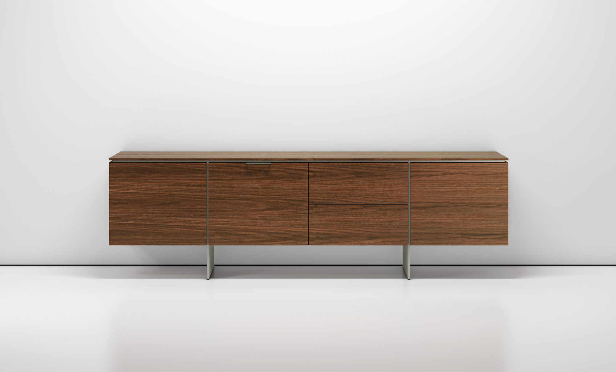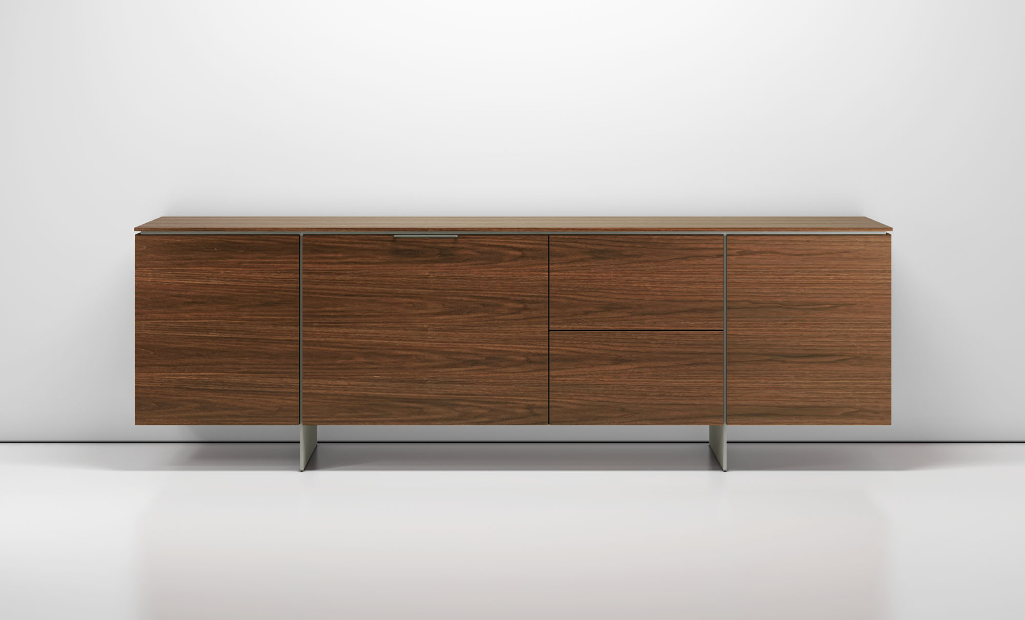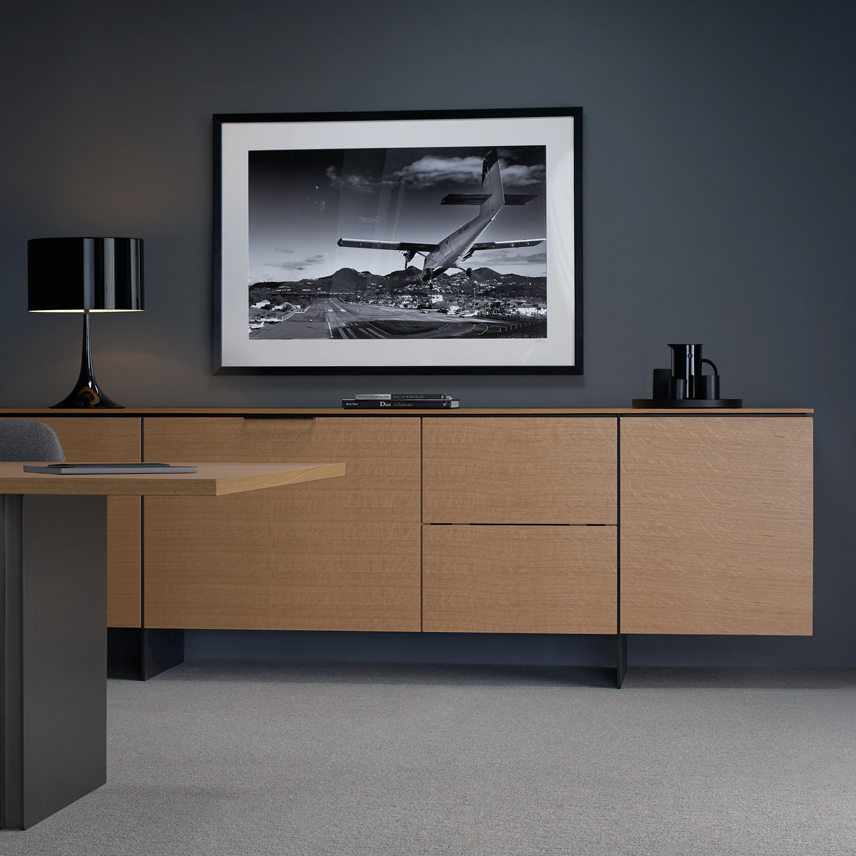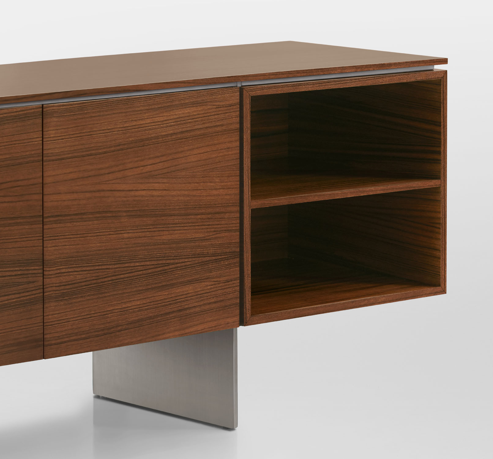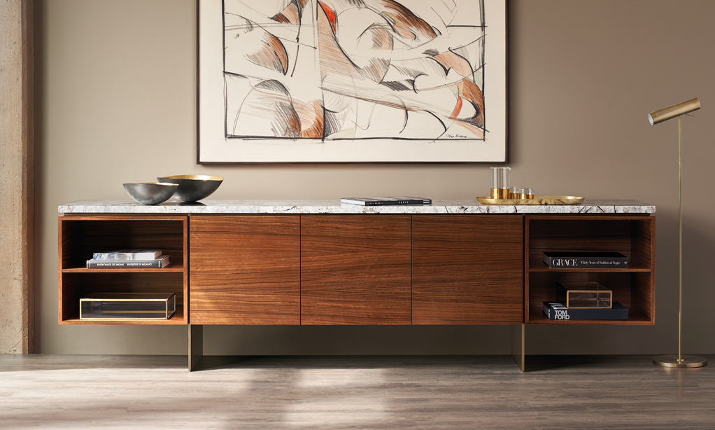 Clean architectural details and a focus on luxe materials allow Matera credenzas to enhance any interior environment. Stainless steel panels allow the credenza to float, creating an attractive aesthetic in open spaces.