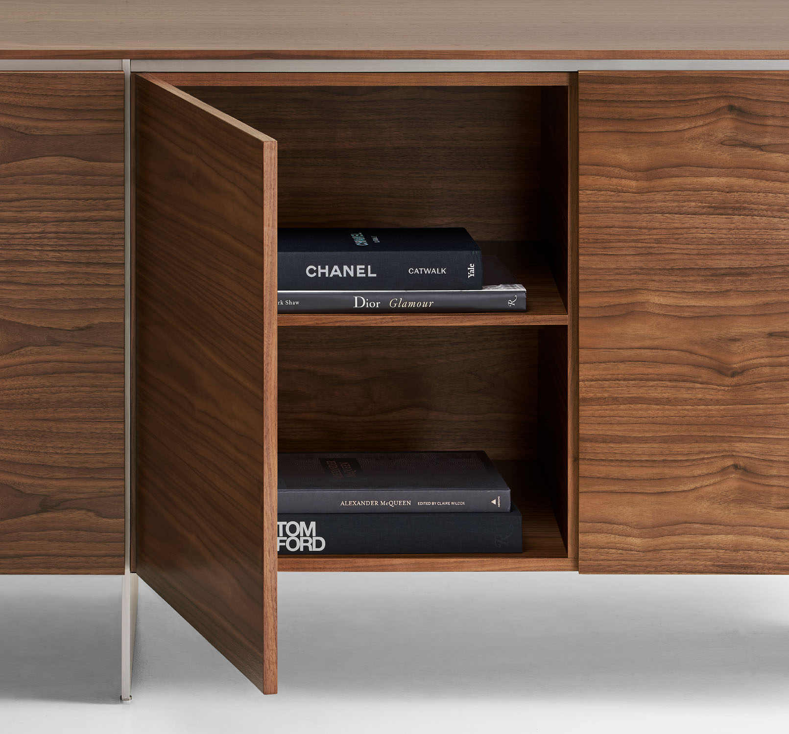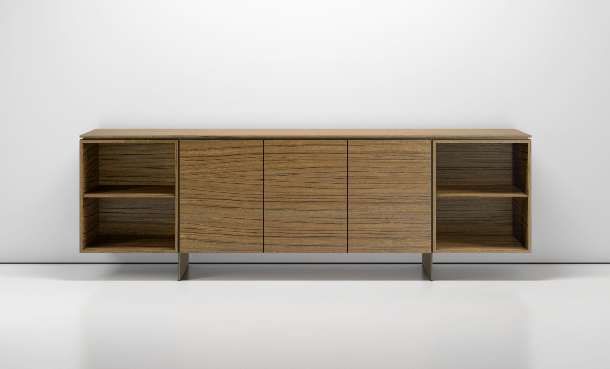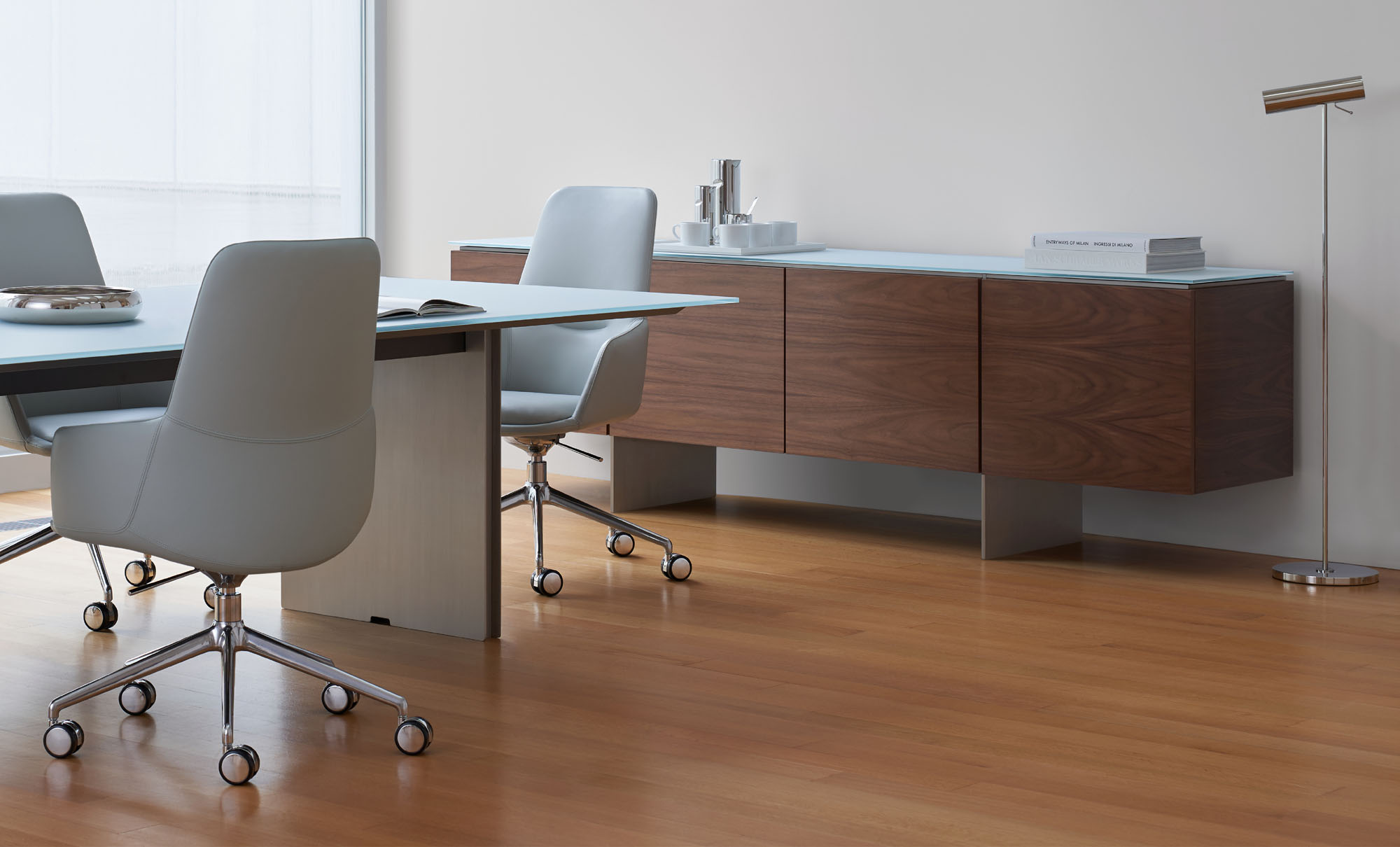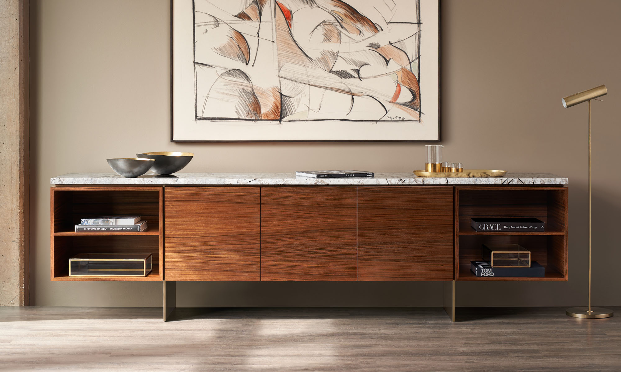 Clean architectural details and a focus on luxe materials allow Matera credenzas to enhance any interior environment. Stainless steel panels allow the credenza to float, creating an attractive aesthetic in open spaces.