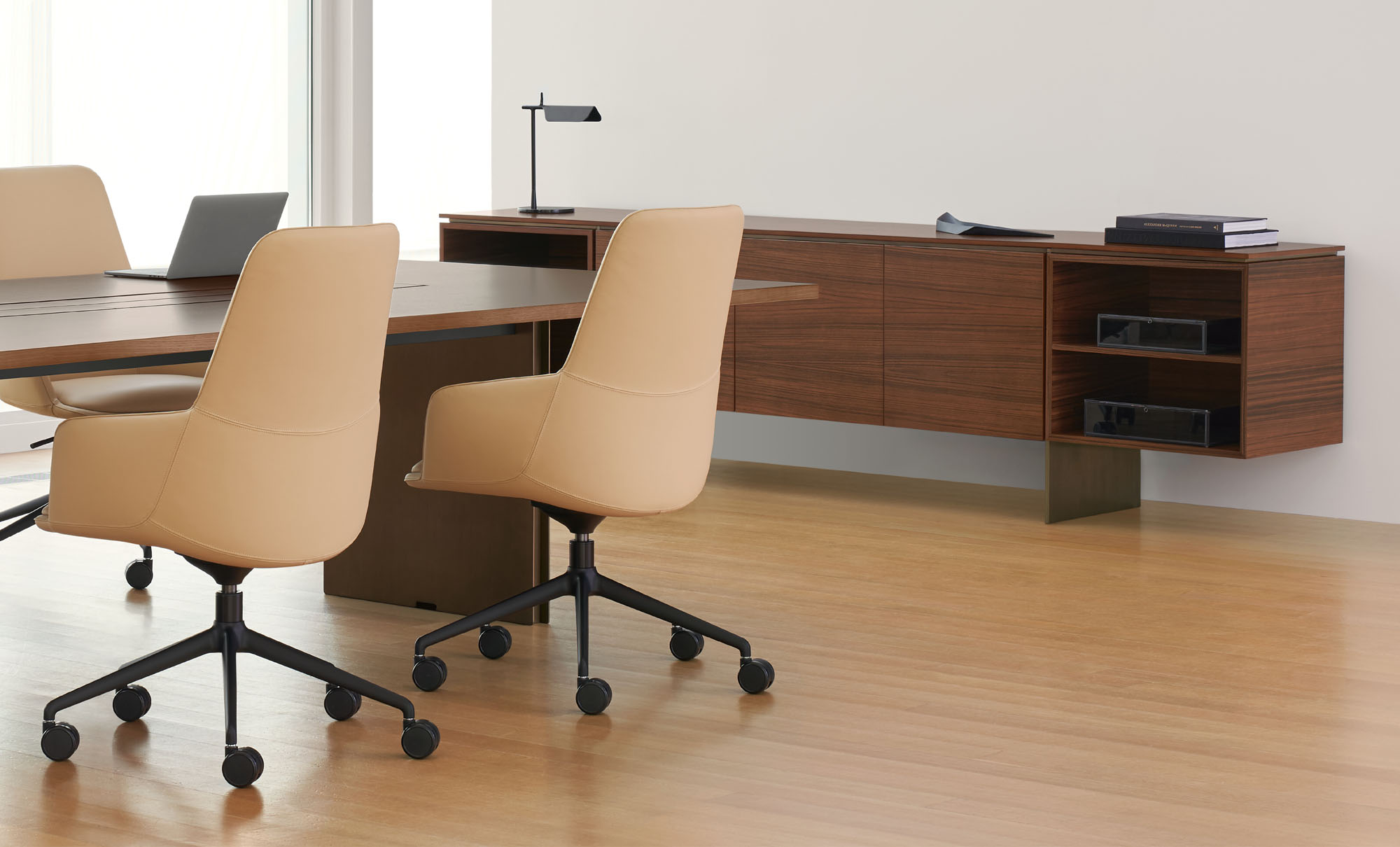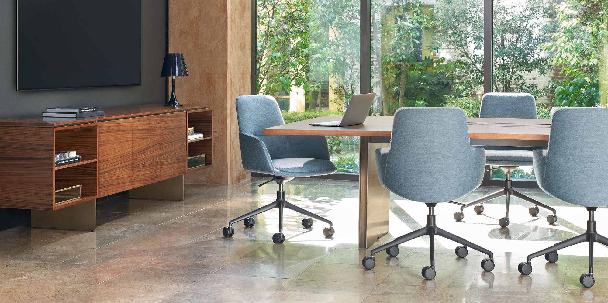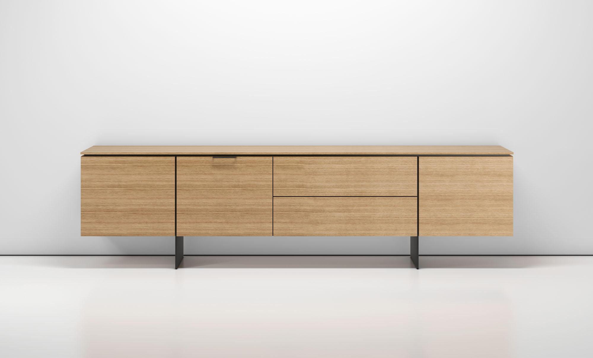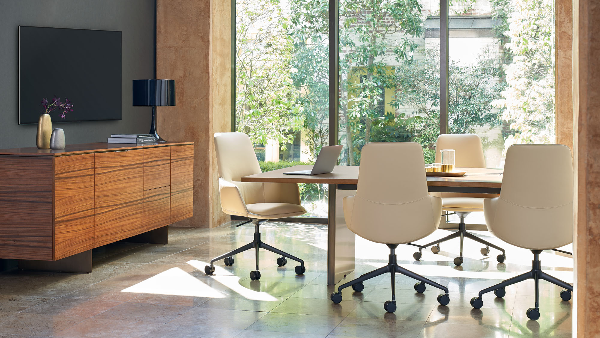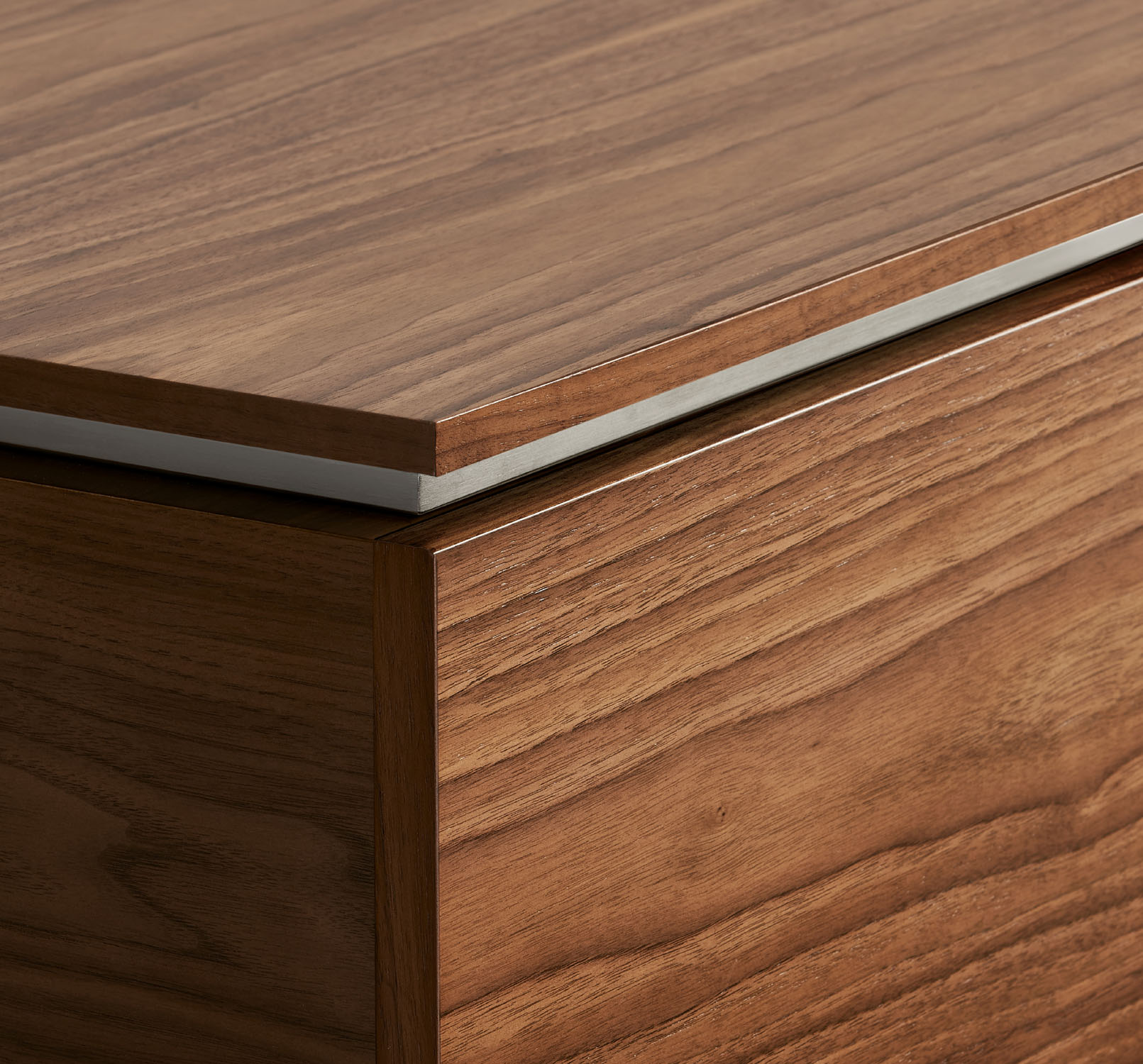 Clean architectural details and a focus on luxe materials allow Matera credenzas to enhance any interior environment. Stainless steel panels allow the credenza to float, creating an attractive aesthetic in open spaces.