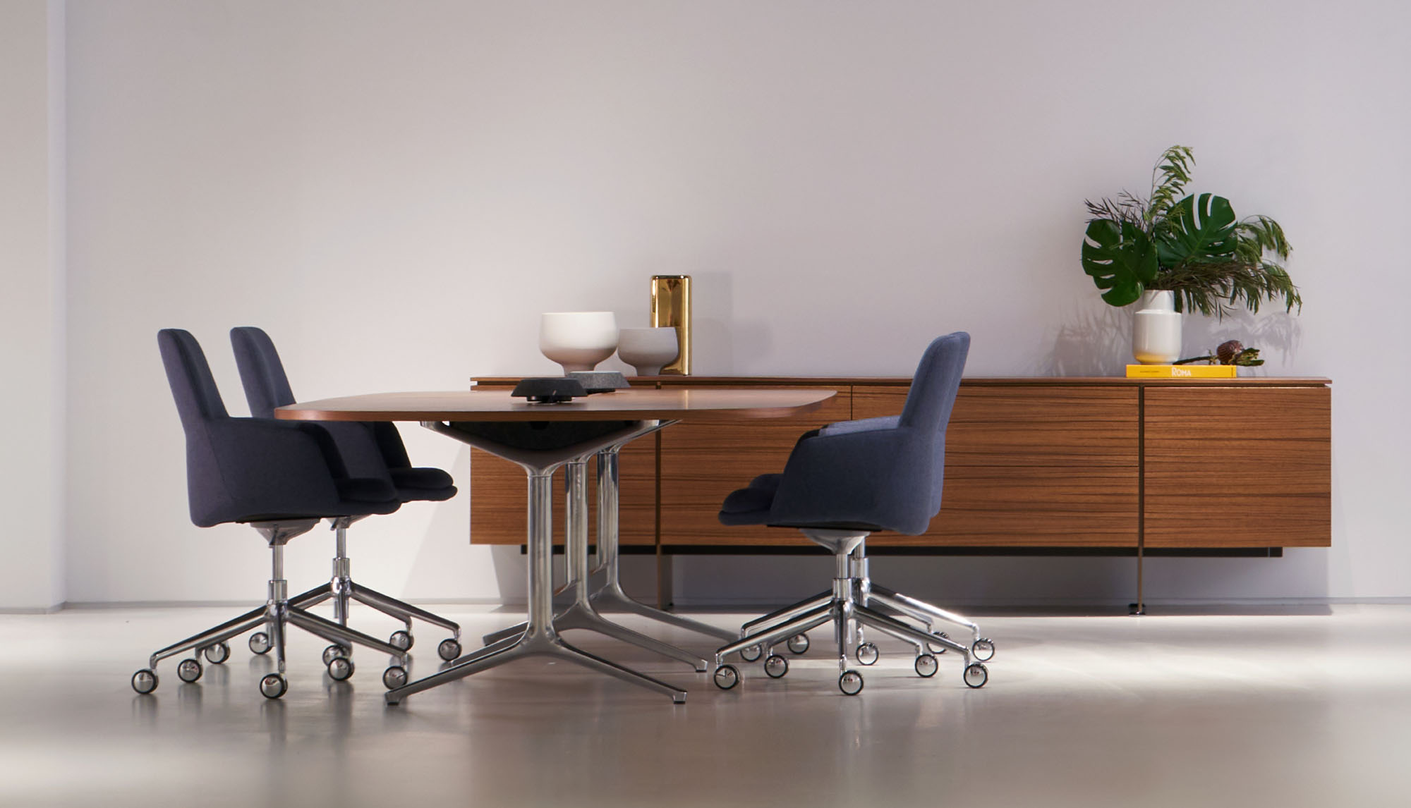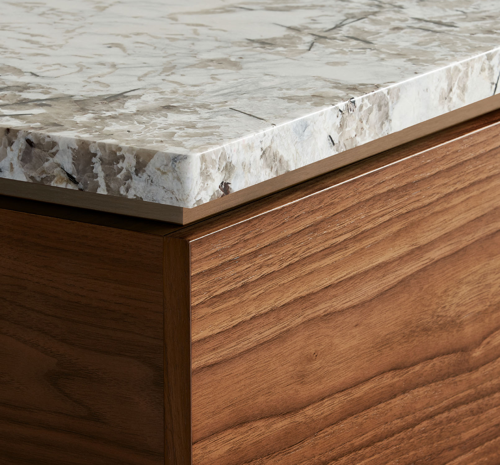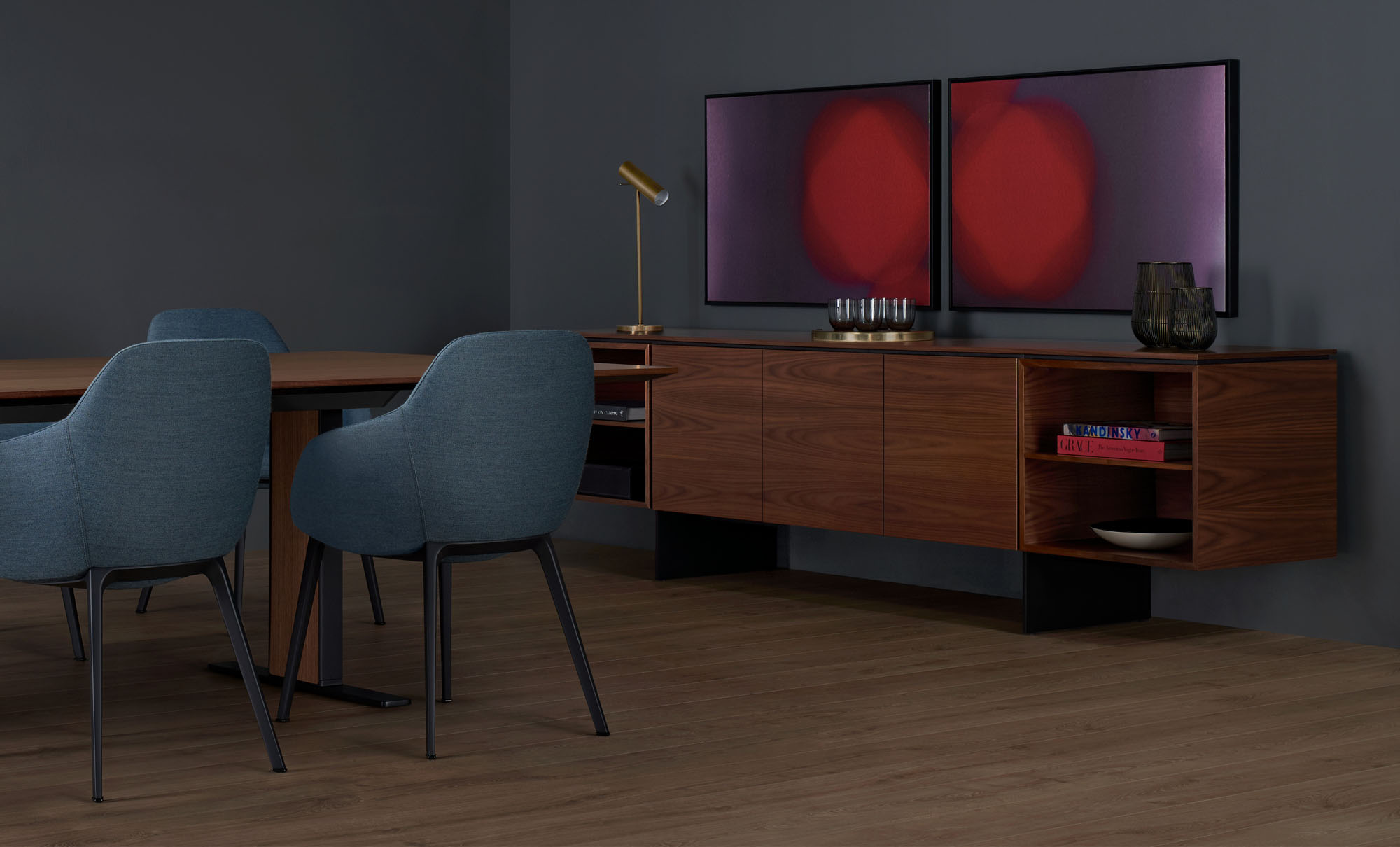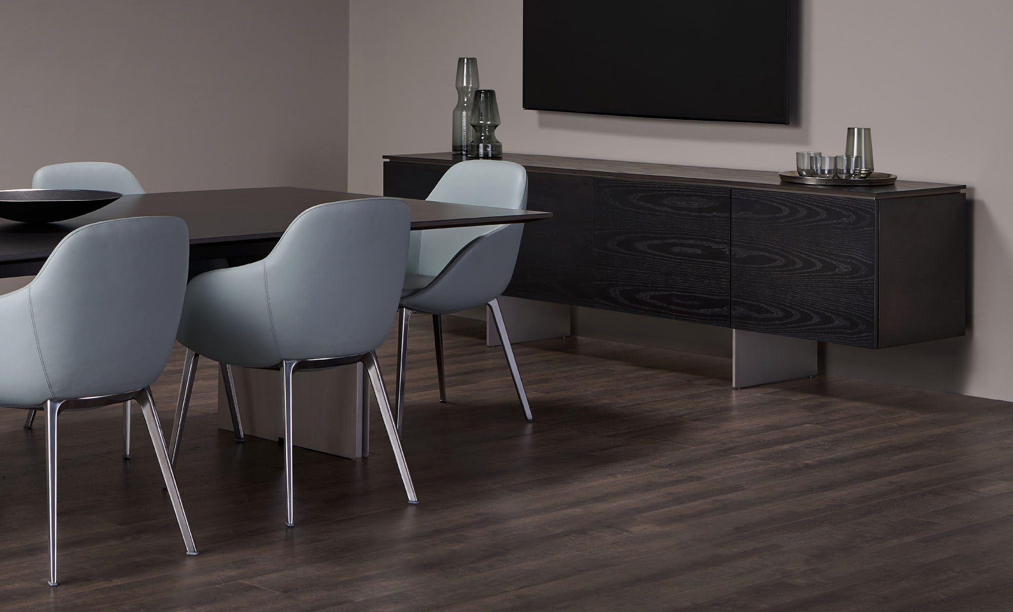 Clean architectural details and a focus on luxe materials allow Matera credenzas to enhance any interior environment. Stainless steel panels allow the credenza to float, creating an attractive aesthetic in open spaces.