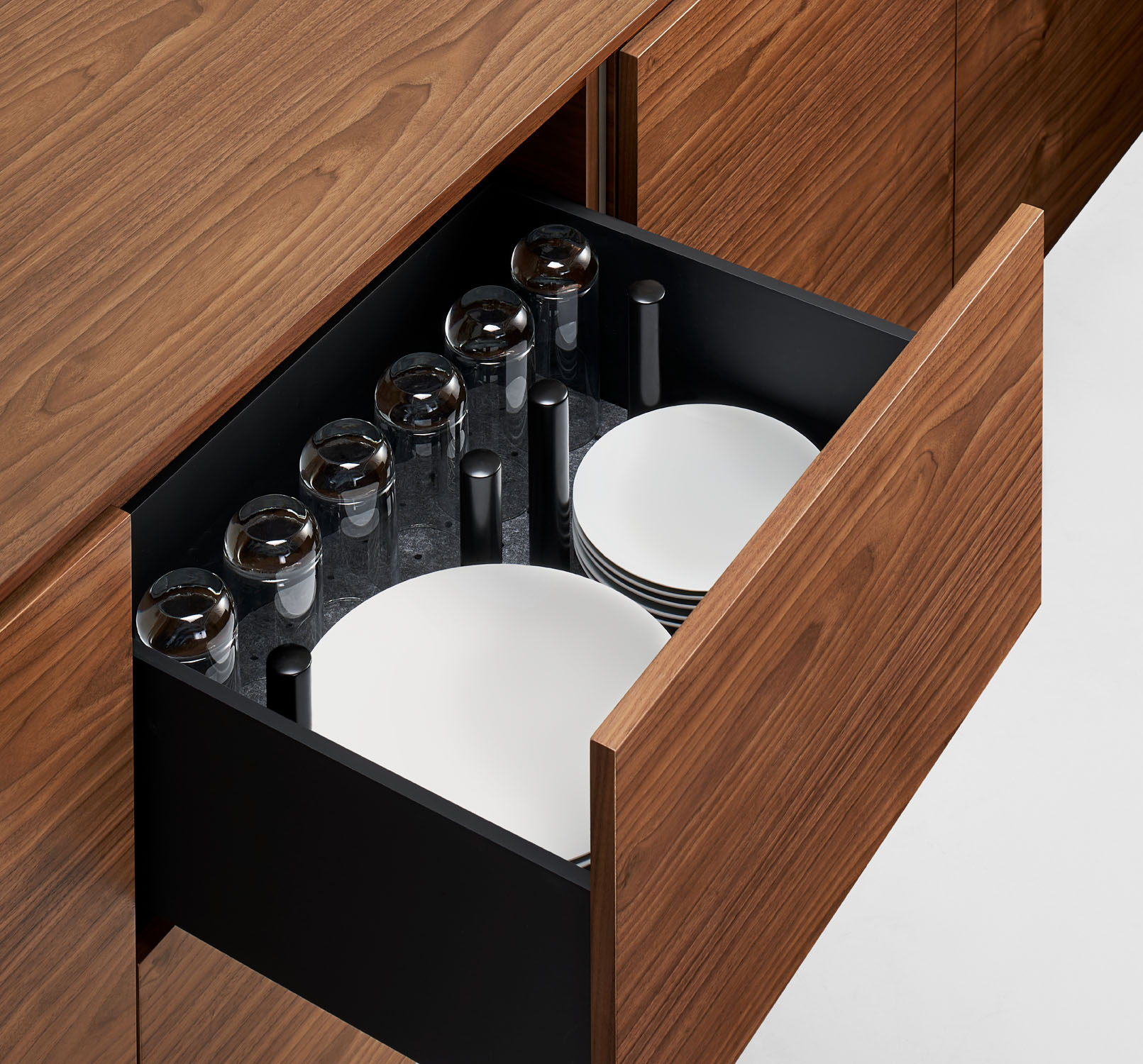 Units can be specified with open shelving, functional storage, and soft close storage drawers that provide tableware organization.
