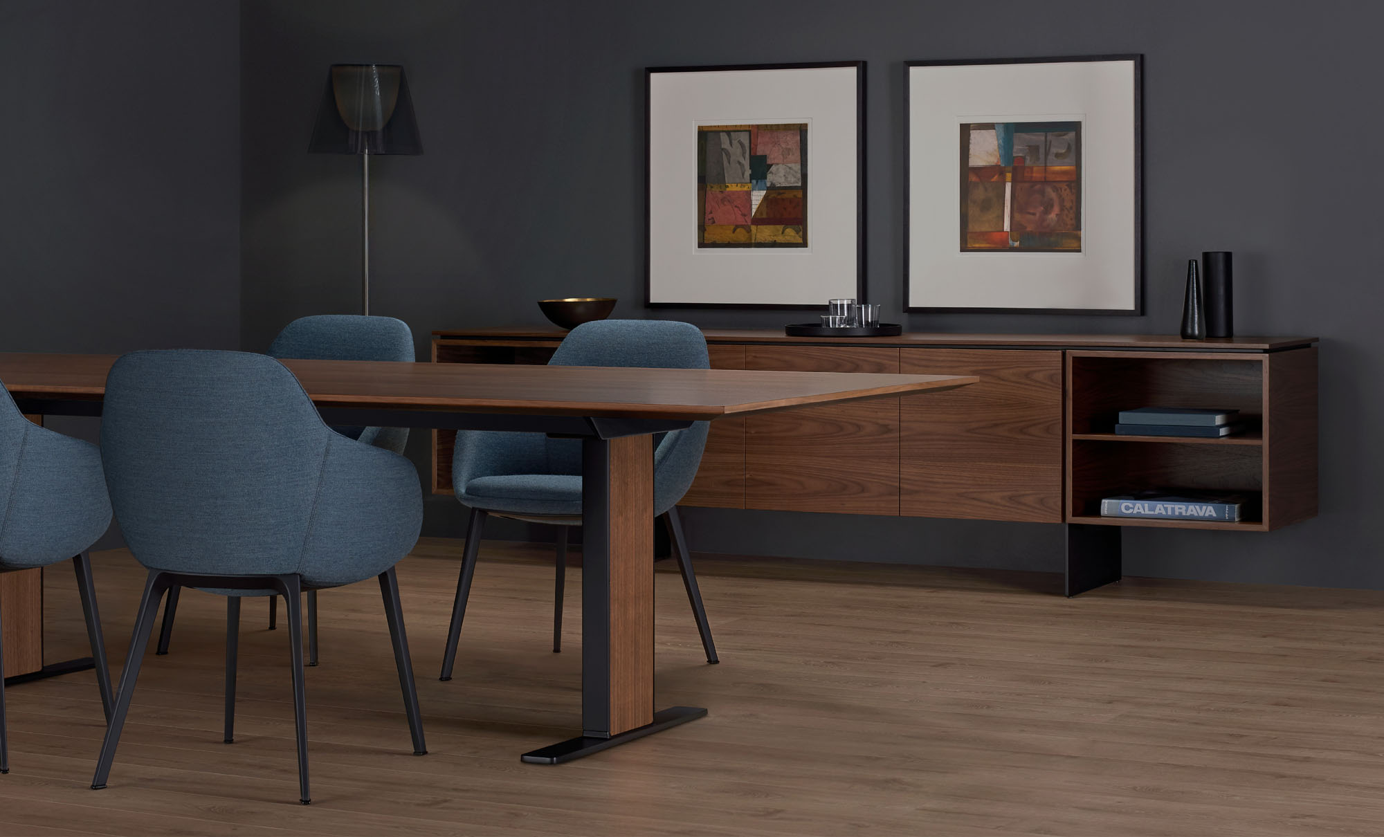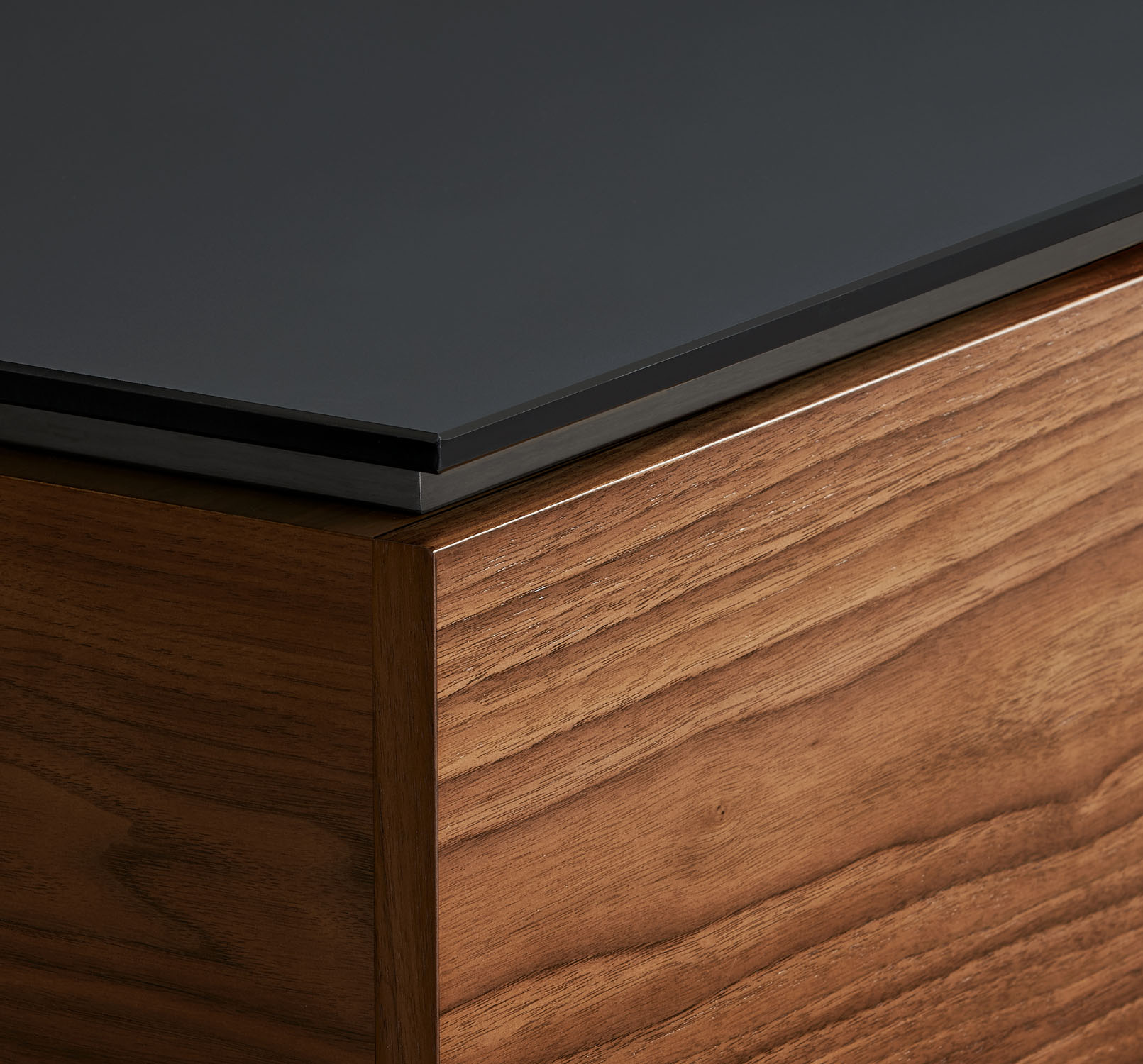 Matera credenzas range in size from 72” to 108” in length and are offered standard or serving height. Tops are featured in veneer, etched back-painted glass, solid surface, and COM.