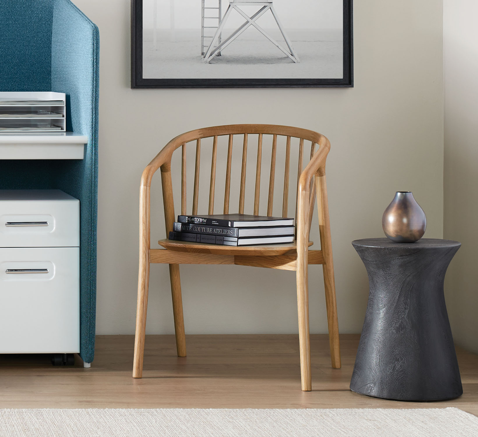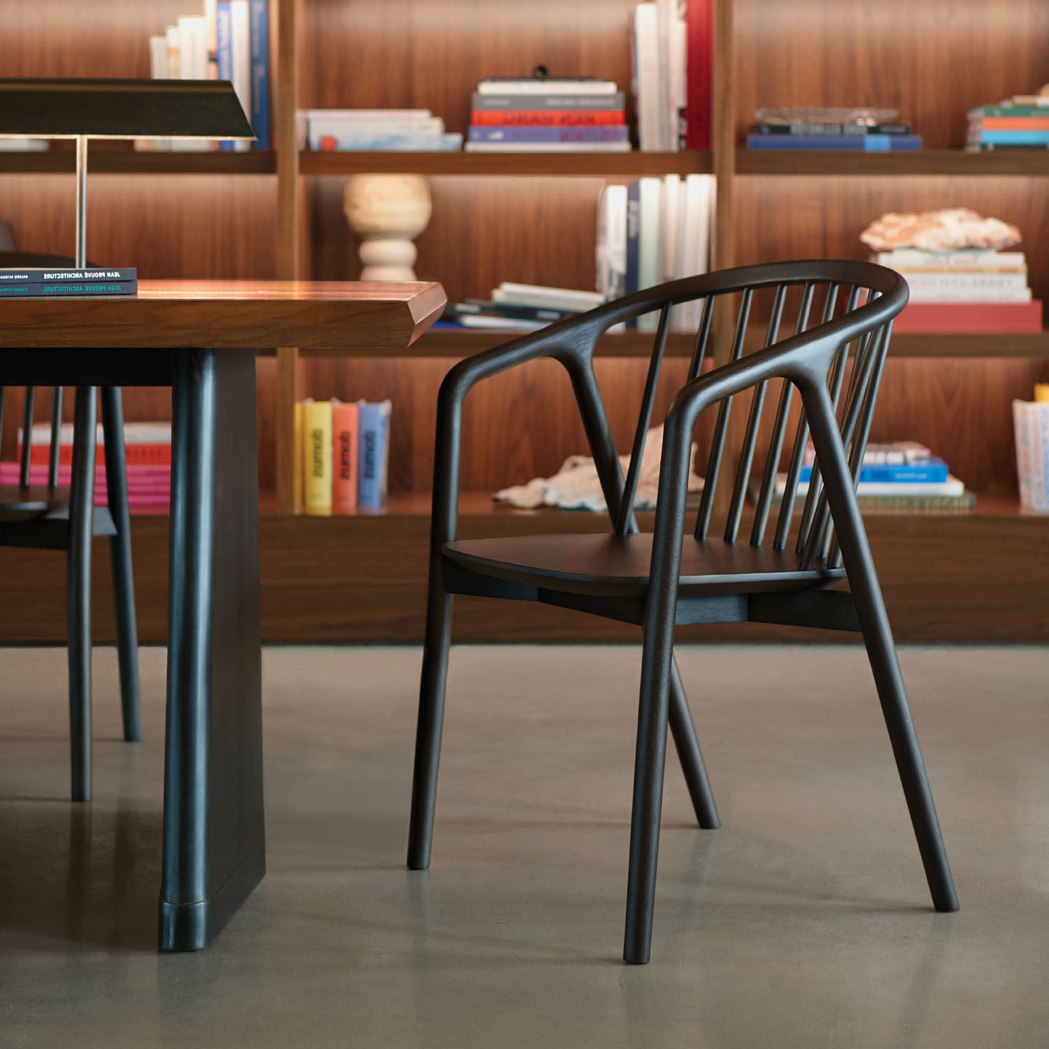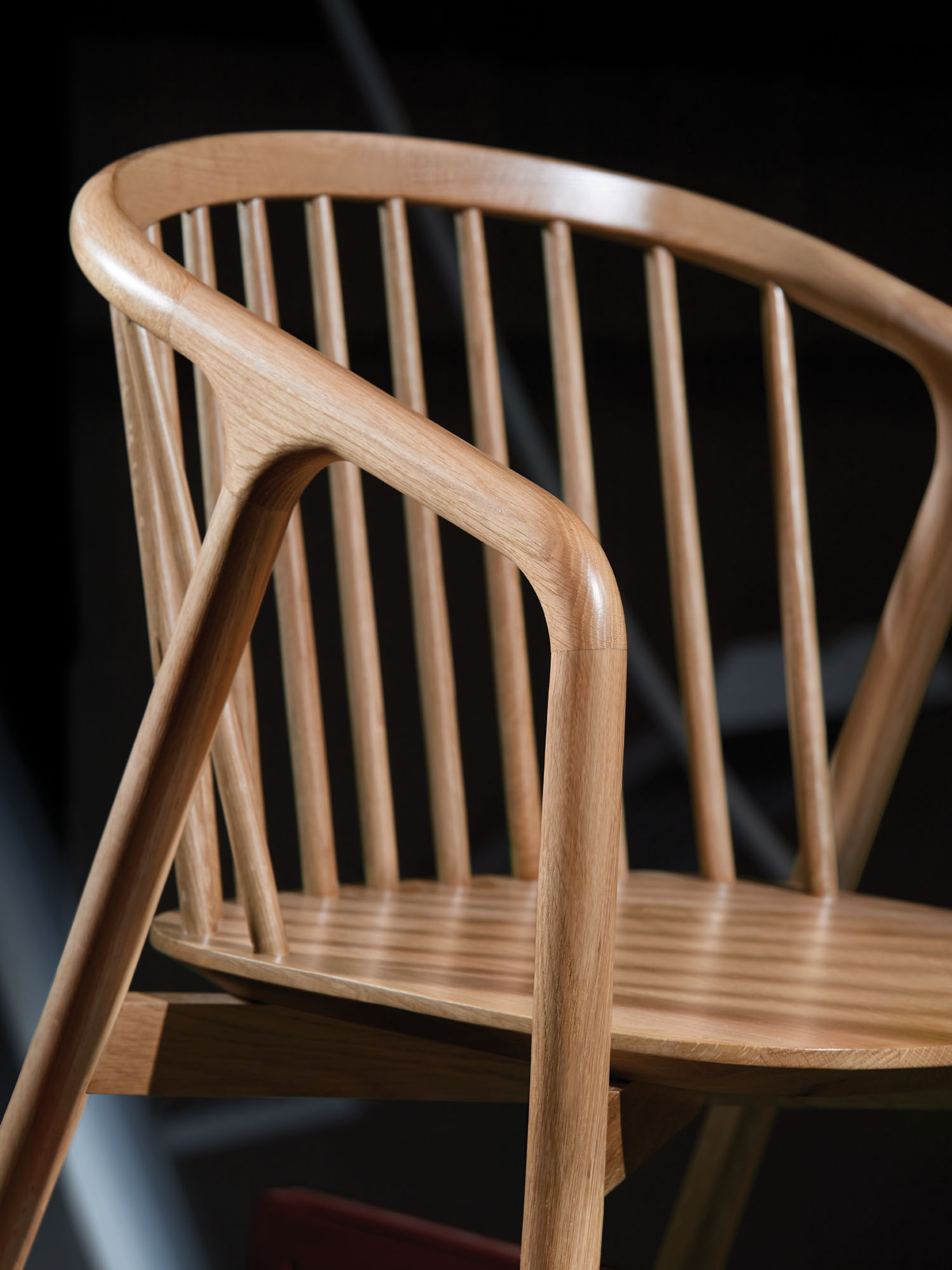 Matinee is a modern interpretation of the iconic 17th century Windsor chair. Like its admired predecessor, the chair has stayed true to form as a multi-functional chair capable of enriching any space. This modern version of the spindle-back chair features a continuous loop of solid oak whose back gently curves down, creating arms and ultimately the front legs.