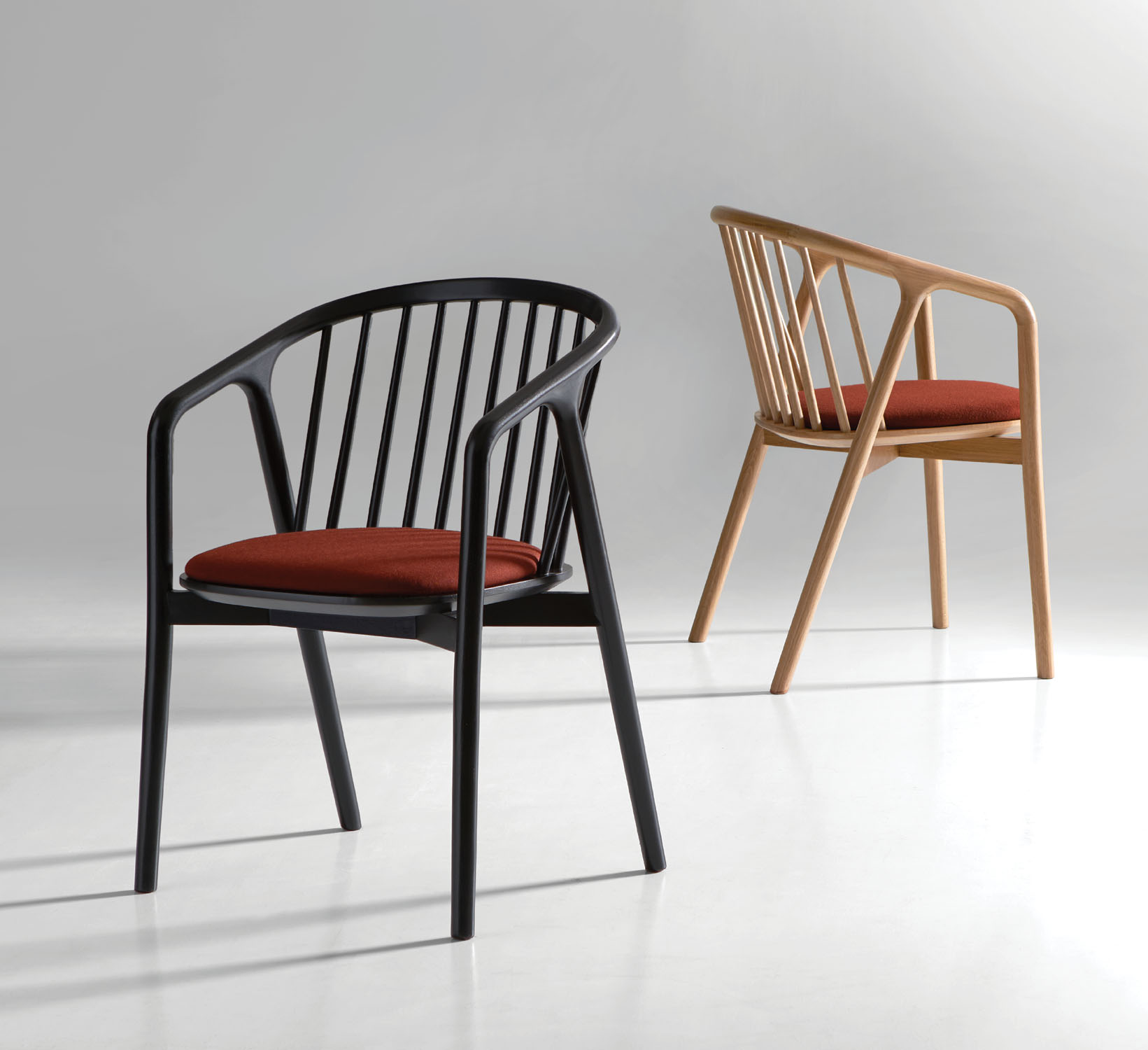 The chair takes on a more contemporary aesthetic when specified with dynamic wood finishes and seat fabrics.