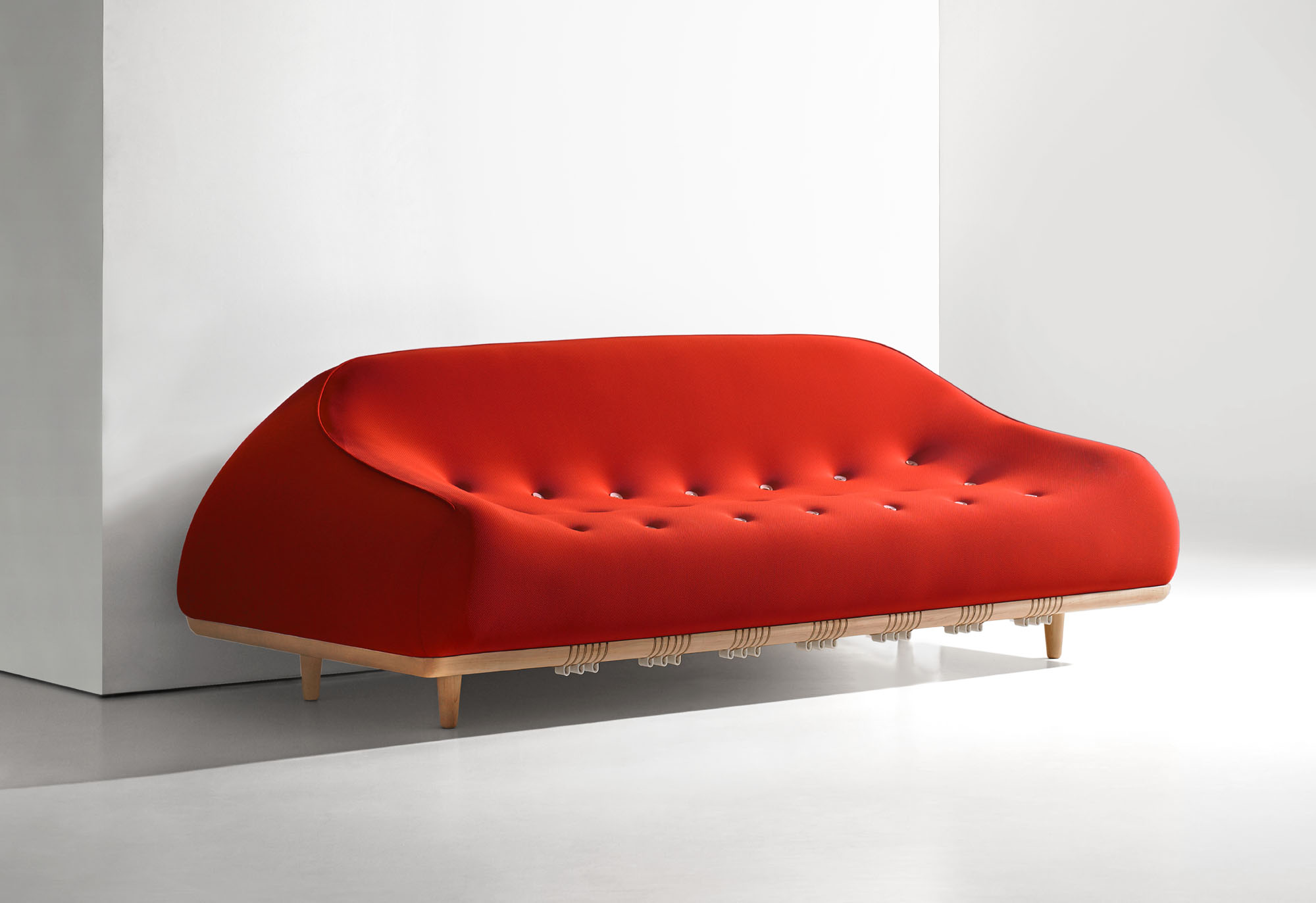The sofa rests on a minimal frame crafted in natural or black-finished solid maple.