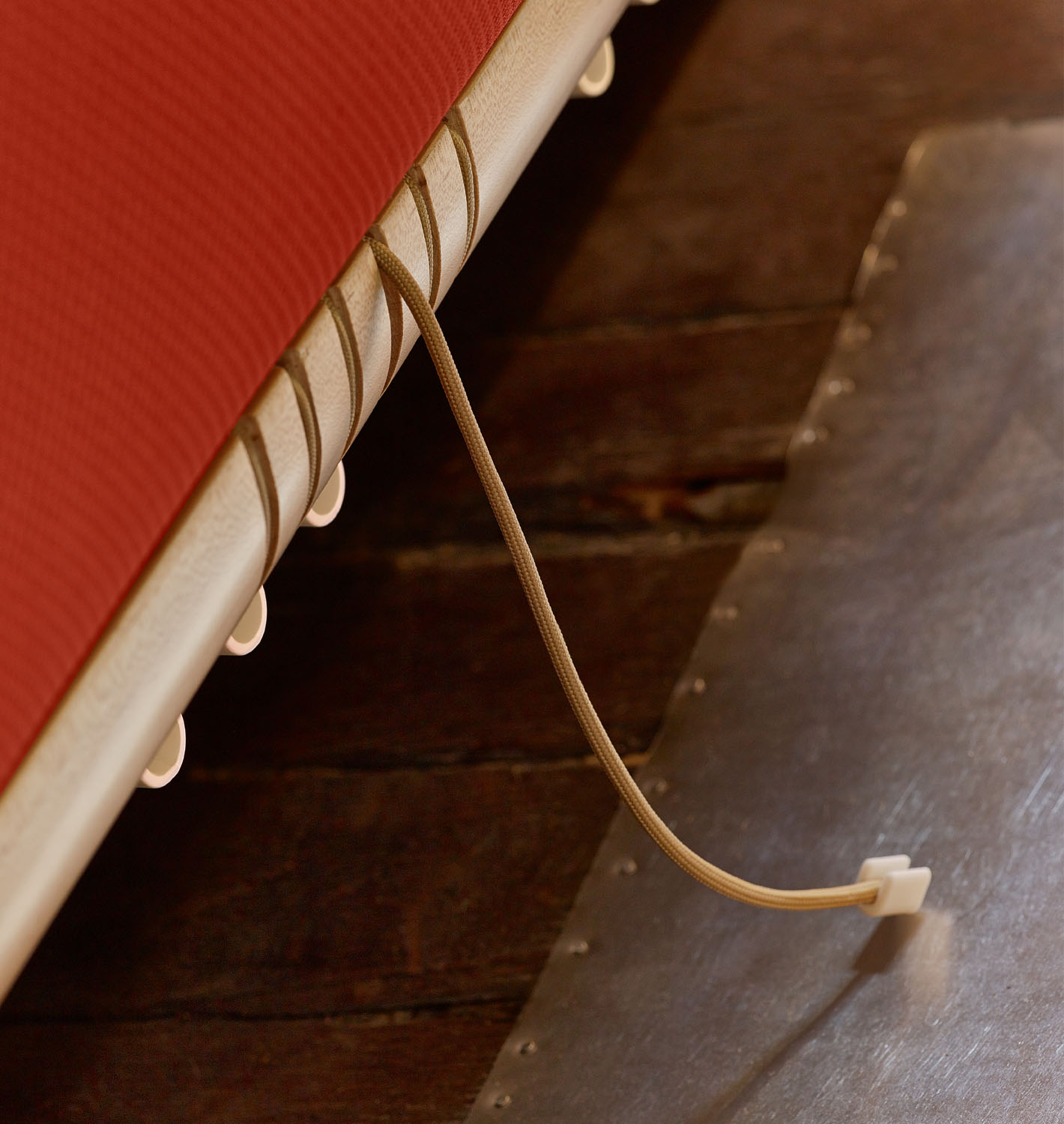 Mellow is available in four finish/fabric options. The color of the tension cords, buttons, and locking cleats match the base color.