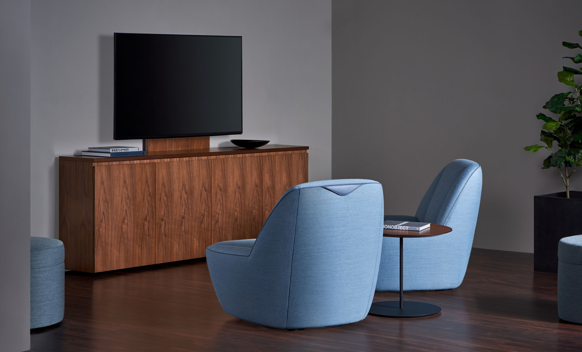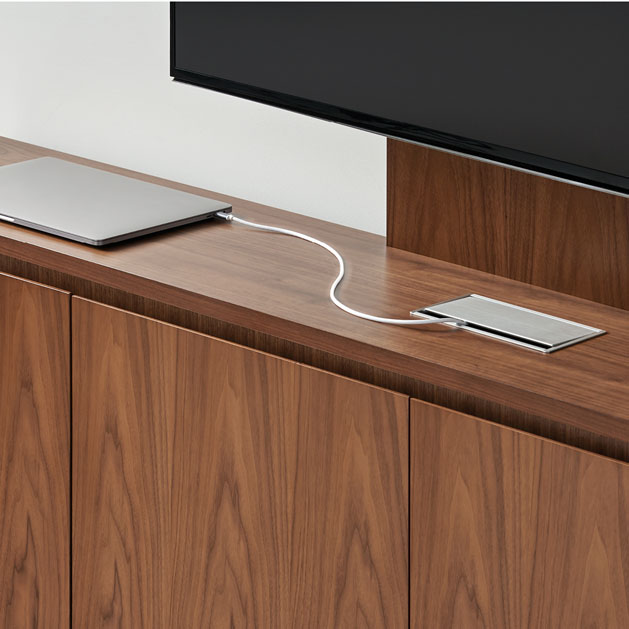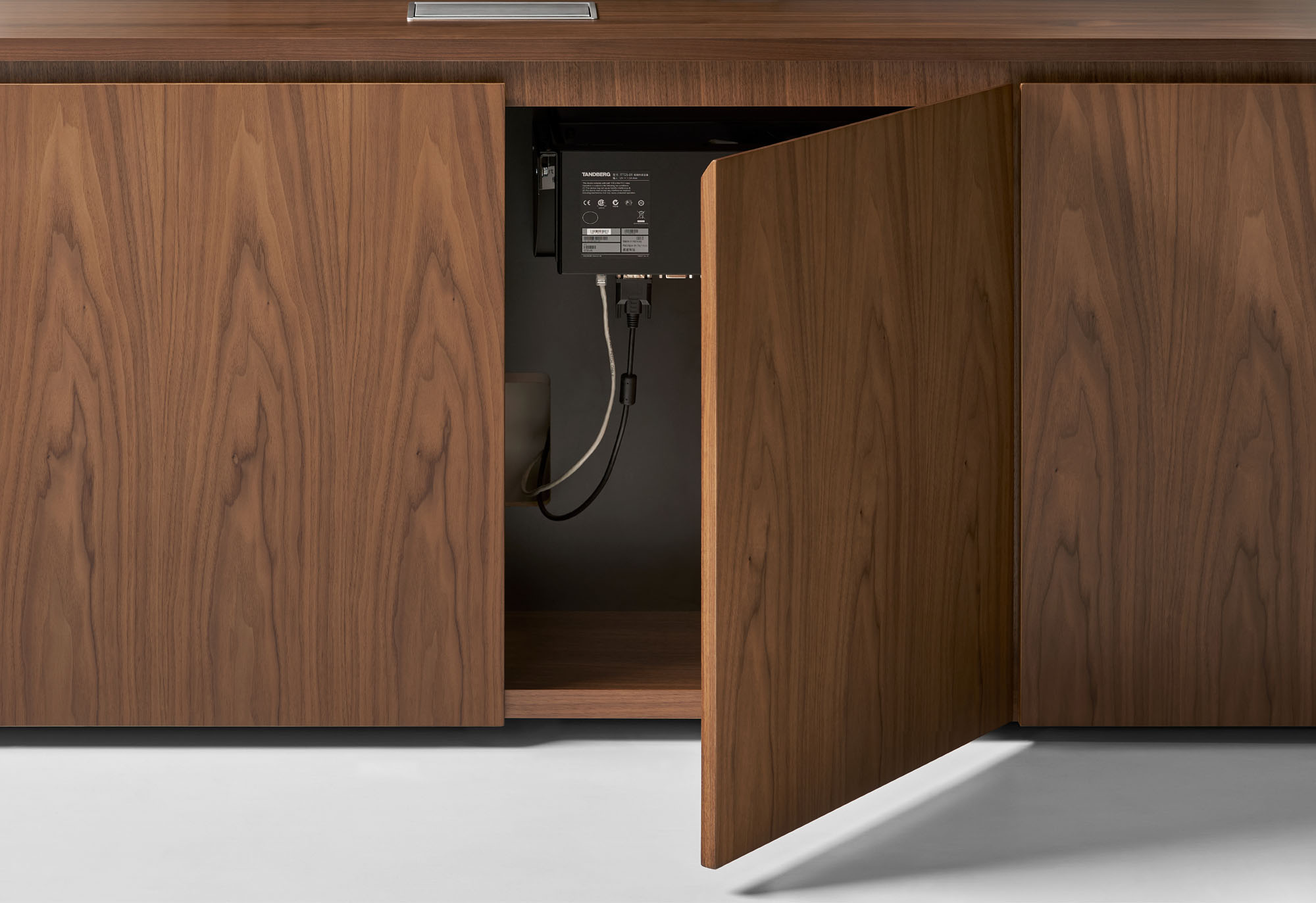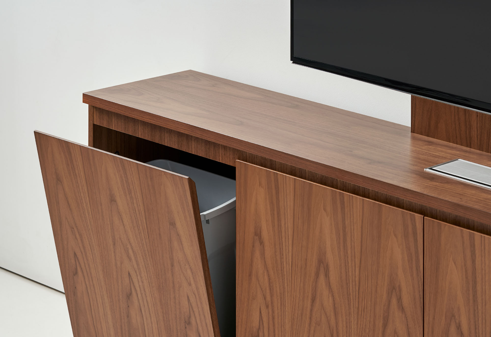 Despite the small footprint, Profile credenzas are designed to easily accommodate audiovisual needs, trash, and general storage.