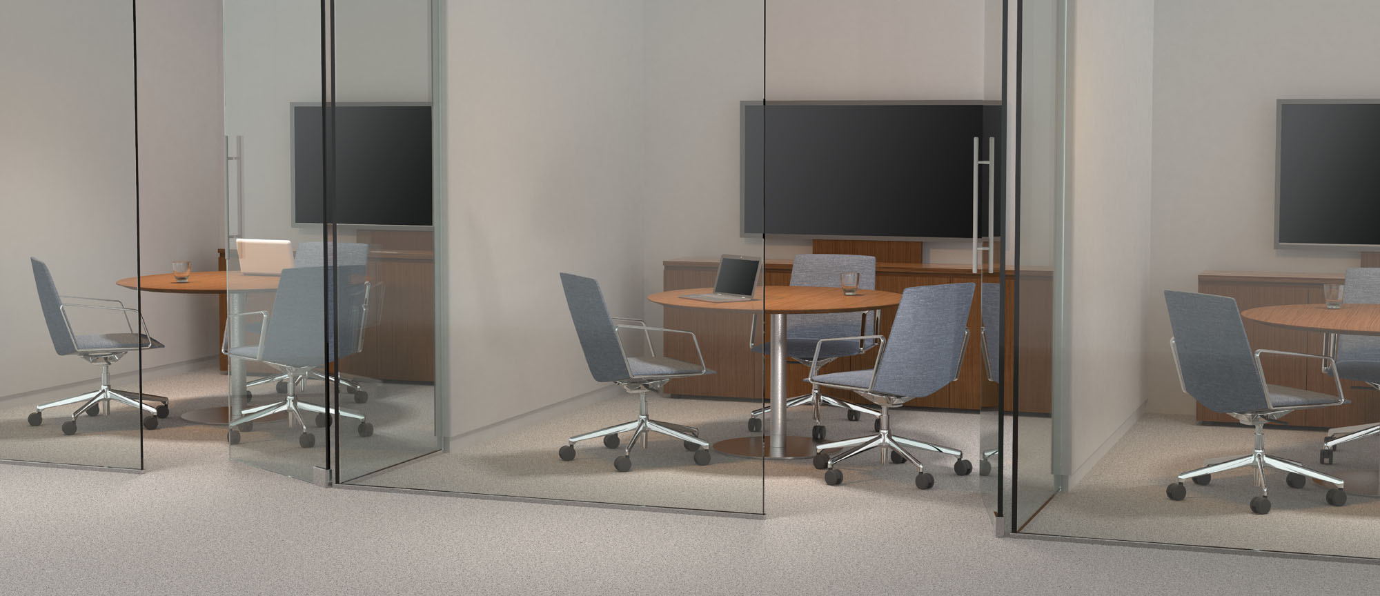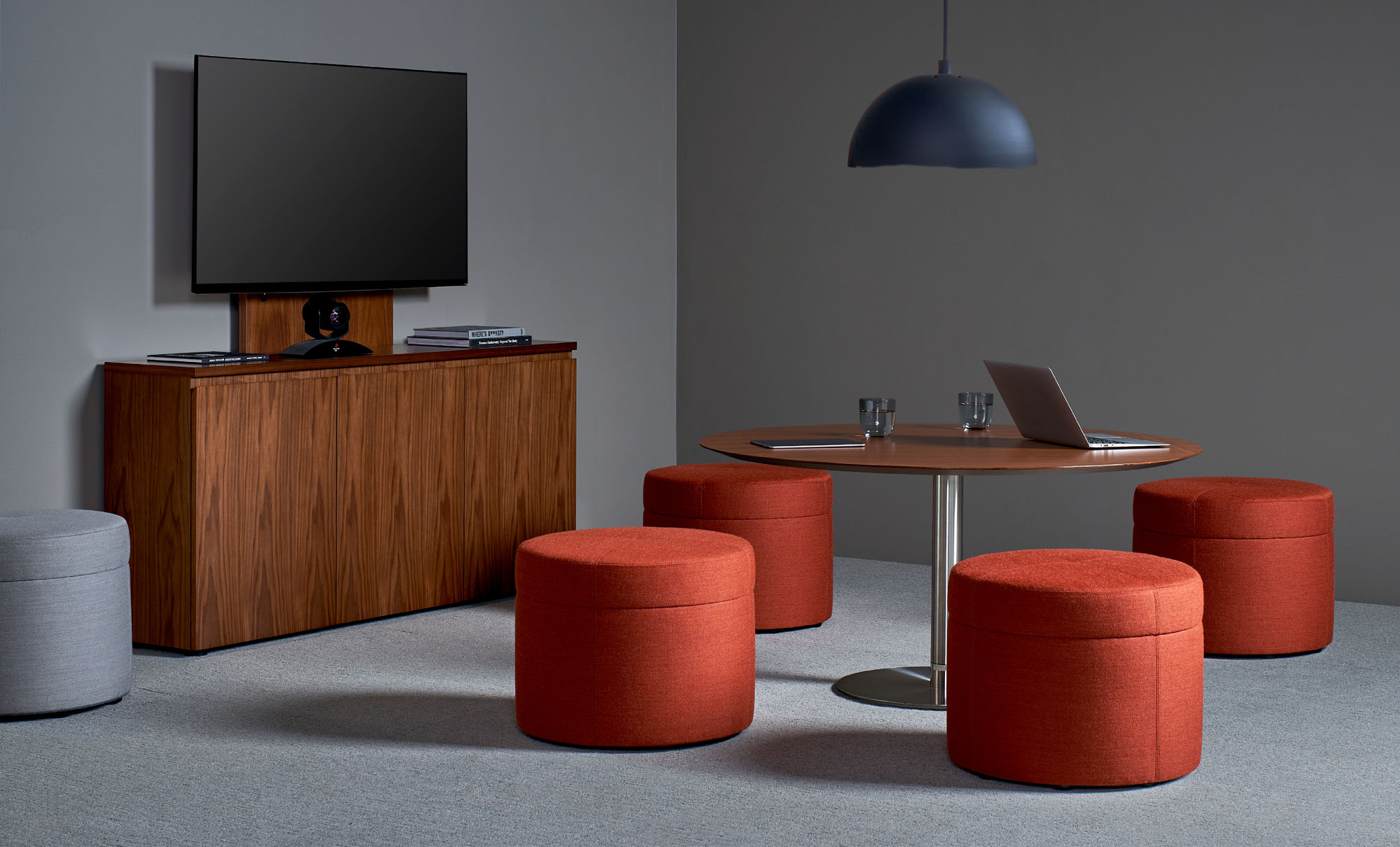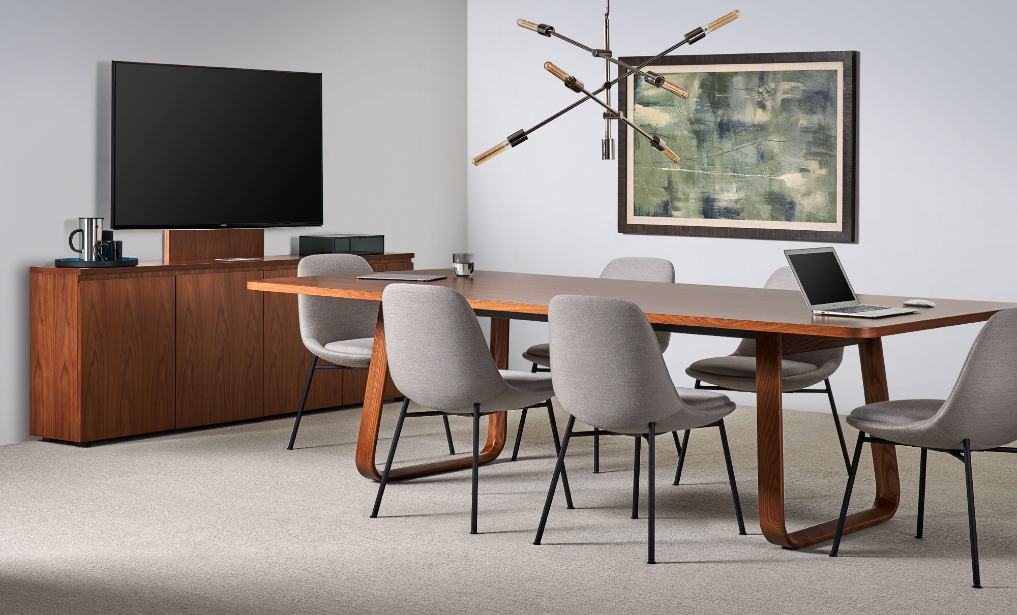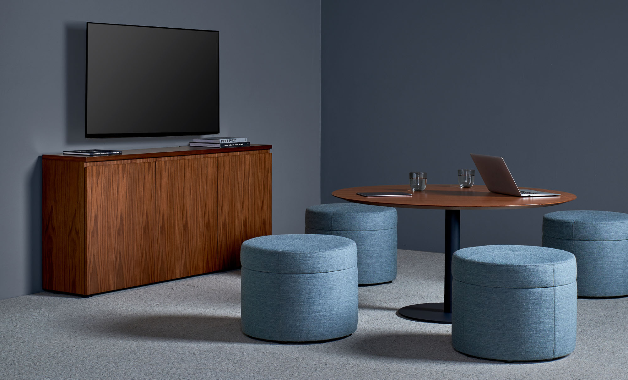Despite the small footprint, Profile credenzas are designed to easily accommodate audiovisual needs, trash, and general storage.