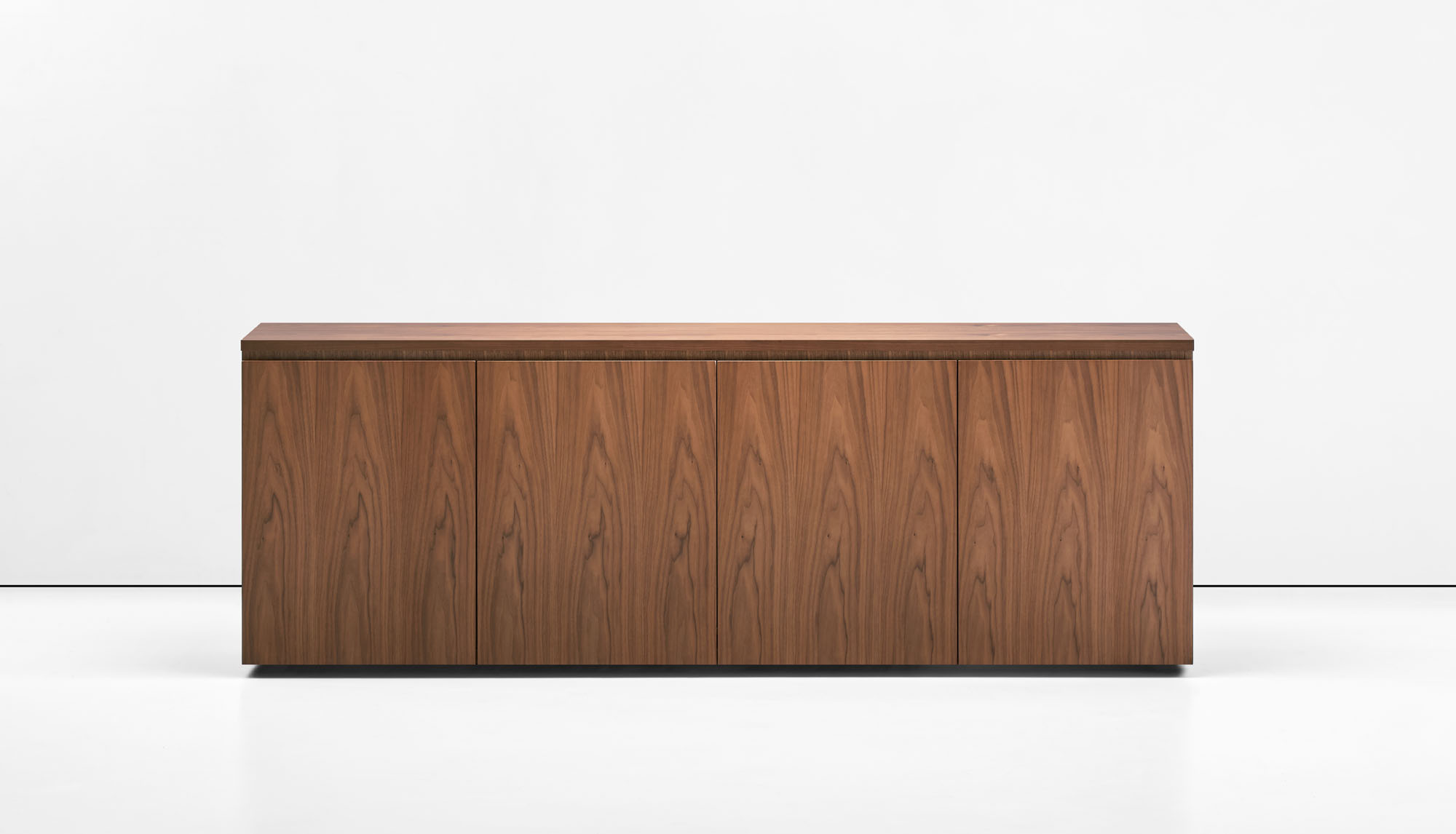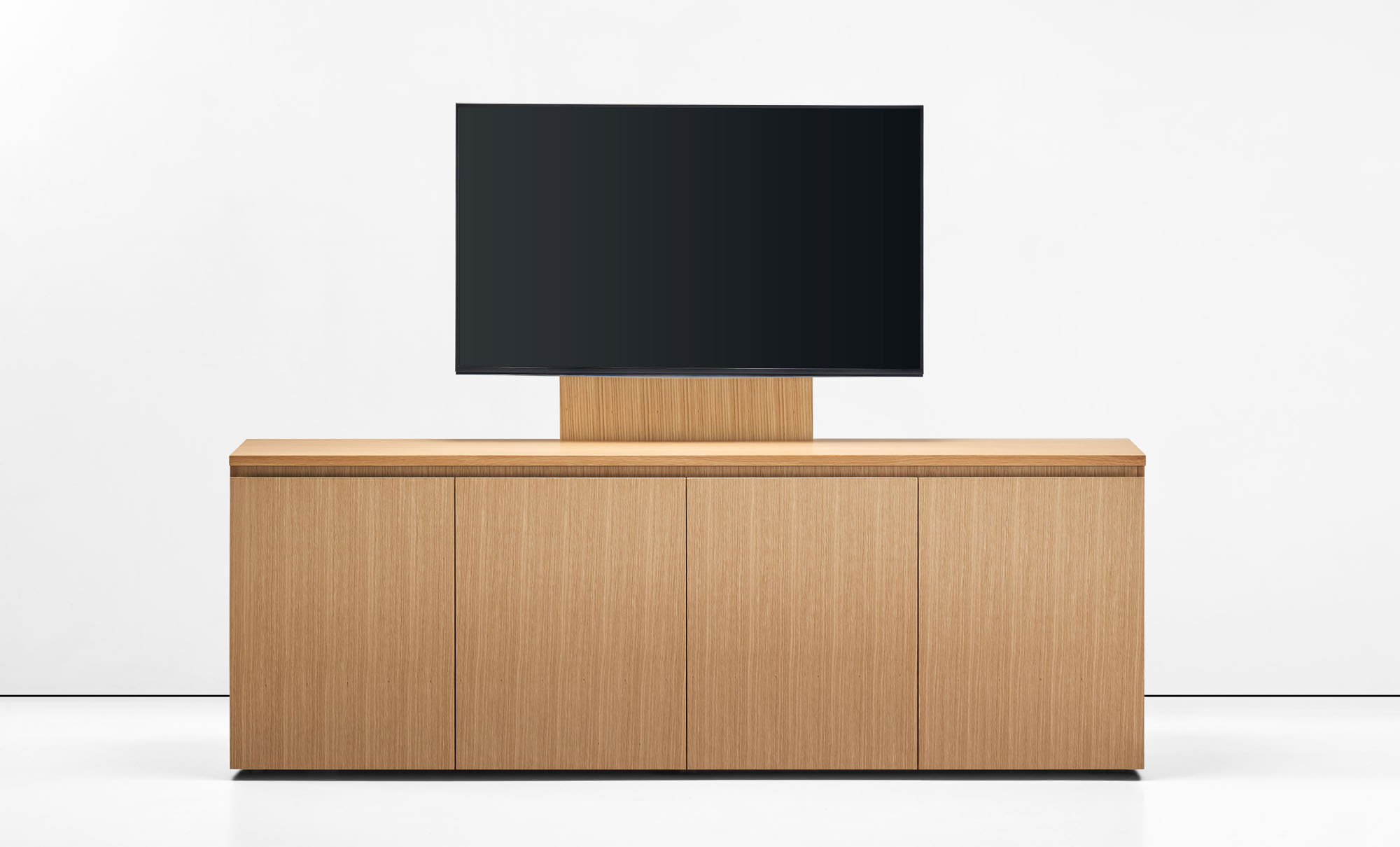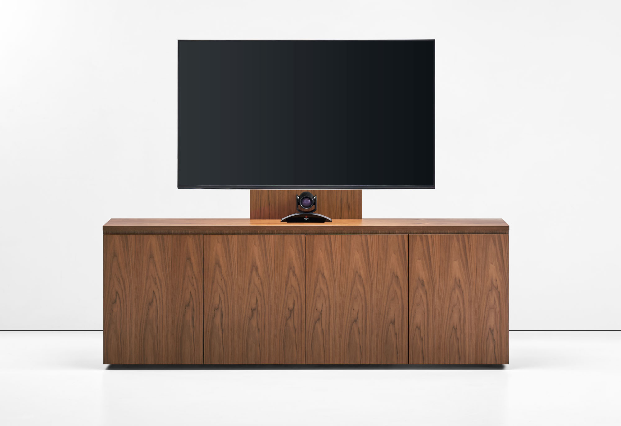Available in three widths, Profile credenzas are featured in oak and walnut. Profile credenzas can be specified as standalone units or with pillars, allowing monitors to be mounted at any height.